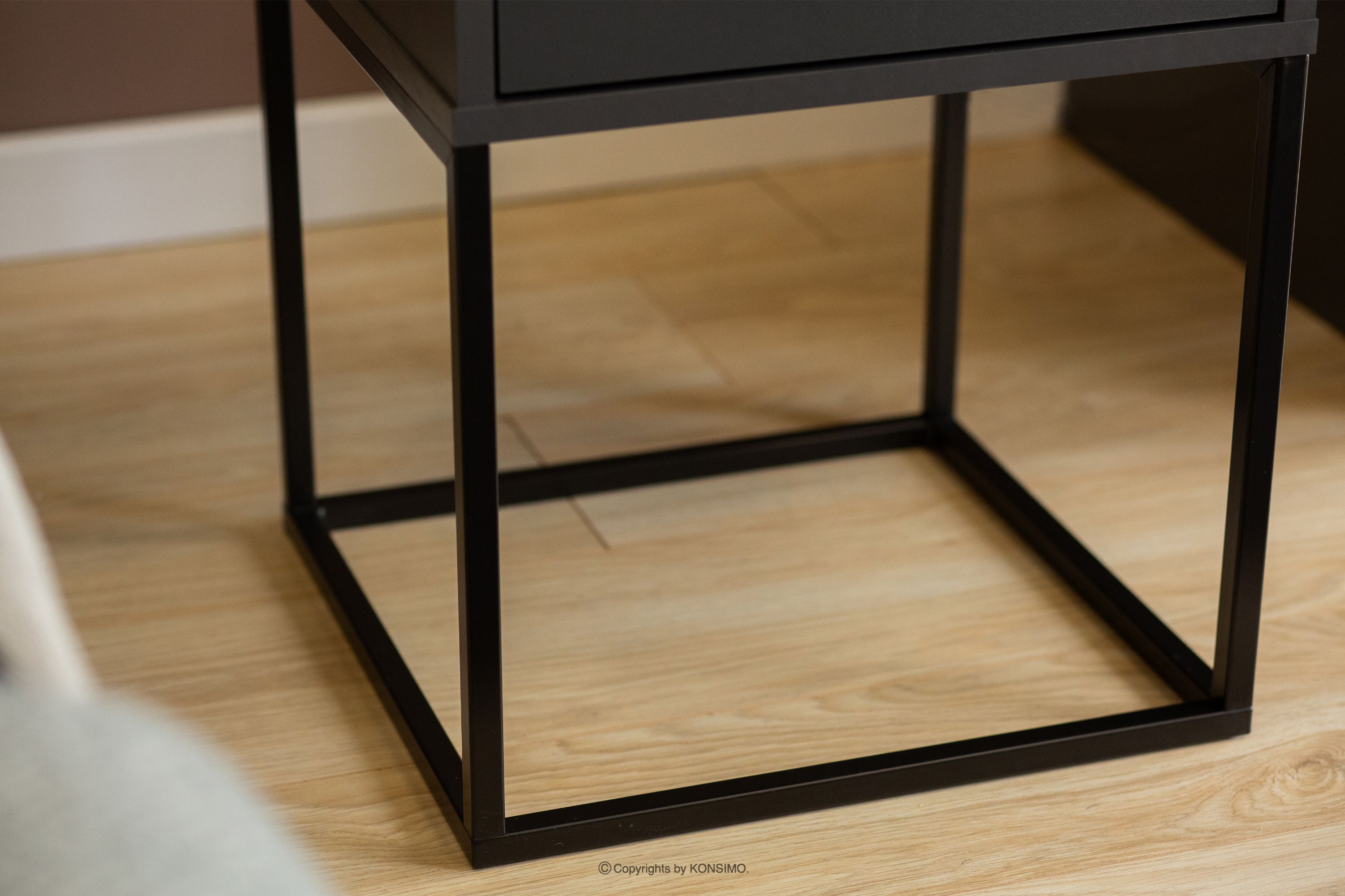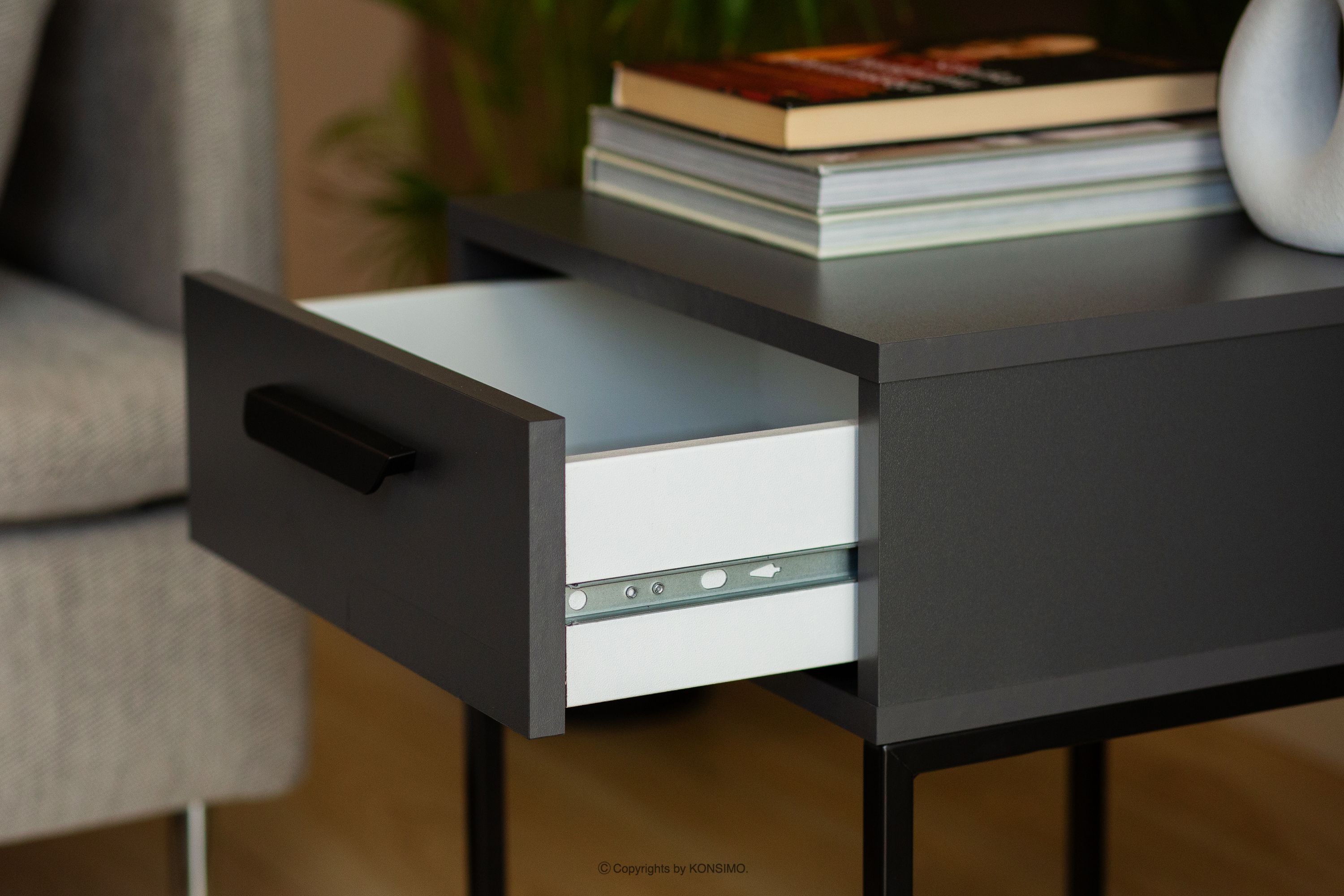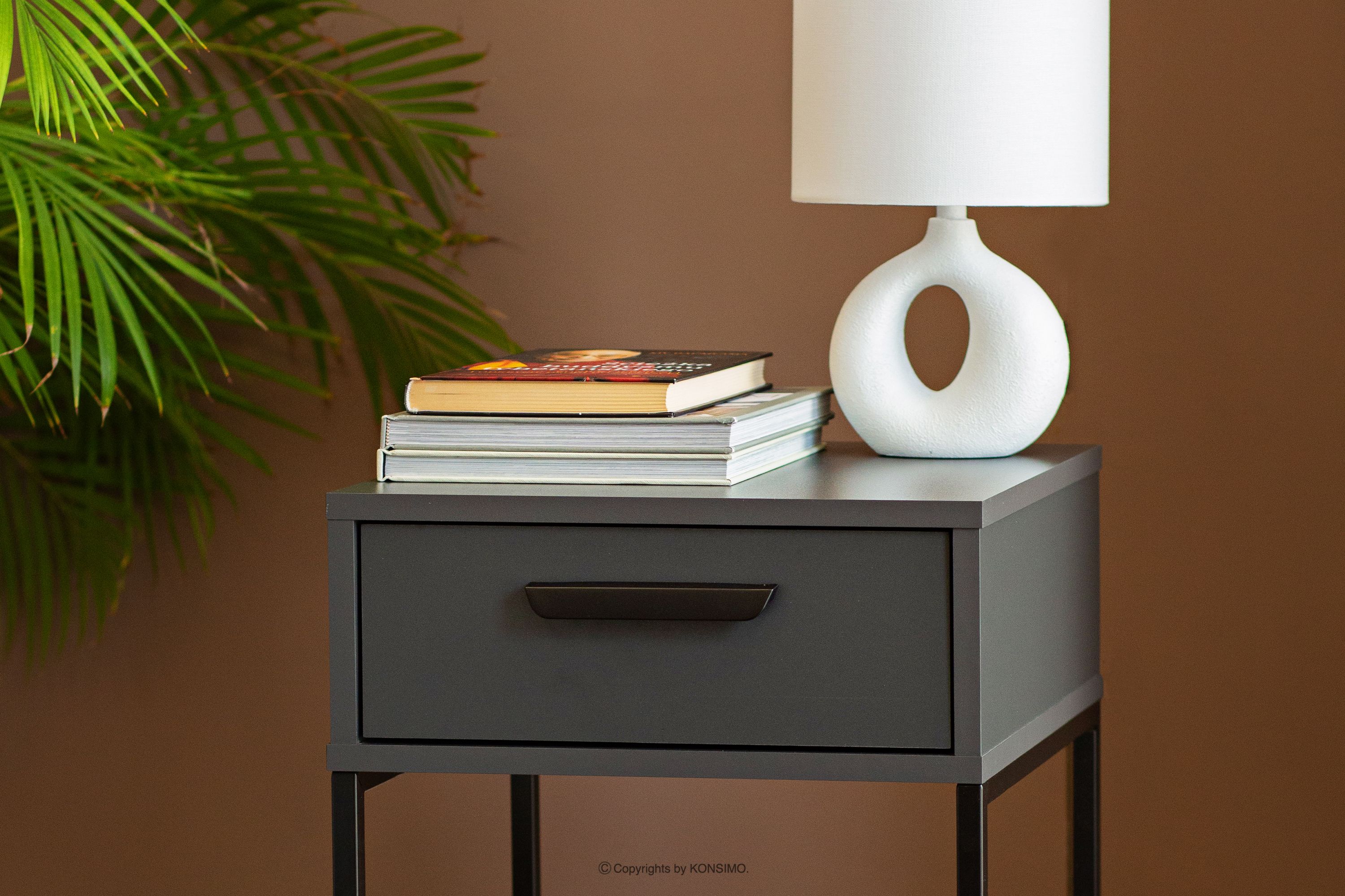 Der moderne Nachttisch mit Schublade in Anthrazit ist eine Kombination aus Funktionalität, minimalistischem Design und hochwertiger Verarbeitung. Er fügt sich perfekt in die aktuellen Einrichtungstrends ein und bietet praktische Lösungen in eleganter Form. Dank der Verwendung von langlebigen Materialien werden diese Tische auch den Erwartungen der anspruchsvollsten Benutzer gerecht. Der minimalistische Look geht Hand in Hand mit der Funktionalität - die Tische sind mit einer geräumigen Schublade ausgestattet, in der alle notwendigen Kleinigkeiten wie Bücher, Brillen oder ein Handy-Ladegerät Platz finden.