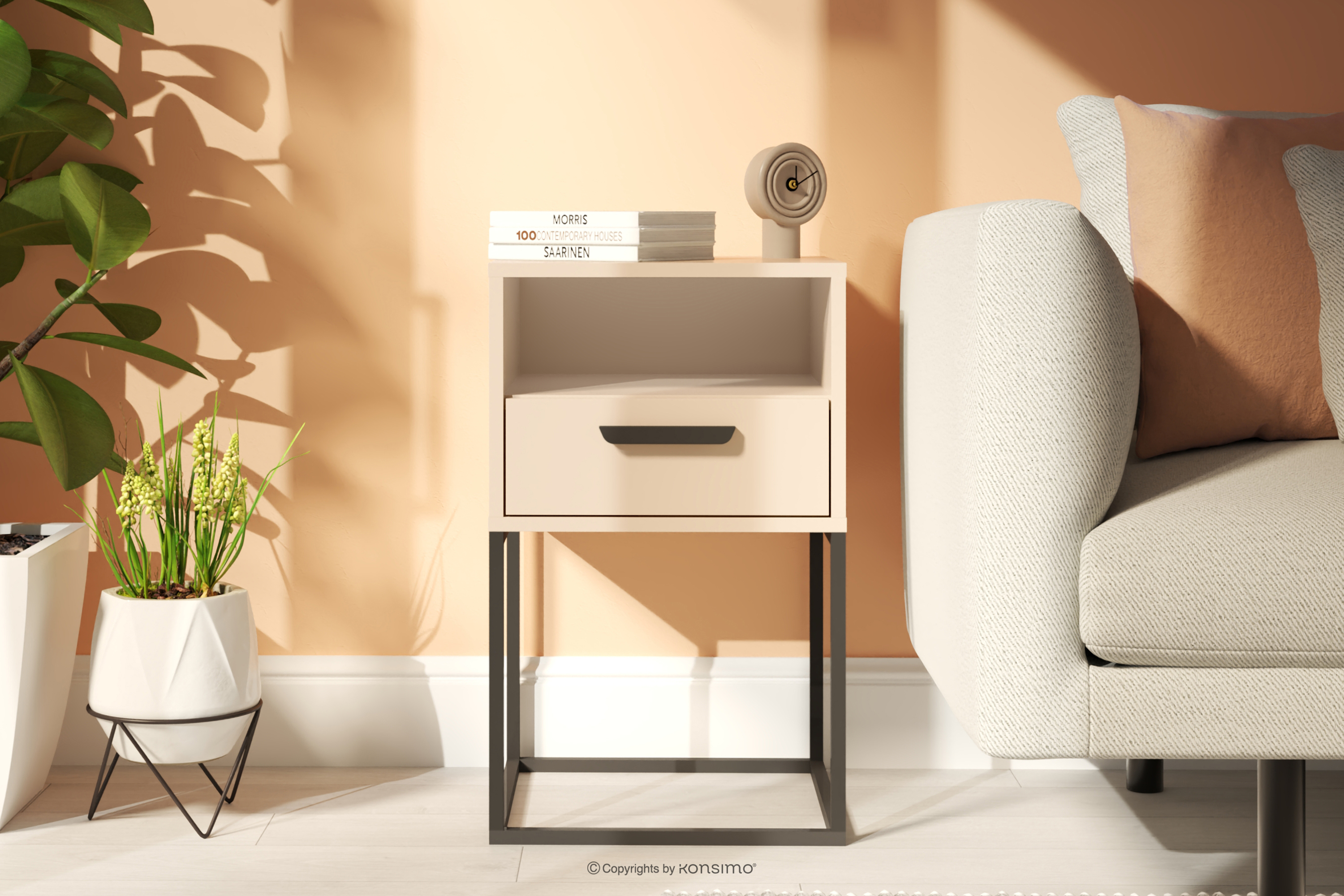 Kleiner Nachttisch mit Schublade cremefarben sind eine Kombination aus Funktionalität, minimalistischem Design und höchster Verarbeitungsqualität. Sie passen perfekt zu den aktuellen Einrichtungstrends und bieten praktische Lösungen in eleganter Form. Dank der Verwendung langlebiger Materialien erfüllen diese Tische selbst die Erwartungen der anspruchsvollsten Nutzer. Das minimalistische Design geht Hand in Hand mit Funktionalität – die Tische sind mit einer geräumigen Schublade ausgestattet, in der alle notwendigen Kleinigkeiten wie Bücher, Brillen oder Ladegeräte für Mobiltelefone Platz finden.