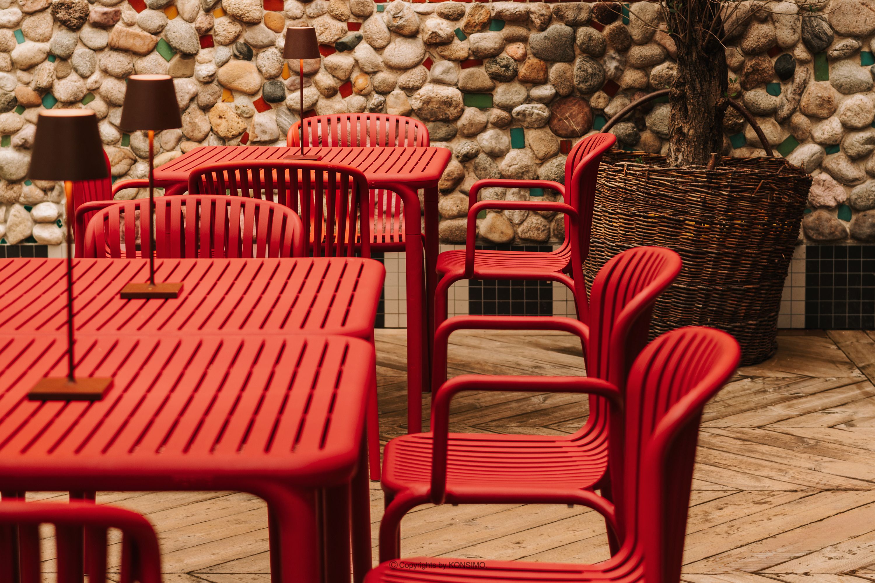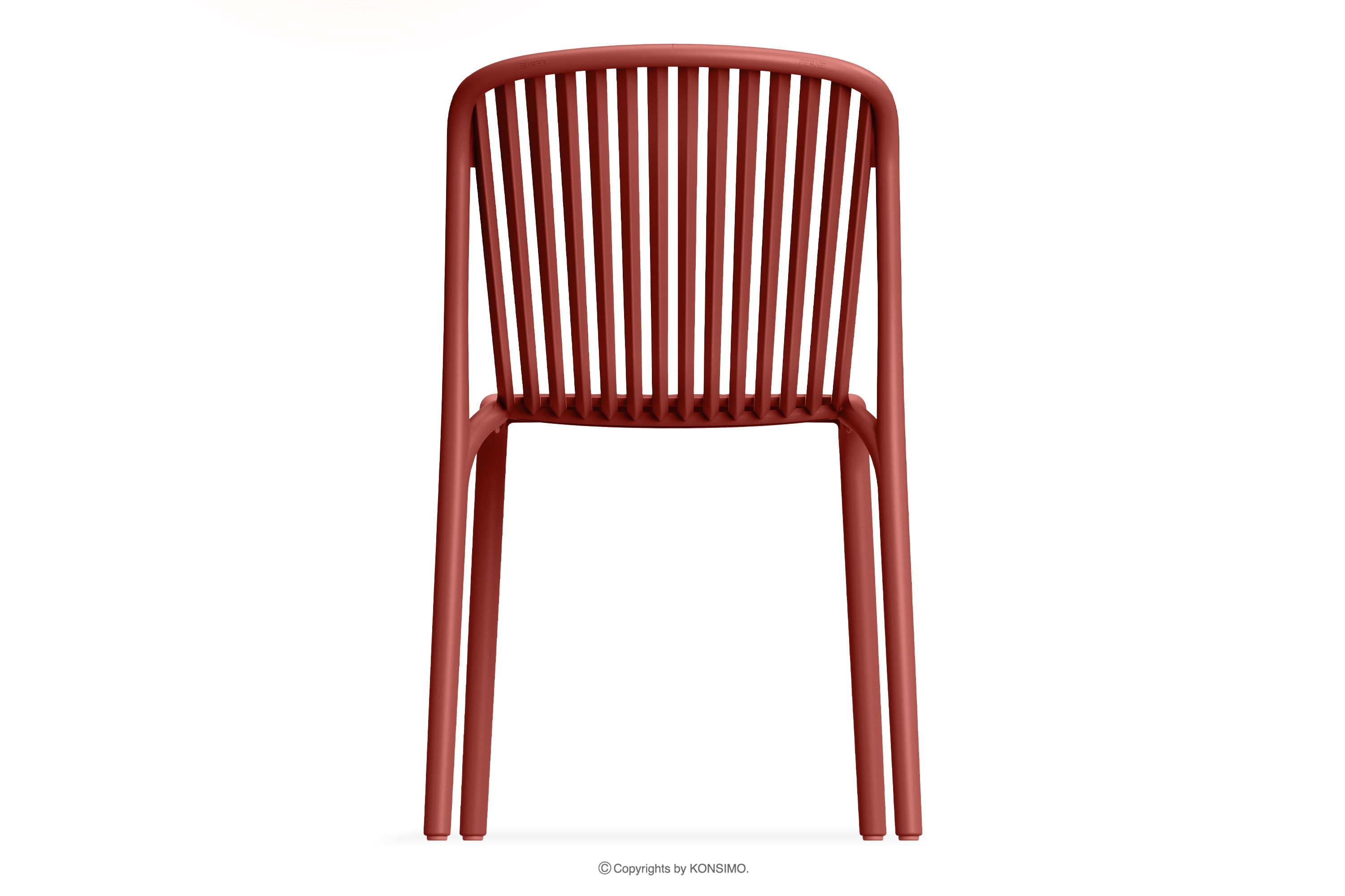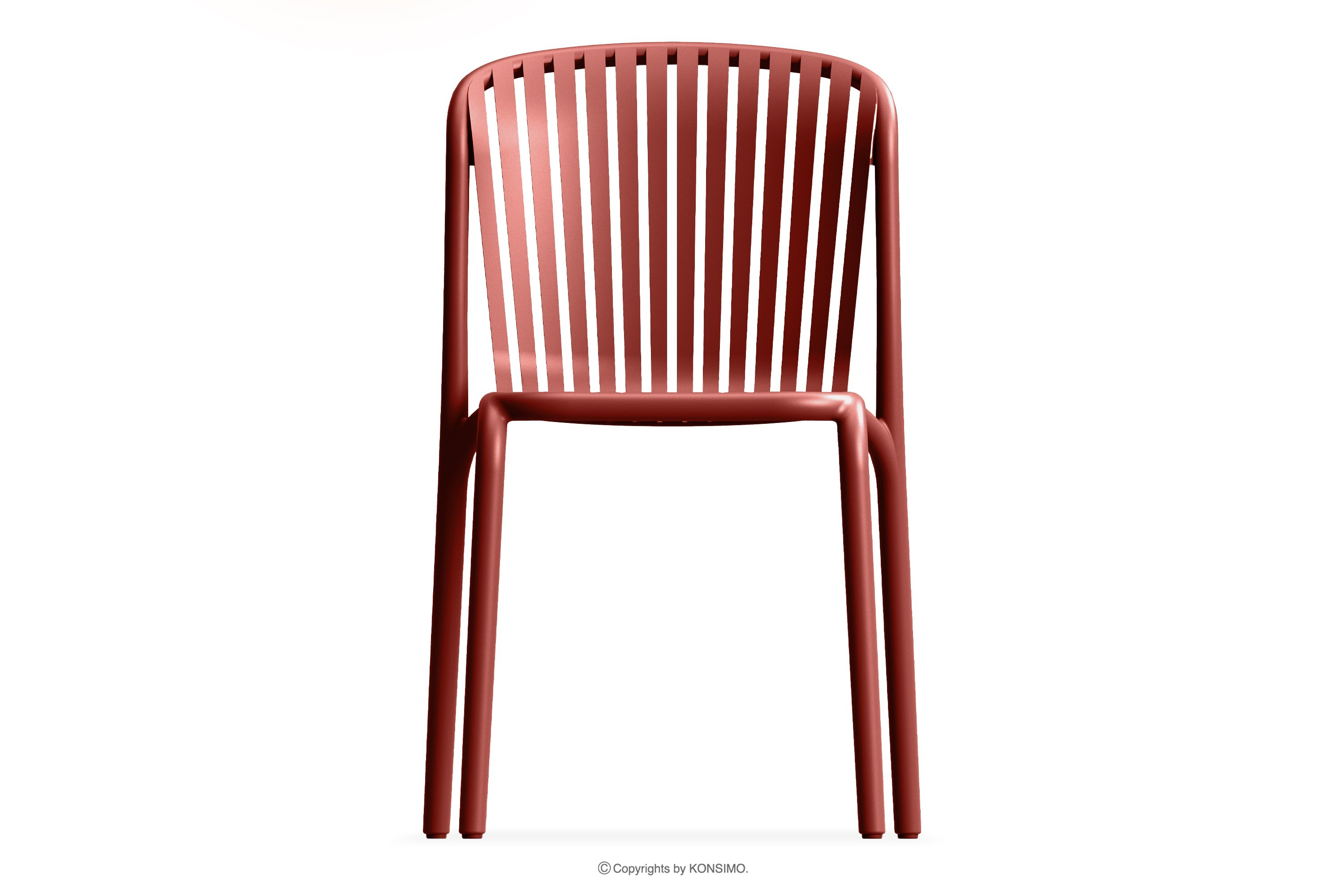 Gartenstuhl aus Polypropylen mit Glasfaser rot es verbindet minimalistische Ästhetik mit einzigartiger Funktionalität. Hergestellt aus hochwertigem Kunststoff – einer speziellen Polypropylenmischung mit Glasfaserverstärkung – garantiert es unvergleichliche Langlebigkeit und Widerstandsfähigkeit gegen wechselnde Witterungsbedingungen. Die innovative Konstruktion jedes Elements verhindert die Ansammlung von Regenwasser, sodass die Möbel auch nach starken Regenfällen schnell trocknen.