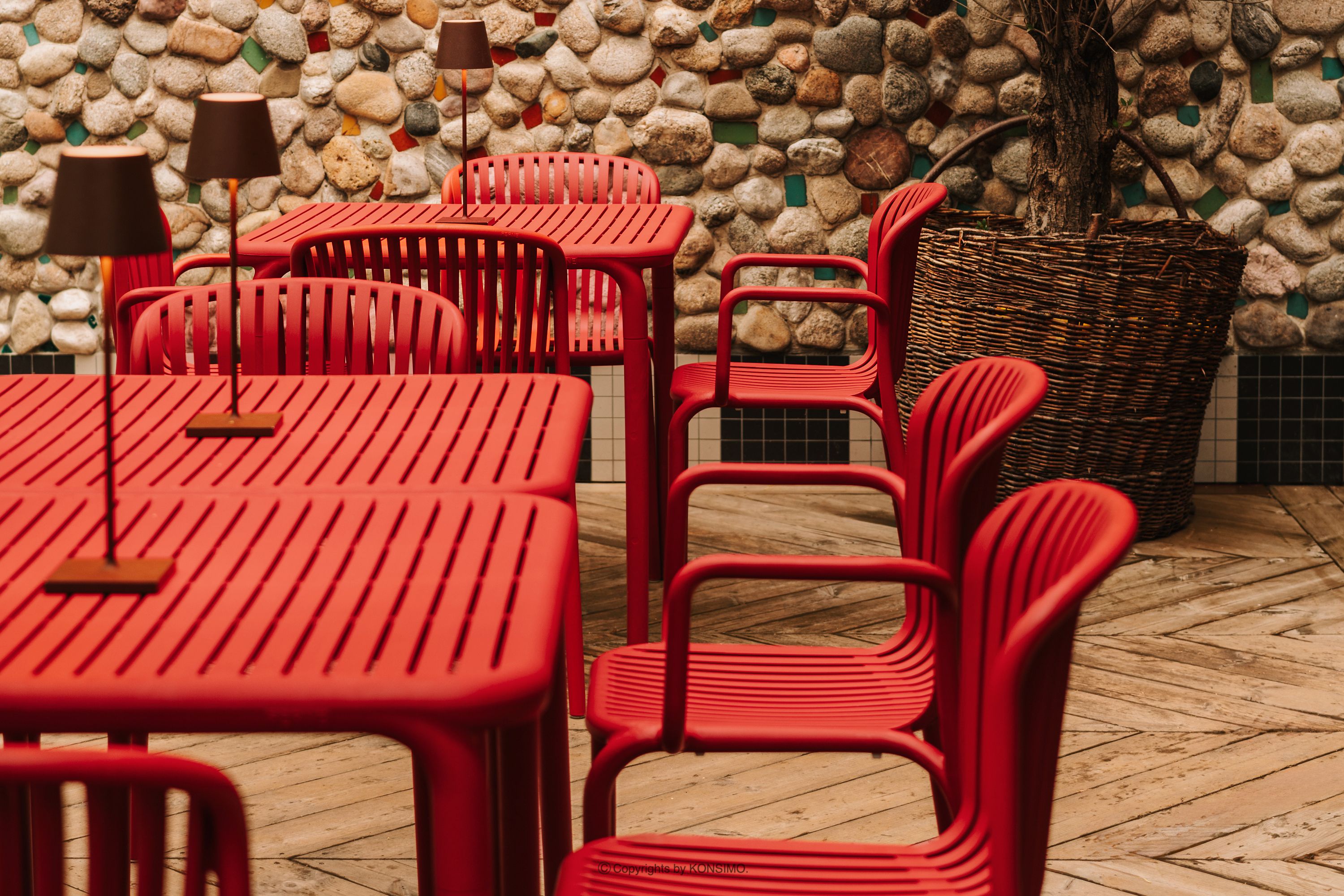 Gartenstuhl mit Armlehnen aus Polypropylen mit Glasfaser rot es verbindet minimalistische Ästhetik mit einzigartiger Funktionalität. Hergestellt aus hochwertigem Kunststoff – einer speziellen Polypropylenmischung mit Glasfaserverstärkung – garantiert es unvergleichliche Langlebigkeit und Widerstandsfähigkeit gegen wechselnde Witterungsbedingungen. Die innovative Konstruktion jedes Elements verhindert die Ansammlung von Regenwasser, sodass die Möbel auch nach starken Regenfällen schnell trocknen.