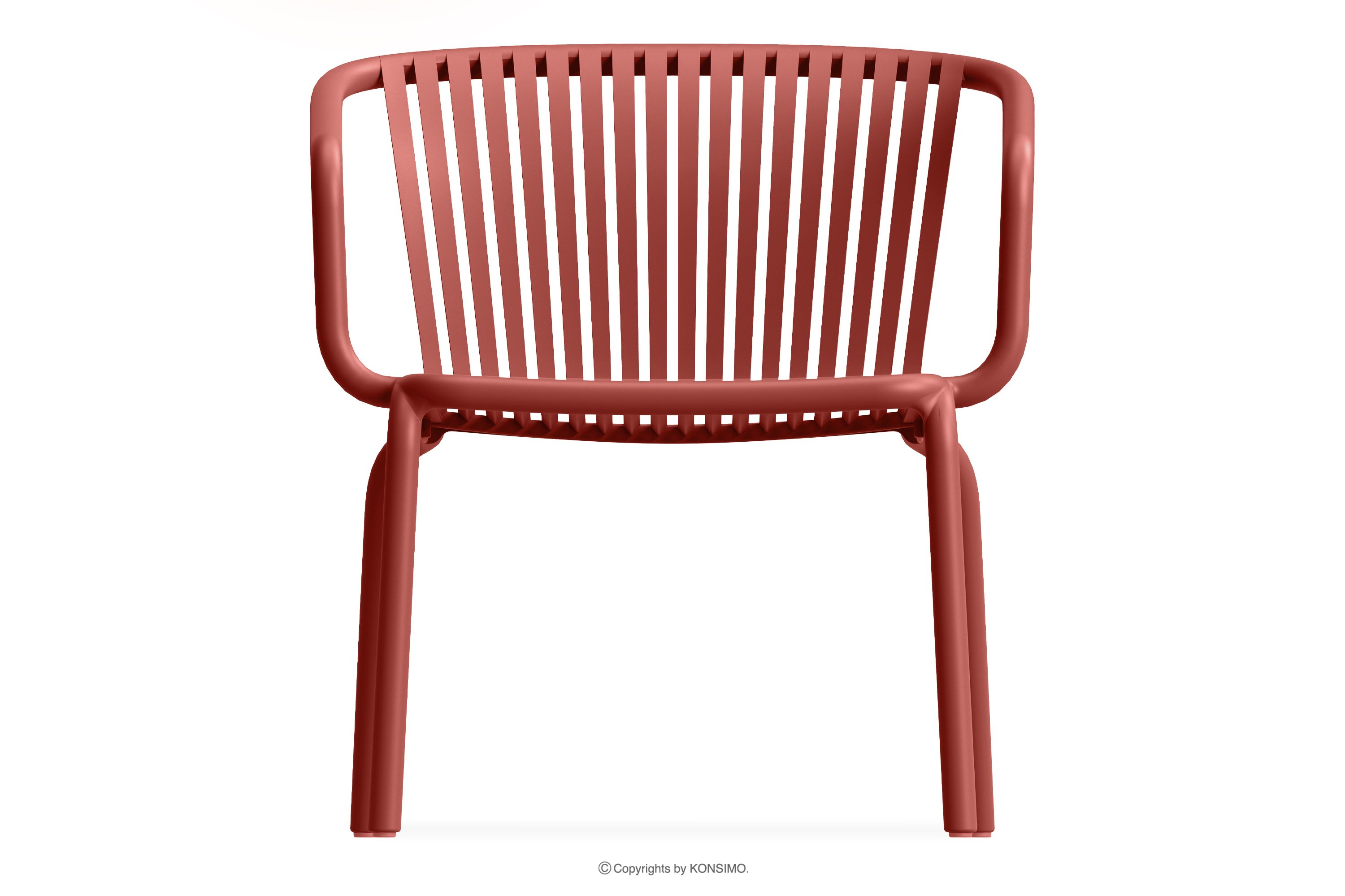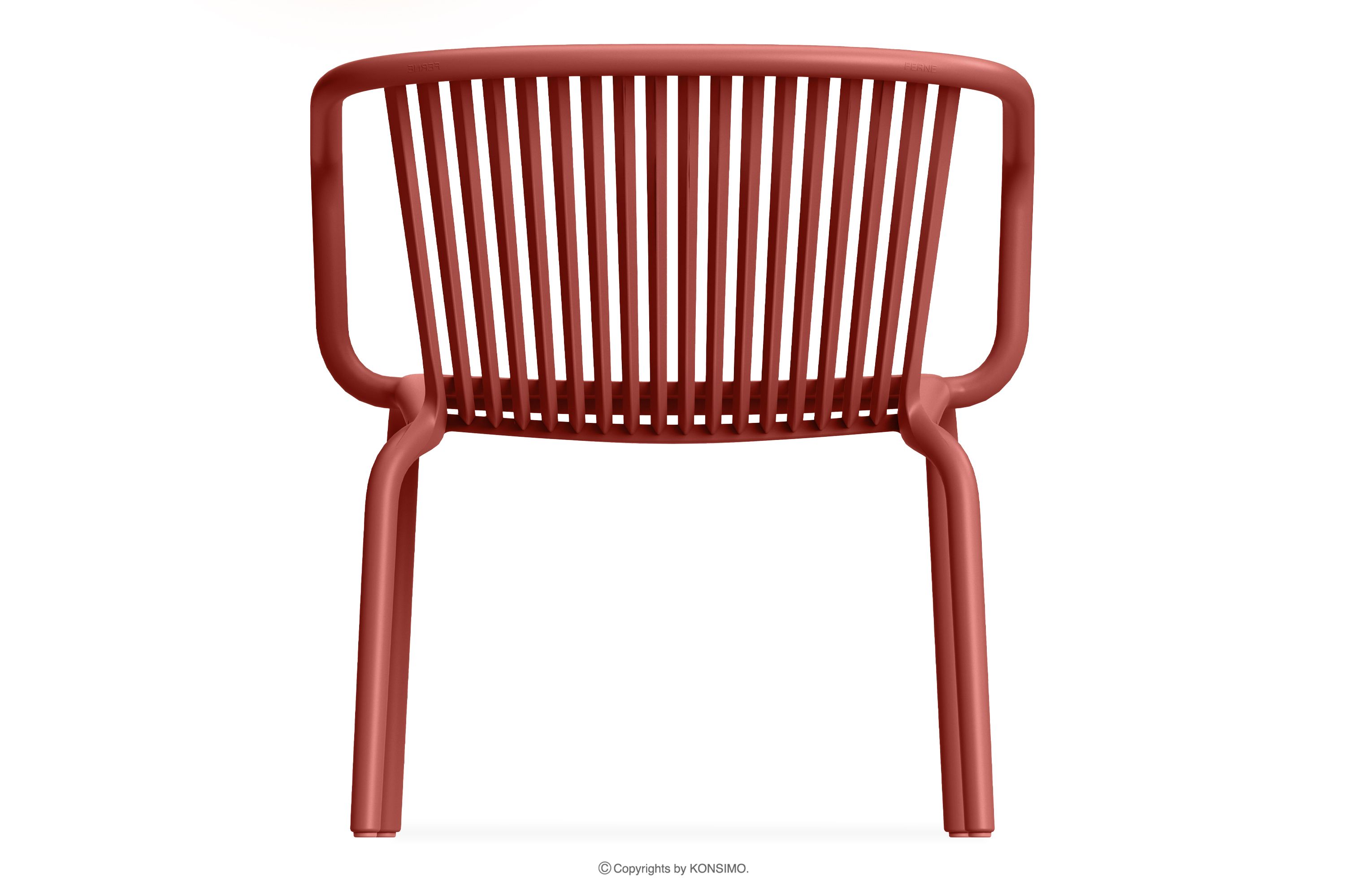 Gartensessel mit Armlehnen aus Polypropylen mit Glasfaser rot es verbindet minimalistische Ästhetik mit einzigartiger Funktionalität. Hergestellt aus hochwertigem Kunststoff – einer speziellen Polypropylenmischung mit Glasfaserverstärkung – garantiert es unvergleichliche Langlebigkeit und Widerstandsfähigkeit gegen wechselnde Witterungsbedingungen. Die innovative Konstruktion jedes Elements verhindert die Ansammlung von Regenwasser, sodass die Möbel auch nach starken Regenfällen schnell trocknen.