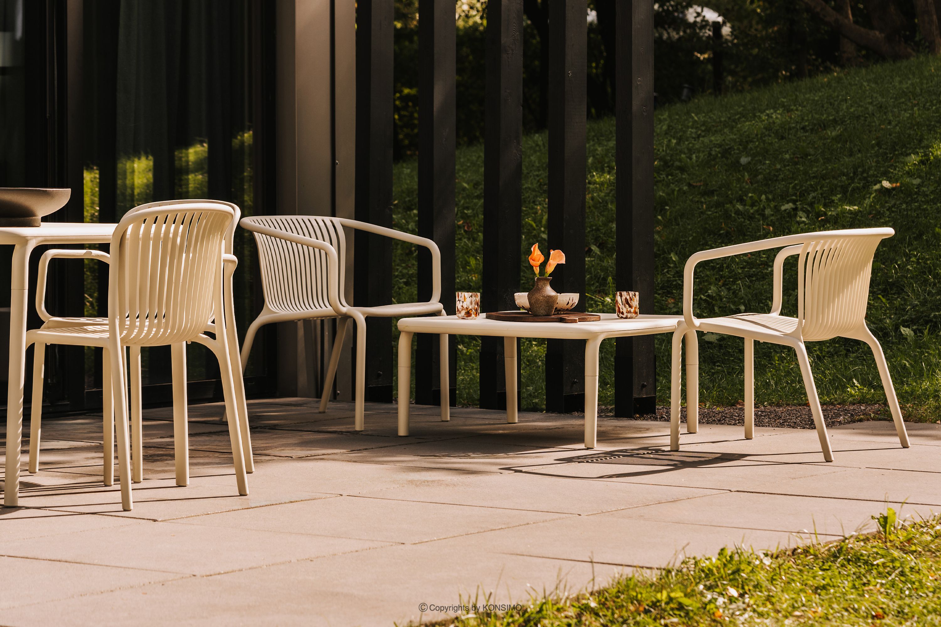 Gartensessel mit Armlehnen aus Polypropylen mit Glasfaser beige es verbindet minimalistische Ästhetik mit einzigartiger Funktionalität. Hergestellt aus hochwertigem Kunststoff – einer speziellen Polypropylenmischung mit Glasfaserverstärkung – garantiert es unvergleichliche Langlebigkeit und Widerstandsfähigkeit gegen wechselnde Witterungsbedingungen. Die innovative Konstruktion jedes Elements verhindert die Ansammlung von Regenwasser, sodass die Möbel auch nach starken Regenfällen schnell trocknen.
