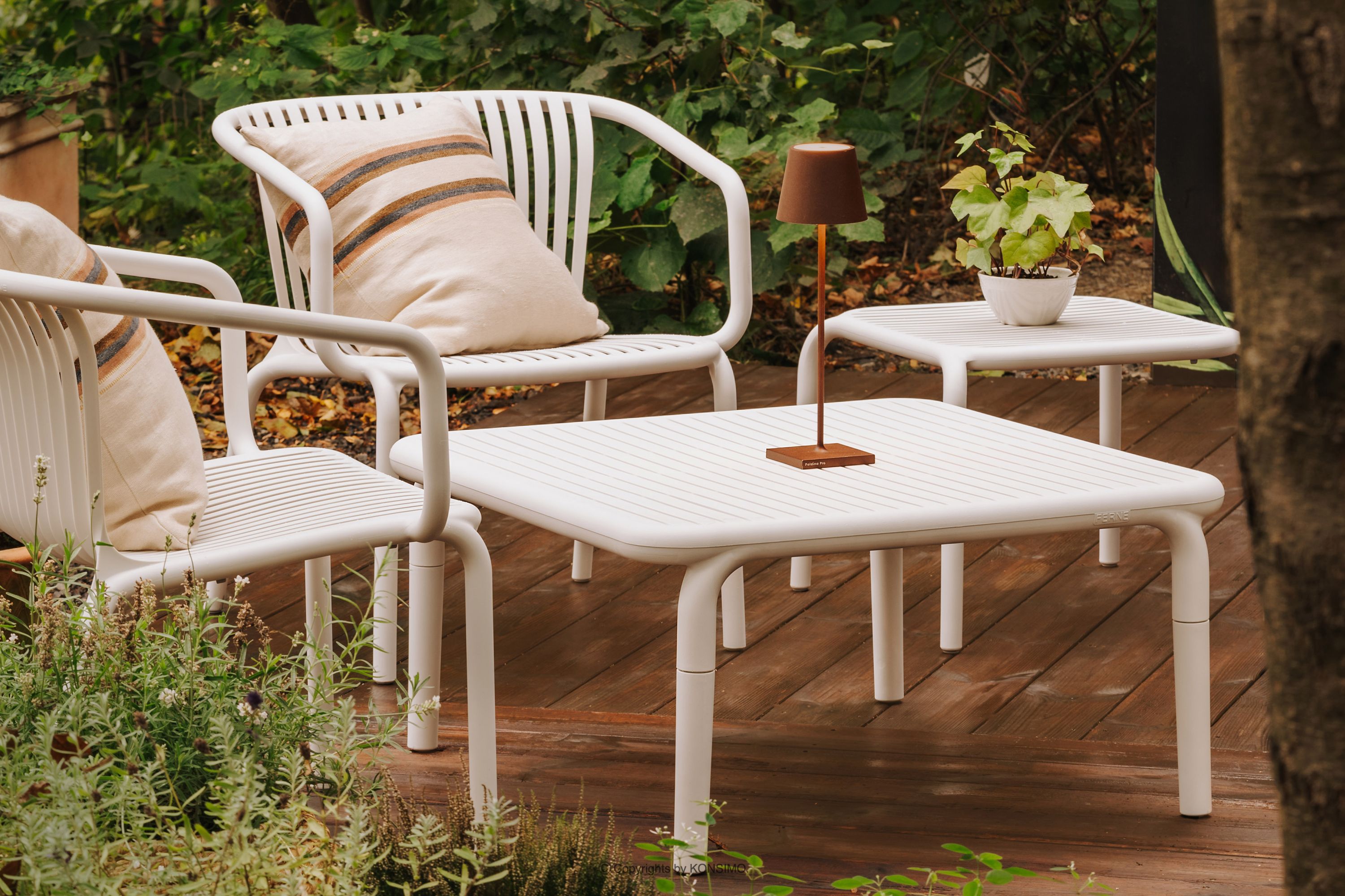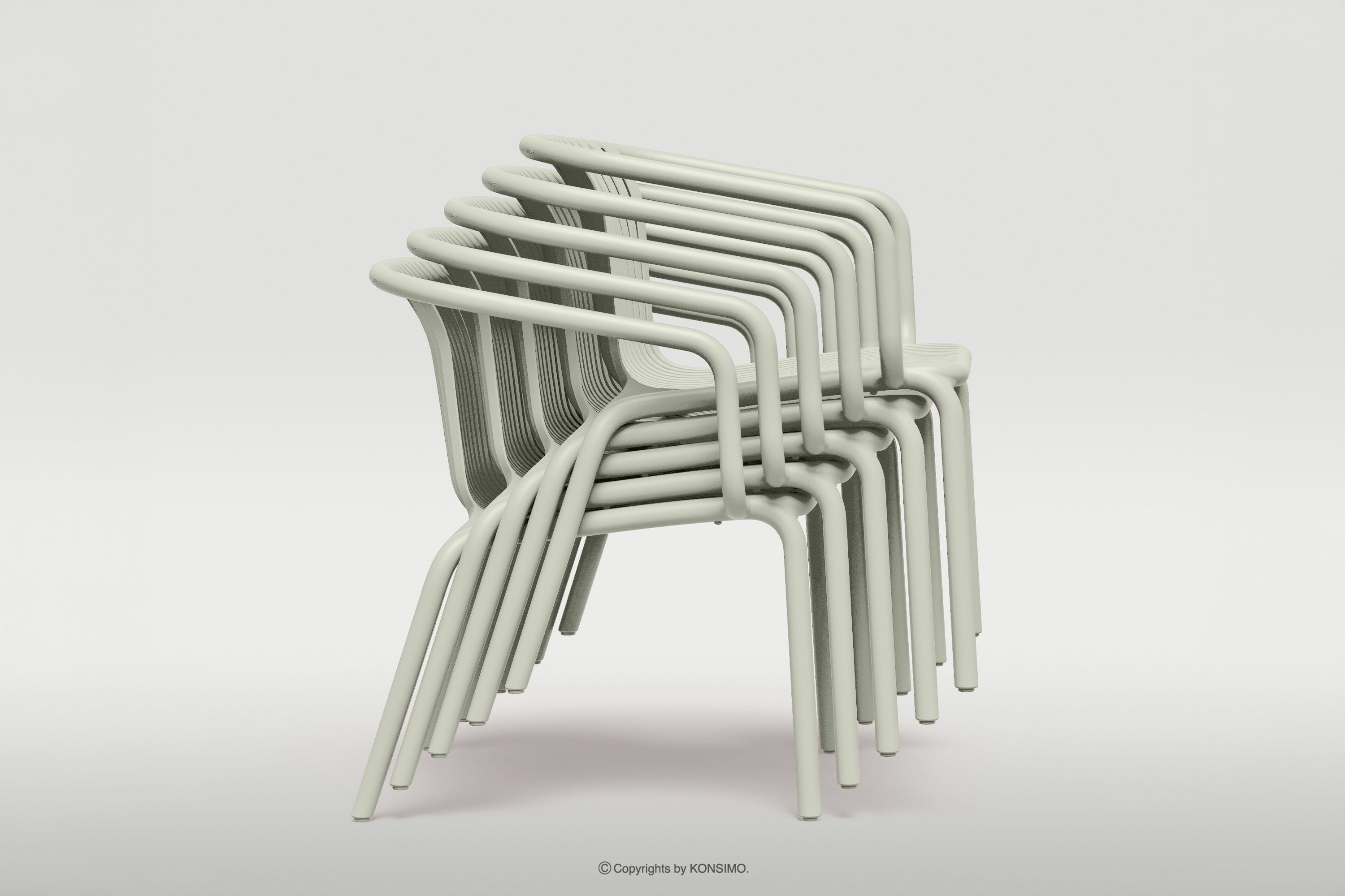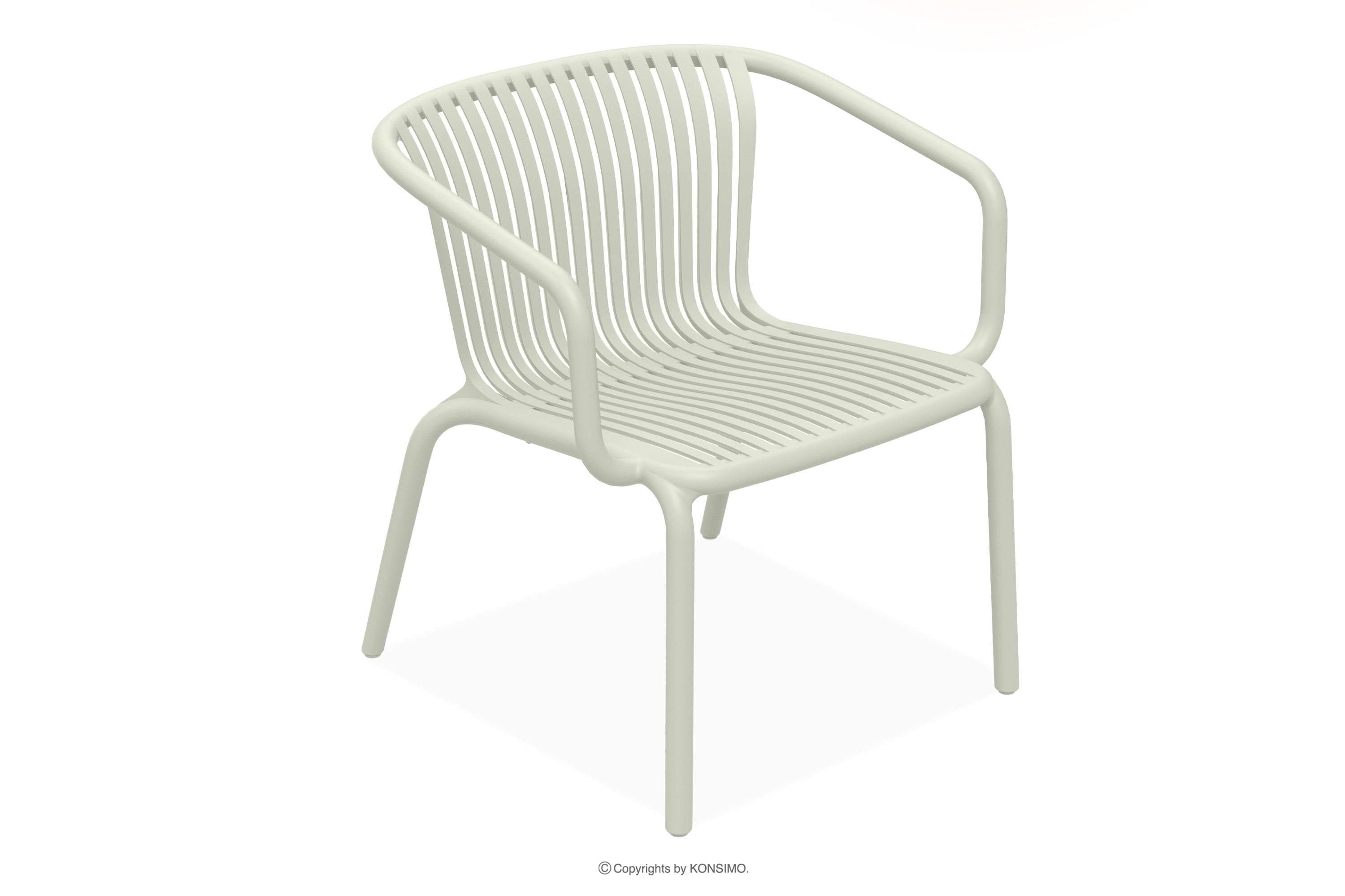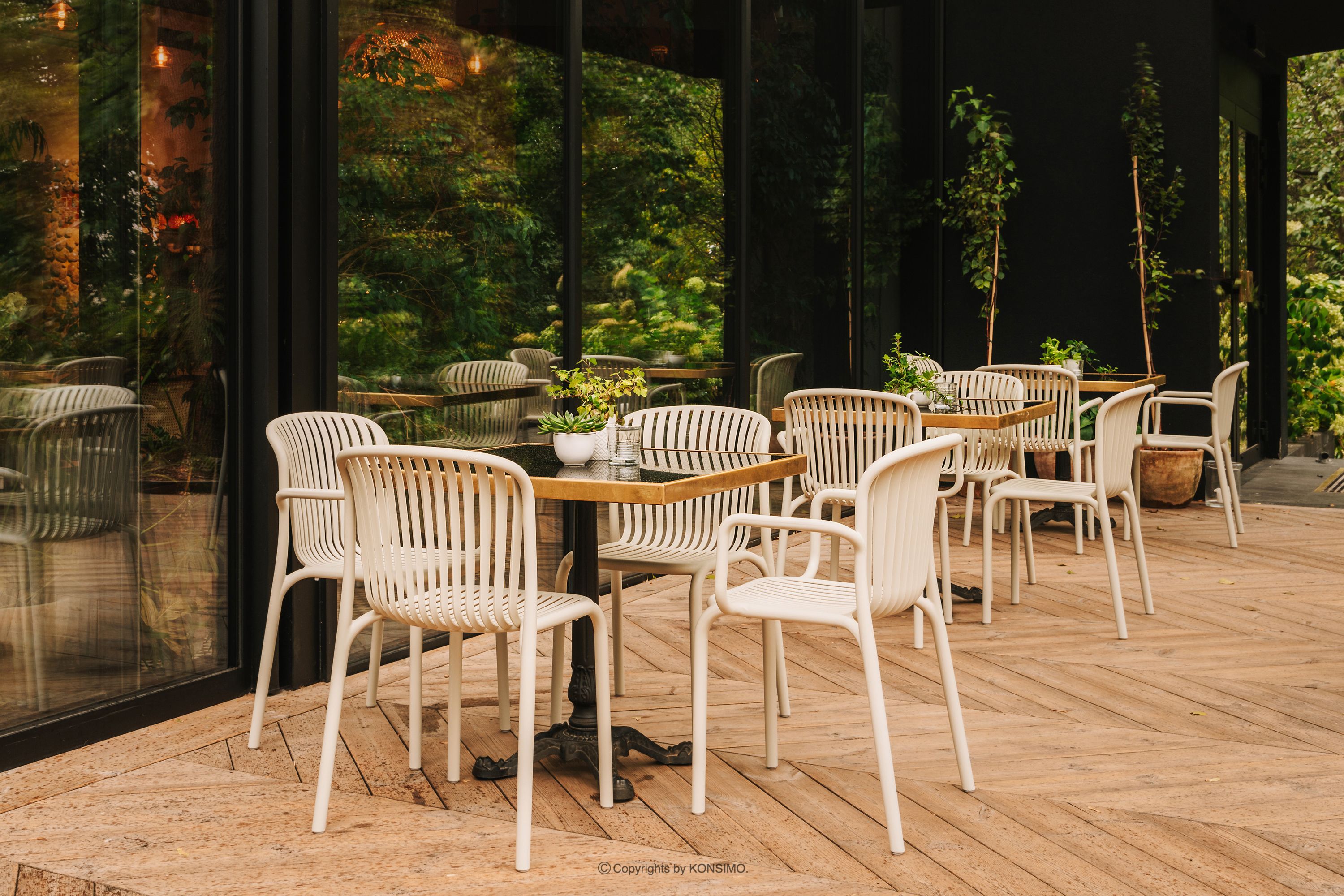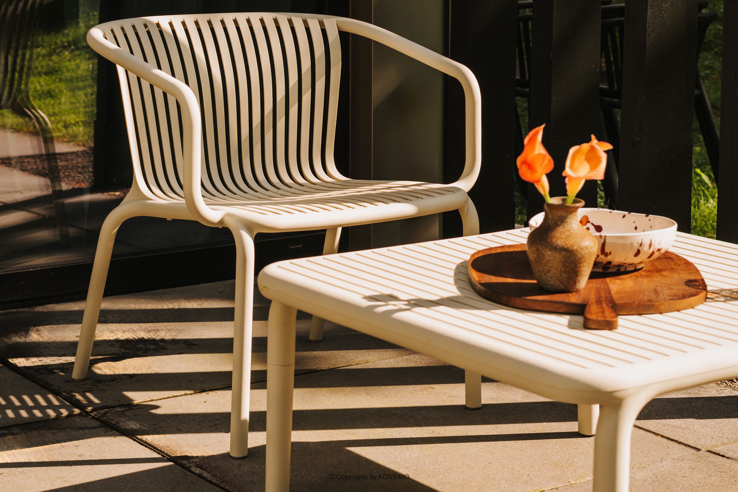 Sessel und Esstisch beige 4 Personen es verbindet minimalistische Ästhetik mit einzigartiger Funktionalität. Hergestellt aus hochwertigem Kunststoff – einer speziellen Polypropylenmischung mit Glasfaserverstärkung – garantiert es unvergleichliche Langlebigkeit und Widerstandsfähigkeit gegen wechselnde Witterungsbedingungen. Die innovative Konstruktion jedes Elements verhindert die Ansammlung von Regenwasser, sodass die Möbel auch nach starken Regenfällen schnell trocknen.