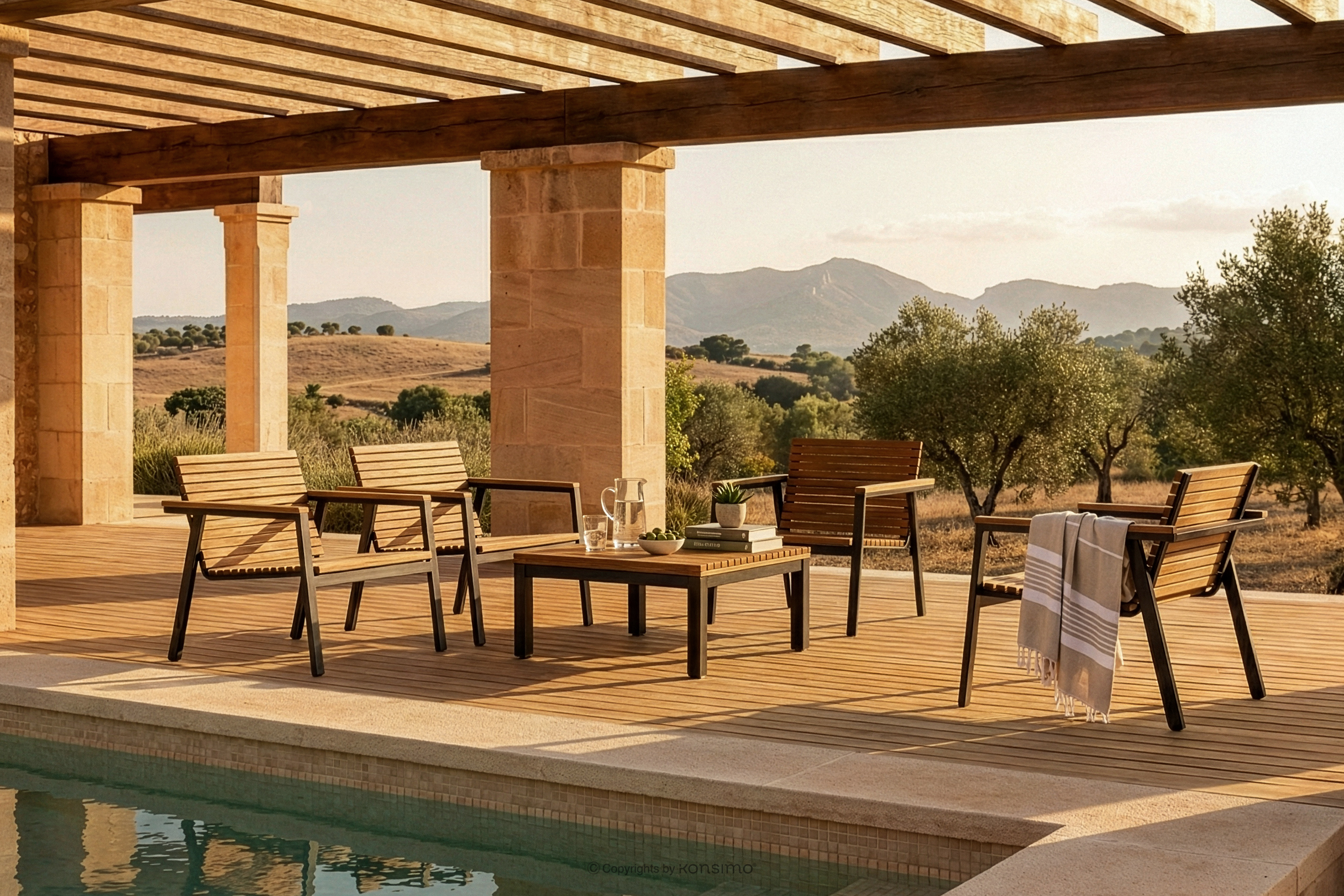 - Reinigung und Pflege: Um das ursprüngliche Aussehen der Möbel zu erhalten, empfehlen wir eine regelmäßige Pflege (1-3 Mal pro Saison, je nach Witterungsbedingungen) mit für Hartholz geeigneten Ölen für Außenmöbel