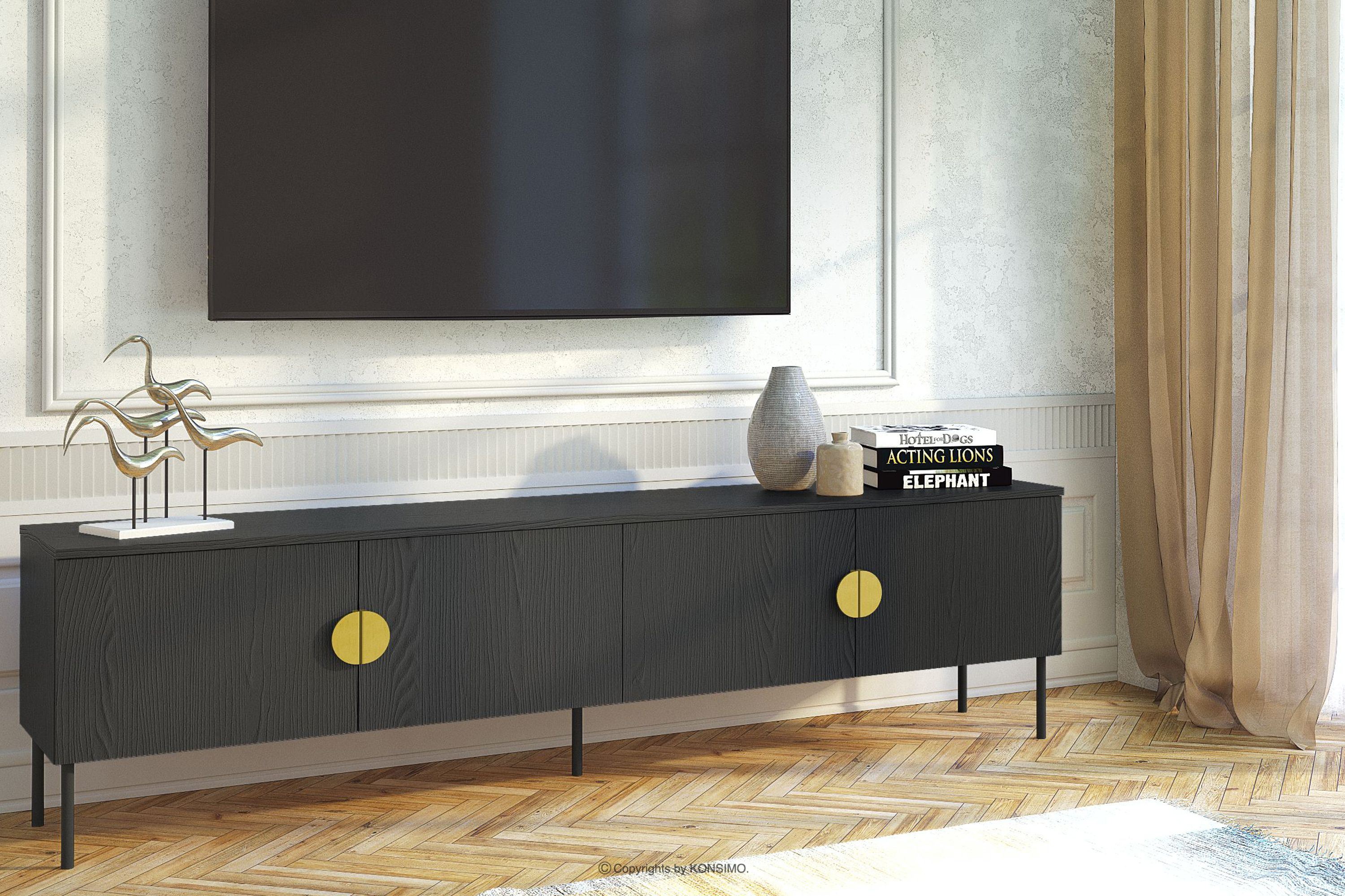 Der moderne TV-Schrank mit 200 cm langen schwarzen Regalböden verbindet minimalistische Form mit Funktionalität. Er besteht aus 16 mm starken Schichtstoffplatten und wirkt dank der schlanken, schwarzen Metallbeine leicht. Der TV-Schrank ist nicht nur ein Blickfang, sondern bietet auch praktische Aufbewahrungslösungen, die perfekt auf die Bedürfnisse moderner Innenräume abgestimmt sind. Die markanten goldenen Metallgriffe bilden einen auffälligen Kontrast zum schwarzen Korpus und betonen die geometrische Reinheit des Möbelstücks.