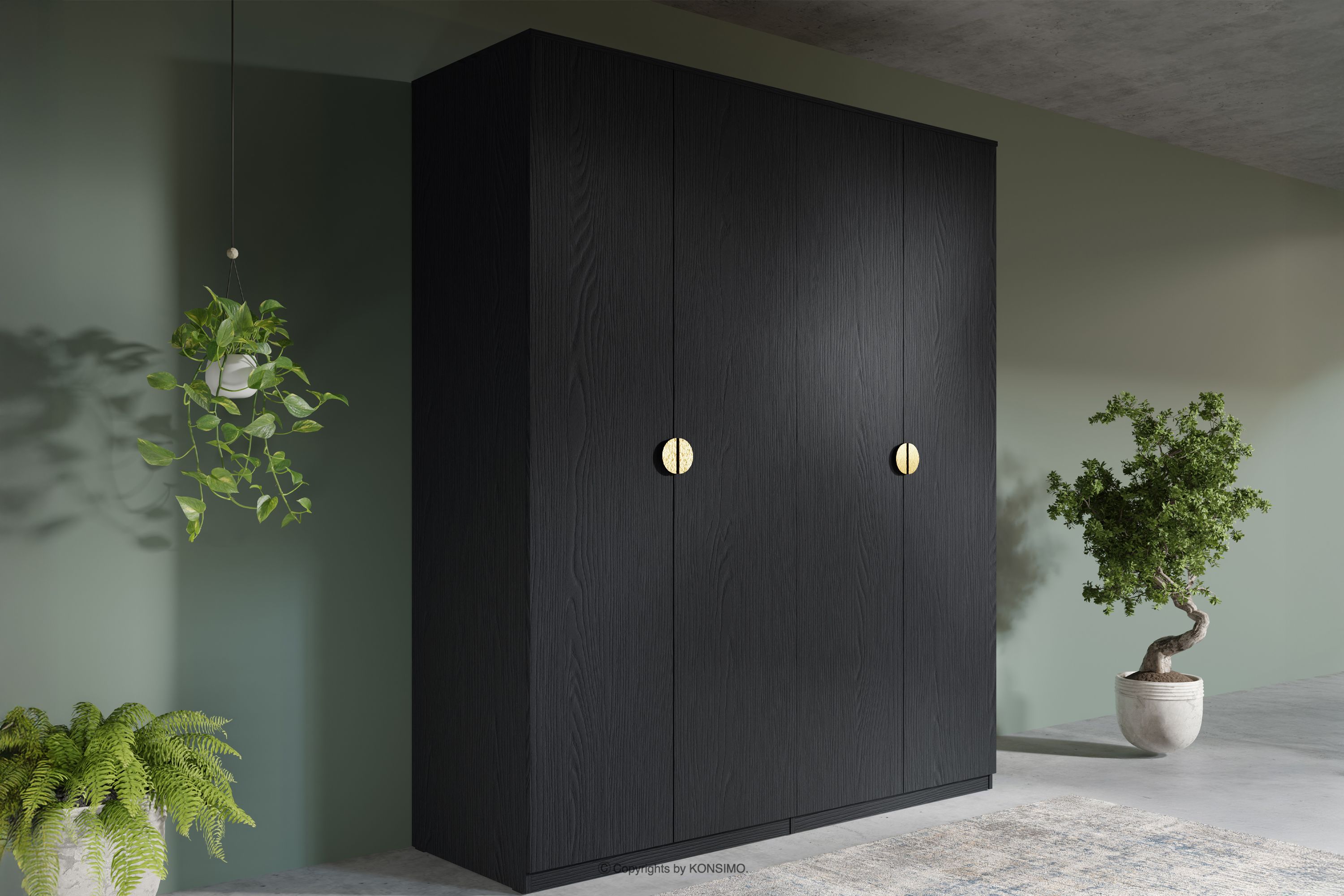 Der schwarze Kleiderschrank für das Schlafzimmer verbindet minimalistisches Design mit Funktionalität. Er ist aus 16 mm starker laminierter Platte gefertigt und sieht sehr gut aus. Der Kleiderschrank ist nicht nur ein Blickfang, sondern bietet auch praktische Aufbewahrungslösungen wie Einlegeböden und Kleiderstangen, die perfekt auf die Bedürfnisse moderner Innenräume zugeschnitten sind. Die charakteristischen goldenen Metallgriffe bilden einen klaren Kontrast zum schwarzen Korpus und betonen die geometrische Reinheit des Möbelstücks.
