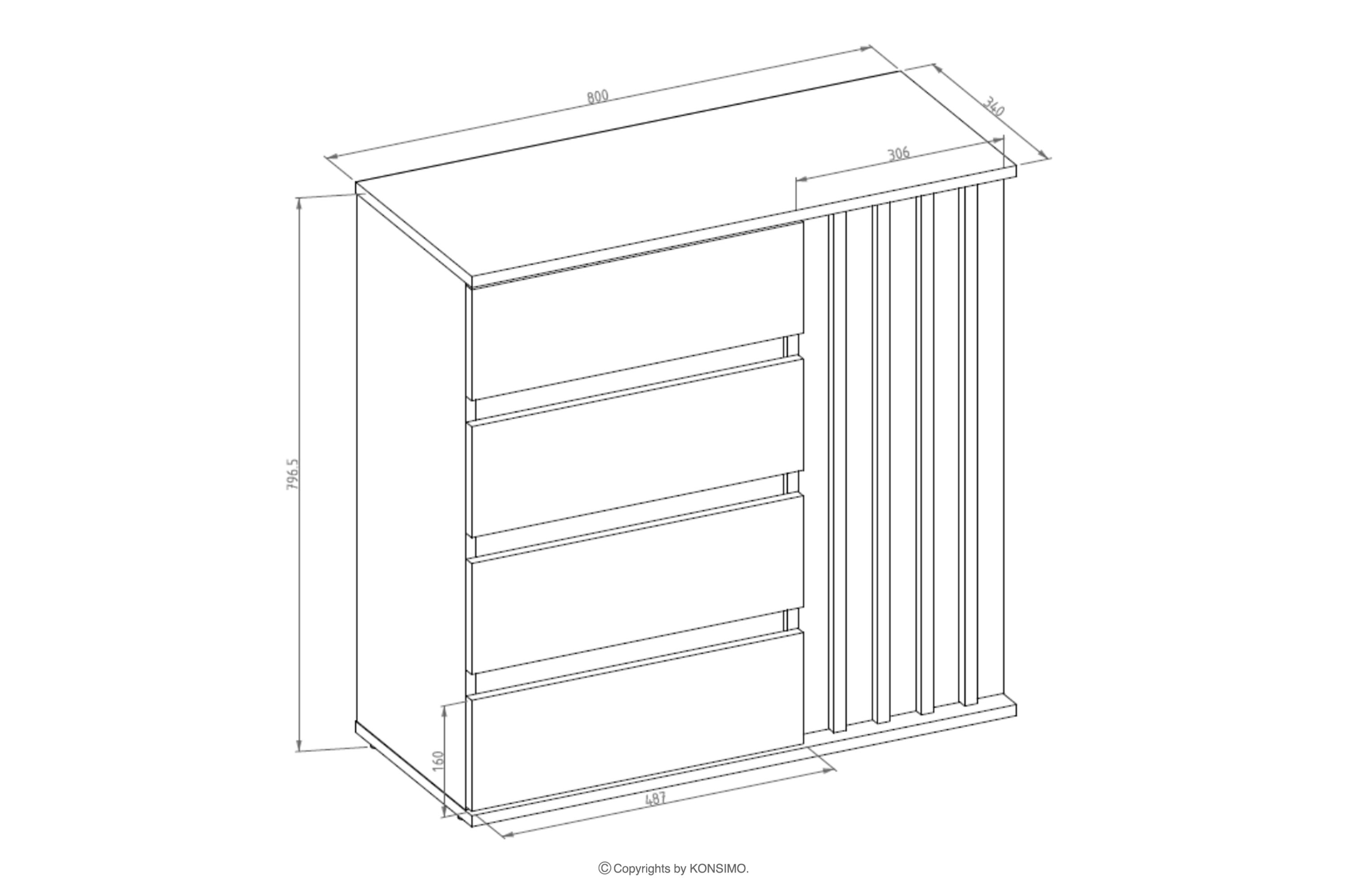 Die CORRIDI-Kollektion zeichnet sich durch ein minimalistisches, zeitgemäßes Design aus, das sich perfekt in eine Vielzahl von Einrichtungsstilen einfügt. Die schlichte Form der Möbel erhält durch dekorative MDF-Lamellen einen unverwechselbaren Charakter, der den Möbeln ein modernes Aussehen verleiht und die Kollektion leichter erscheinen lässt. Dieses Material ermöglicht eine präzise Verarbeitung der Details und verbessert die Gesamtästhetik.
