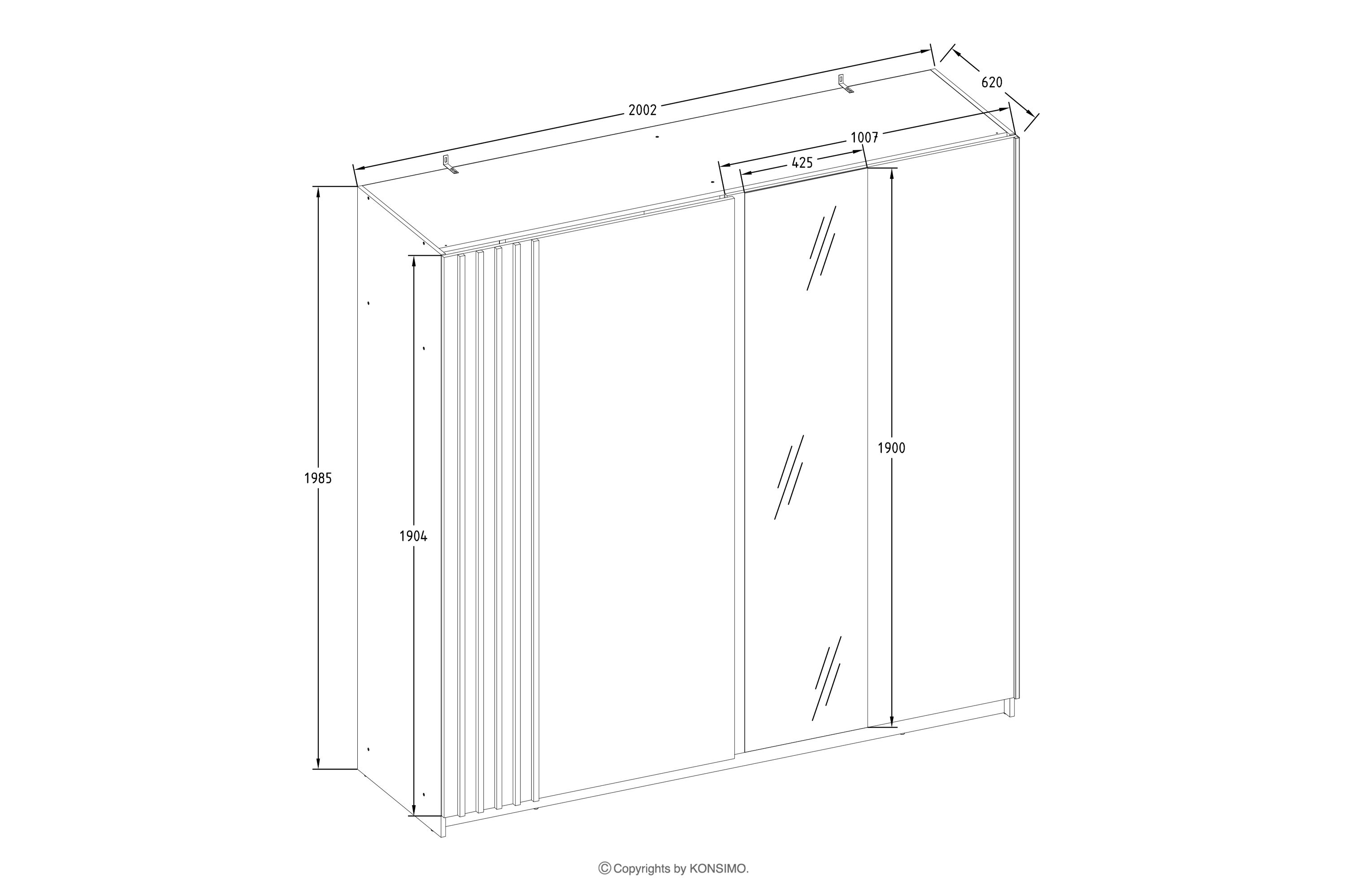 Schwebetürenschrank mit Spiegel und Lamellen weiß/Eiche-Artisan ist eine Kombination aus Eleganz, Funktionalität und modernen technologischen Lösungen, die über Jahre hinweg für Komfort und ein ästhetisches Erscheinungsbild sorgen. Die Kleiderschränke sind mit einem oberen Schiebesystem ausgestattet, das vollständig in der Struktur verborgen ist, was die Ästhetik und den Bedienkomfort erhöht. Dank des Laufschienensystems gleiten die Türen sanft und machen die Schränke zur perfekten Lösung für Schlafzimmer, Wohnzimmer oder Flure.