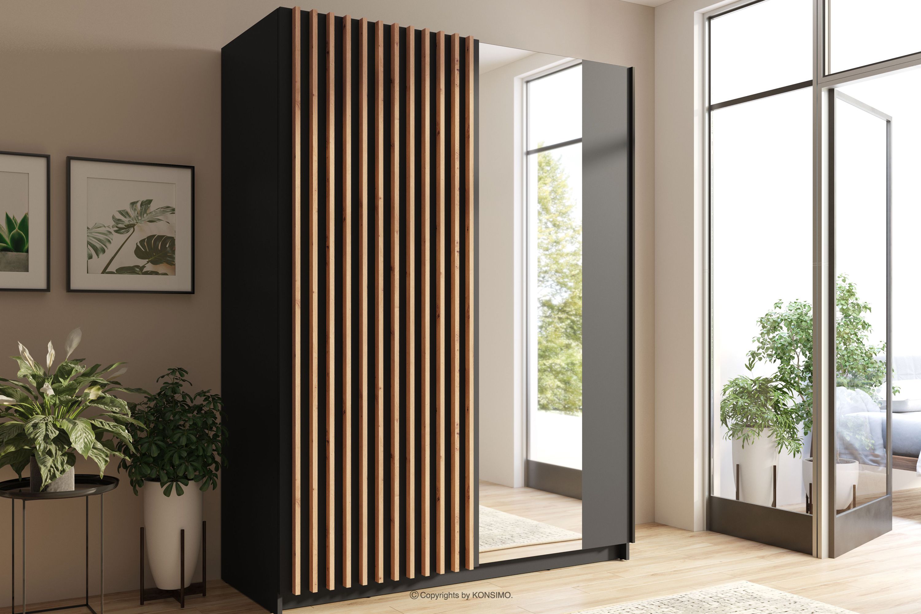 CASTARI Großer Schiebetürenschrank mit Lamellen und Spiegel schwarz/Eiche-Artisan