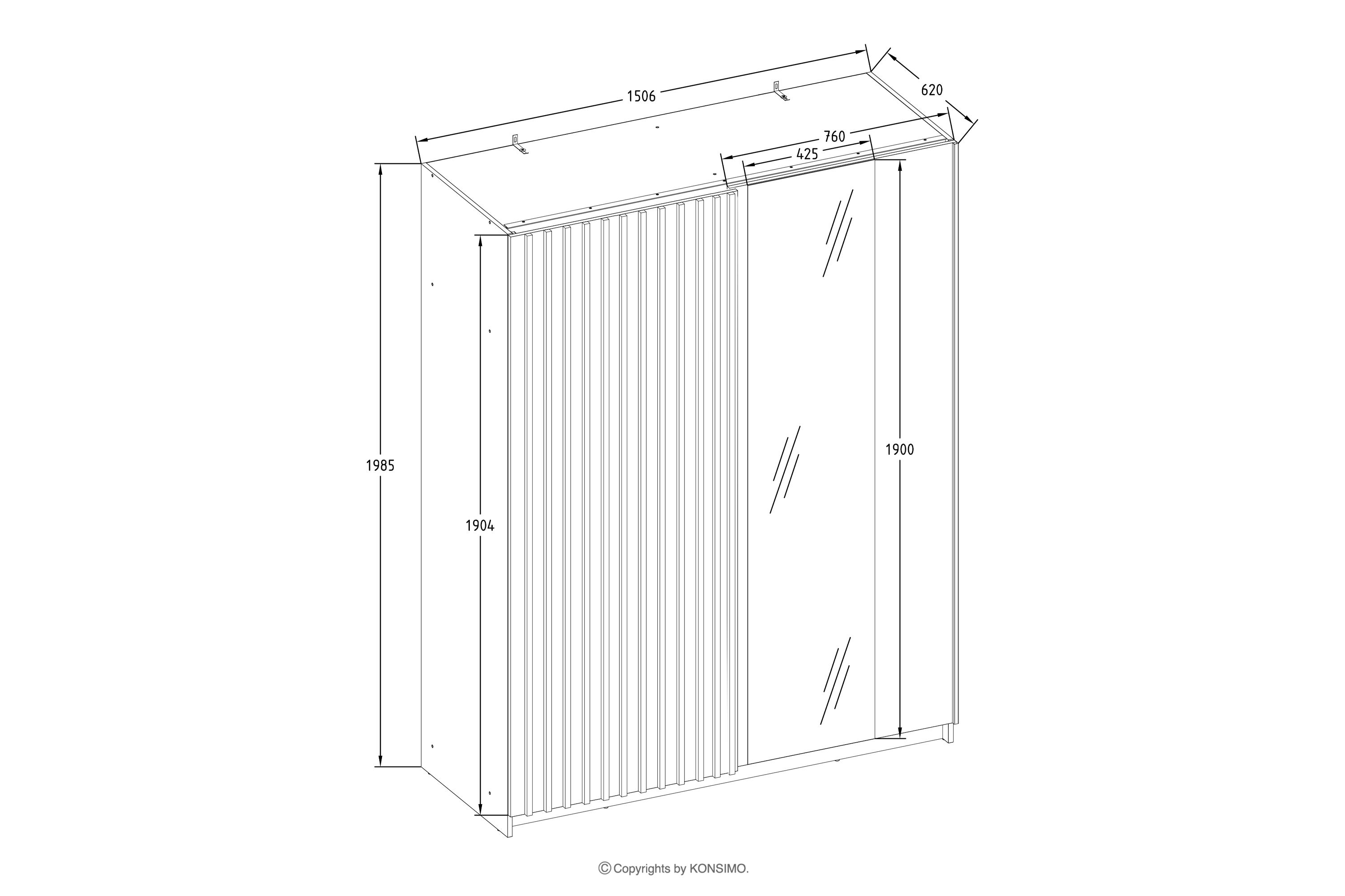 Großer Schiebetürenschrank mit Lamellen und Spiegel schwarz/Eiche-Artisan ist eine Kombination aus Eleganz, Funktionalität und modernen technologischen Lösungen, die über Jahre hinweg für Komfort und ein ästhetisches Erscheinungsbild sorgen. Die Kleiderschränke sind mit einem oberen Schiebesystem ausgestattet, das vollständig in der Struktur verborgen ist, was die Ästhetik und den Bedienkomfort erhöht. Dank des Laufschienensystems gleiten die Türen sanft und machen die Schränke zur perfekten Lösung für Schlafzimmer, Wohnzimmer oder Flure.