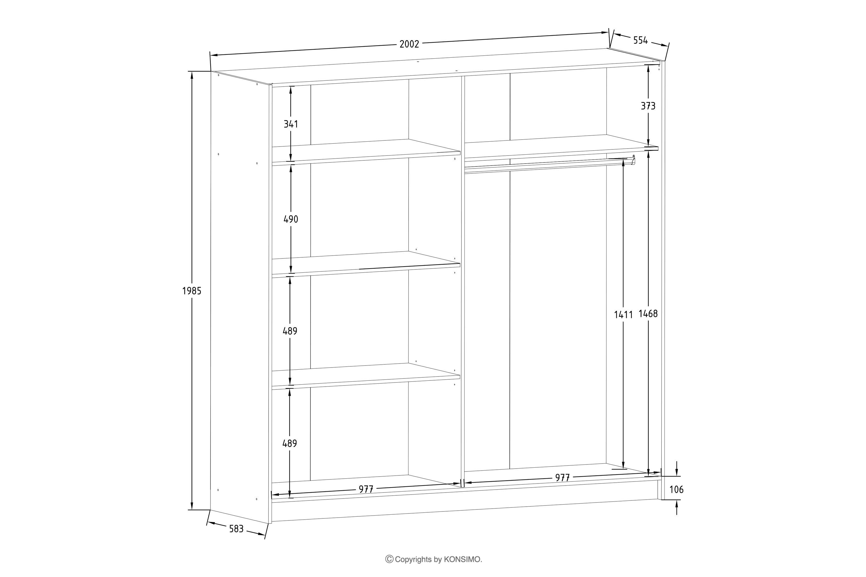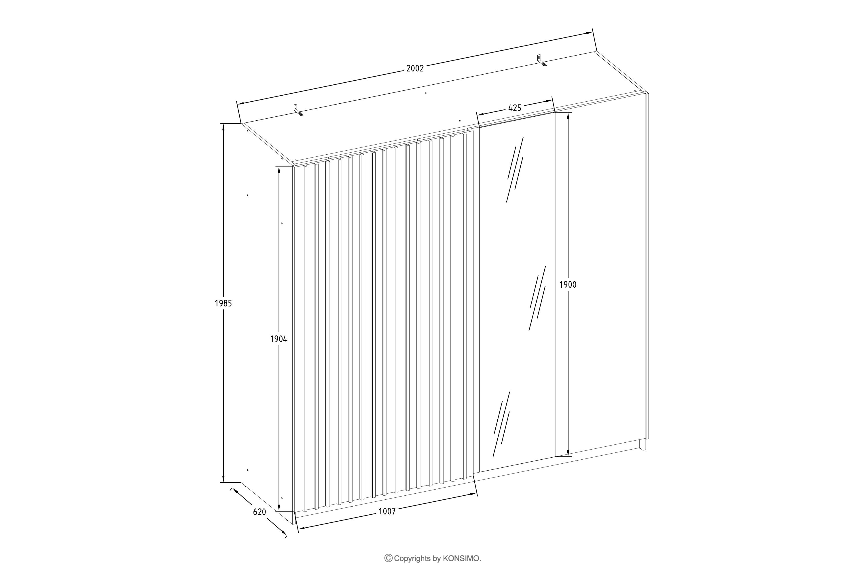 Großer Schiebetürenschrank mit Spiegel und Lamellen schwarz/Eiche-Artisan ist eine Kombination aus Eleganz, Funktionalität und modernen technologischen Lösungen, die über Jahre hinweg für Komfort und ein ästhetisches Erscheinungsbild sorgen. Die Kleiderschränke sind mit einem oberen Schiebesystem ausgestattet, das vollständig in der Struktur verborgen ist, was die Ästhetik und den Bedienkomfort erhöht. Dank des Laufschienensystems gleiten die Türen sanft und machen die Schränke zur perfekten Lösung für Schlafzimmer, Wohnzimmer oder Flure.