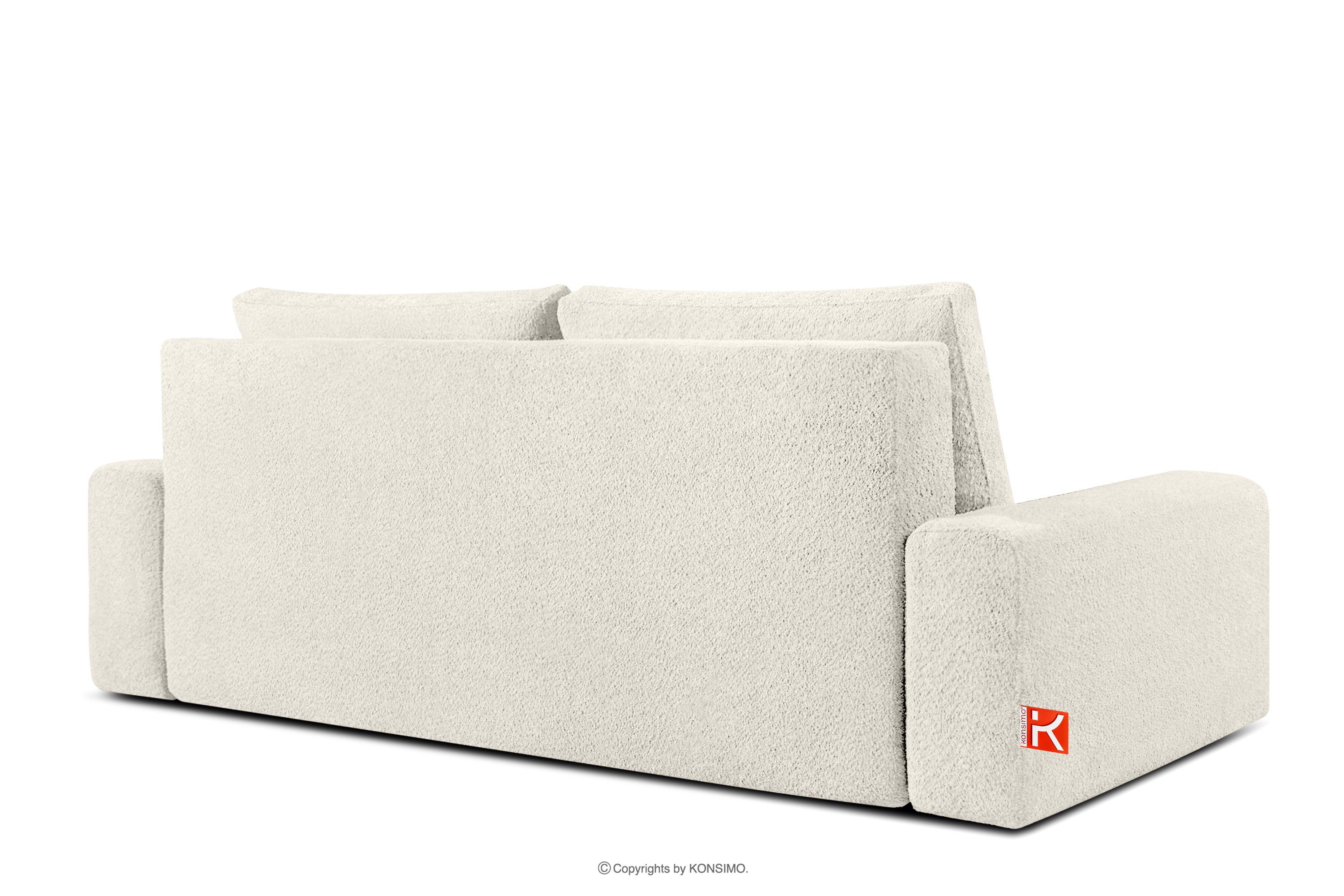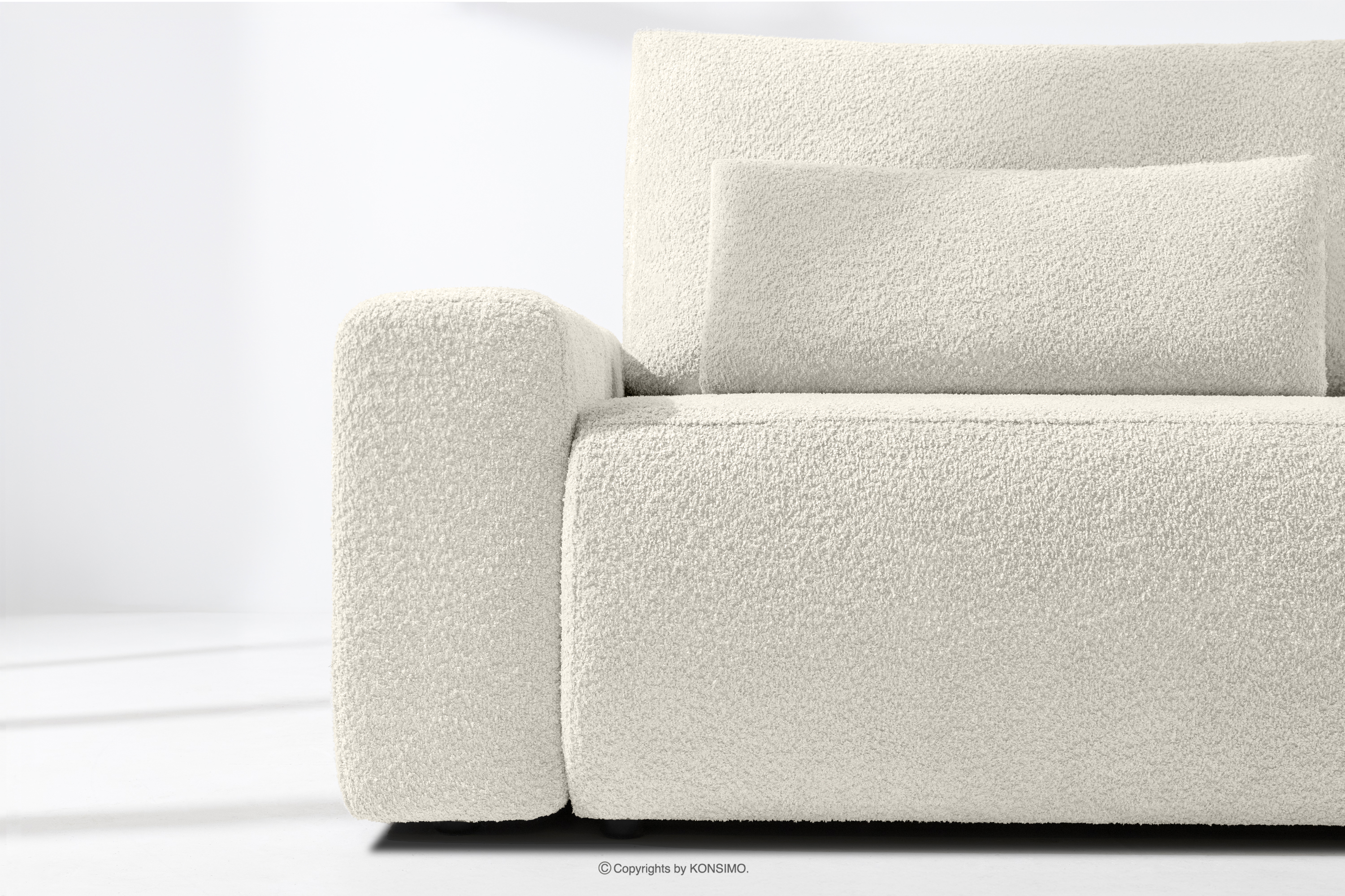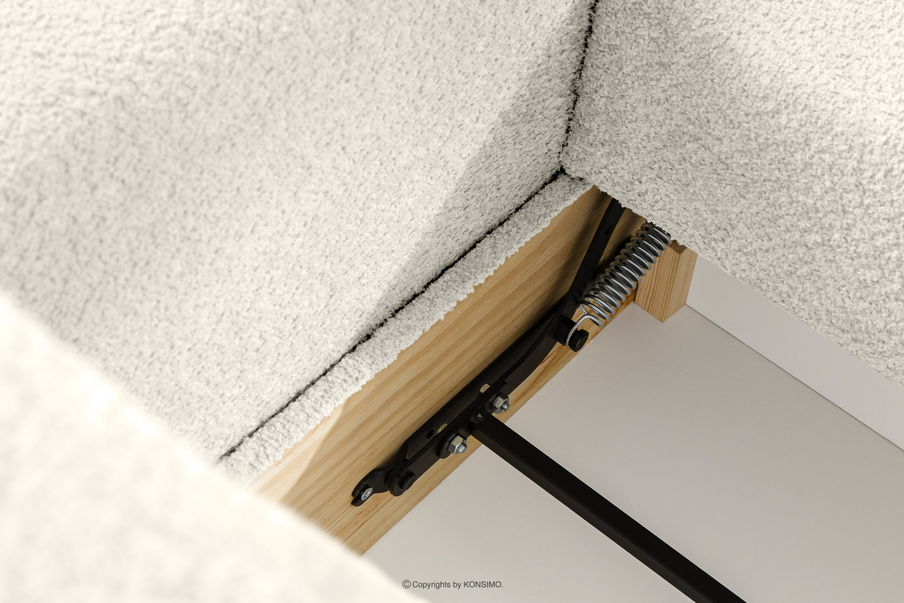 Ausziehbares Sofa mit Kissen Bouclé-Stoff weiß ist der Inbegriff von modernem Komfort und Funktionalität, entworfen mit Blick auf eine zeitgemäße Innenausstattung und die Anforderungen des täglichen Gebrauchs. Das elegante, minimalistische Design harmoniert mit der durchdachten Konstruktion, die Ästhetik und Funktionalität vereint. Es ist mit einem Aufklappsystem vom Typ DL und einem Bettwäschebehälter ausgestattet und somit die perfekte Lösung für kleine Wohnungen oder Gästezimmer.