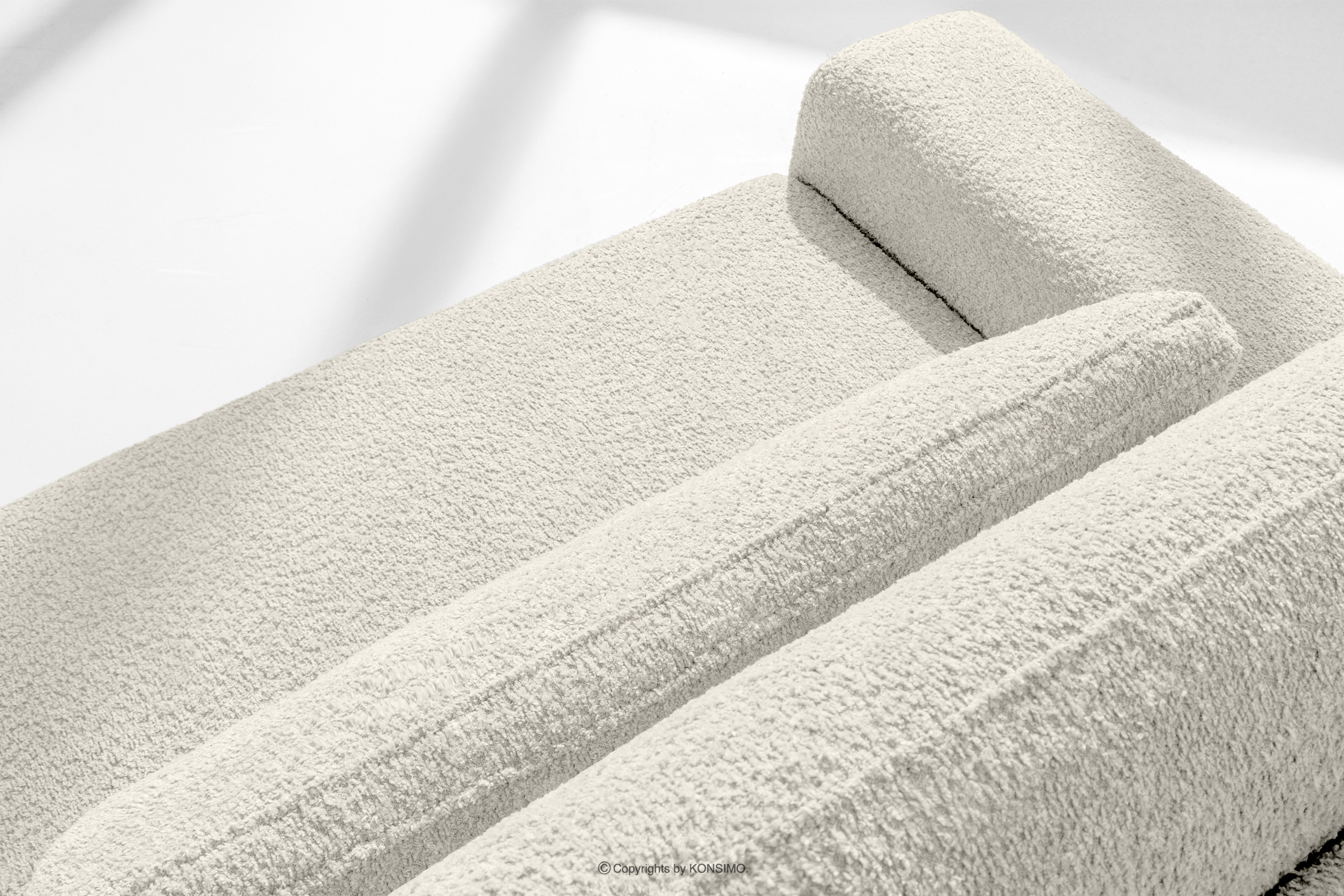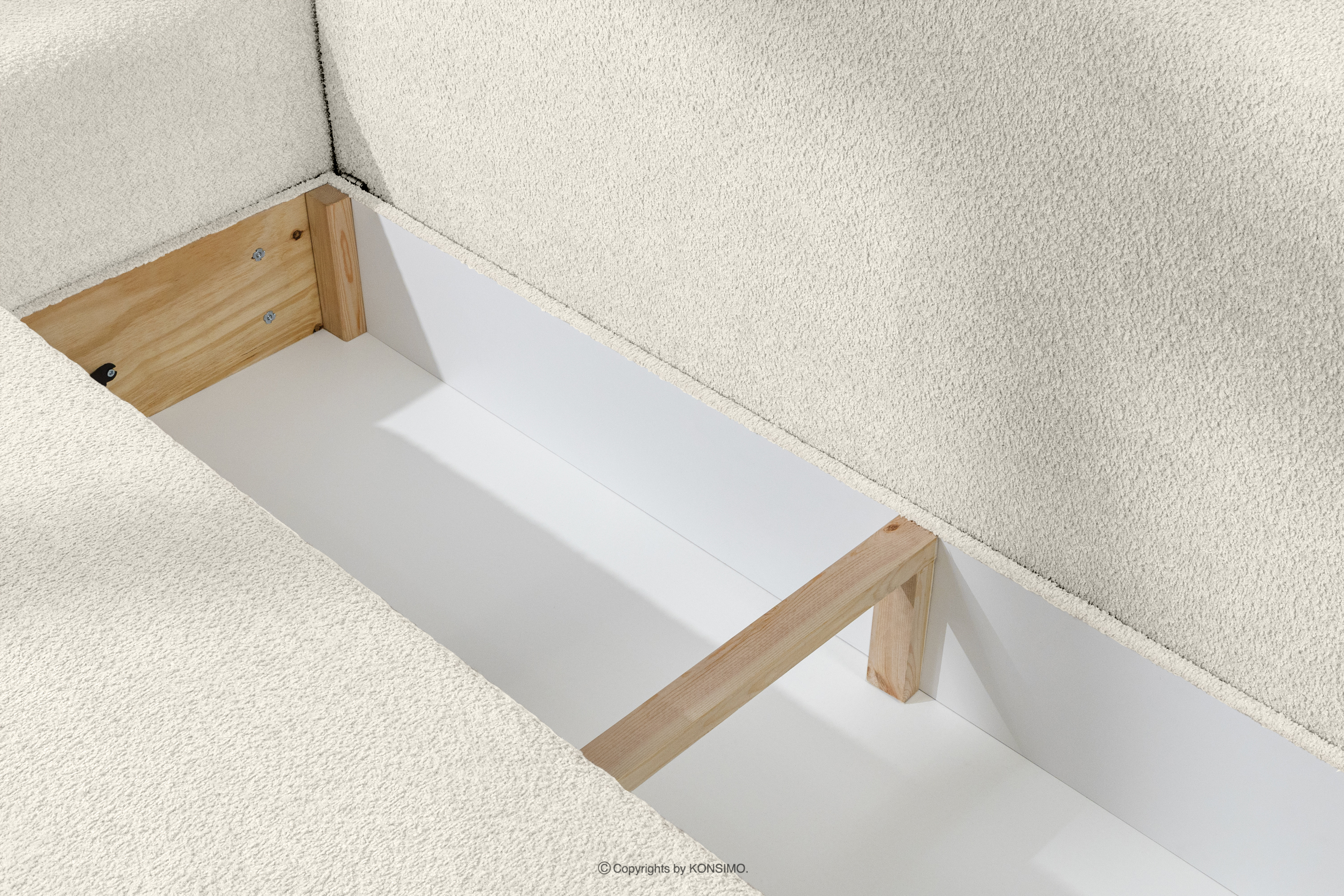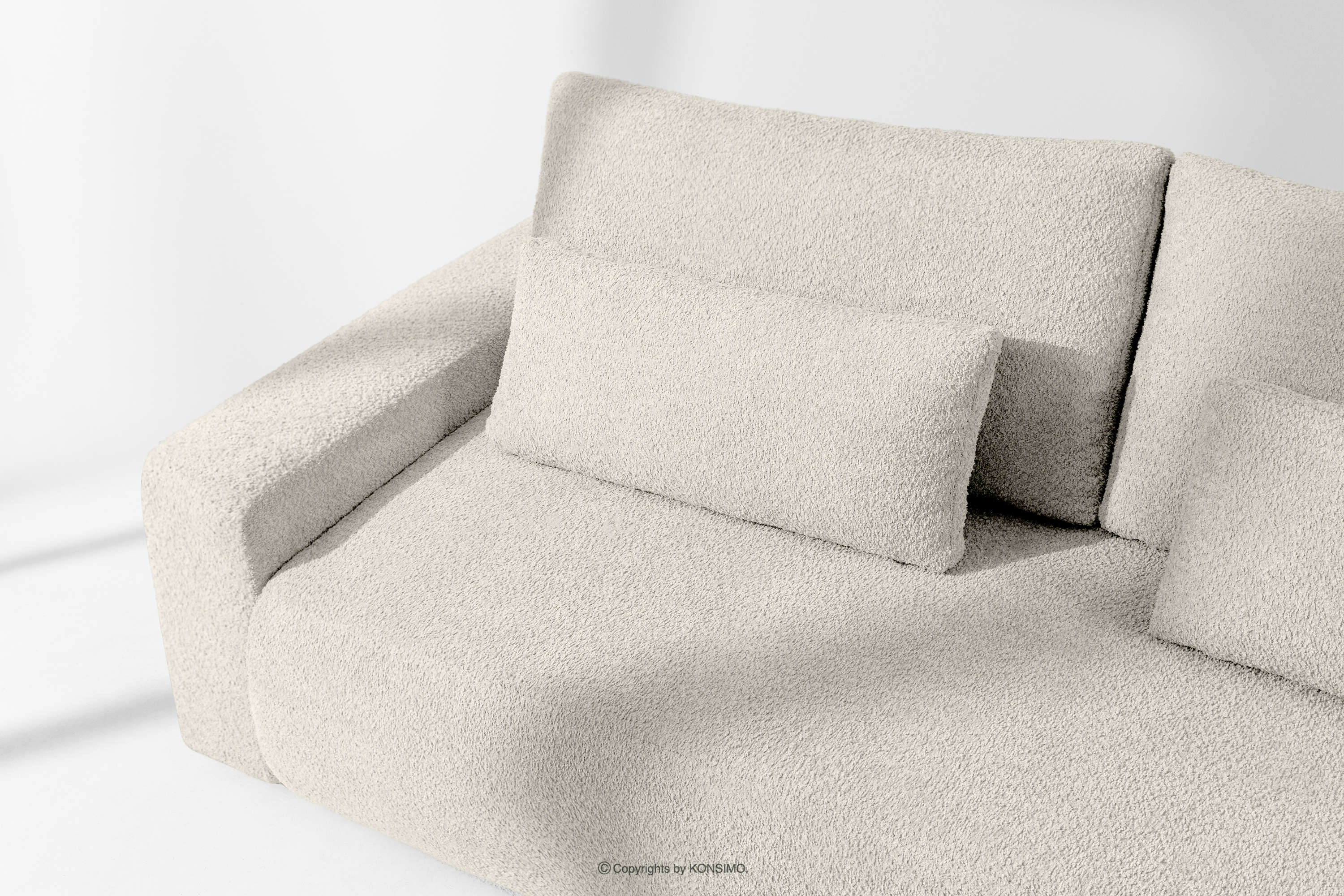 Ausziehbares Sofa mit Kissen Bouclé-Stoff weiß ist der Inbegriff von modernem Komfort und Funktionalität, entworfen mit Blick auf eine zeitgemäße Innenausstattung und die Anforderungen des täglichen Gebrauchs. Das elegante, minimalistische Design harmoniert mit der durchdachten Konstruktion, die Ästhetik und Funktionalität vereint. Es ist mit einem Aufklappsystem vom Typ DL und einem Bettwäschebehälter ausgestattet und somit die perfekte Lösung für kleine Wohnungen oder Gästezimmer.