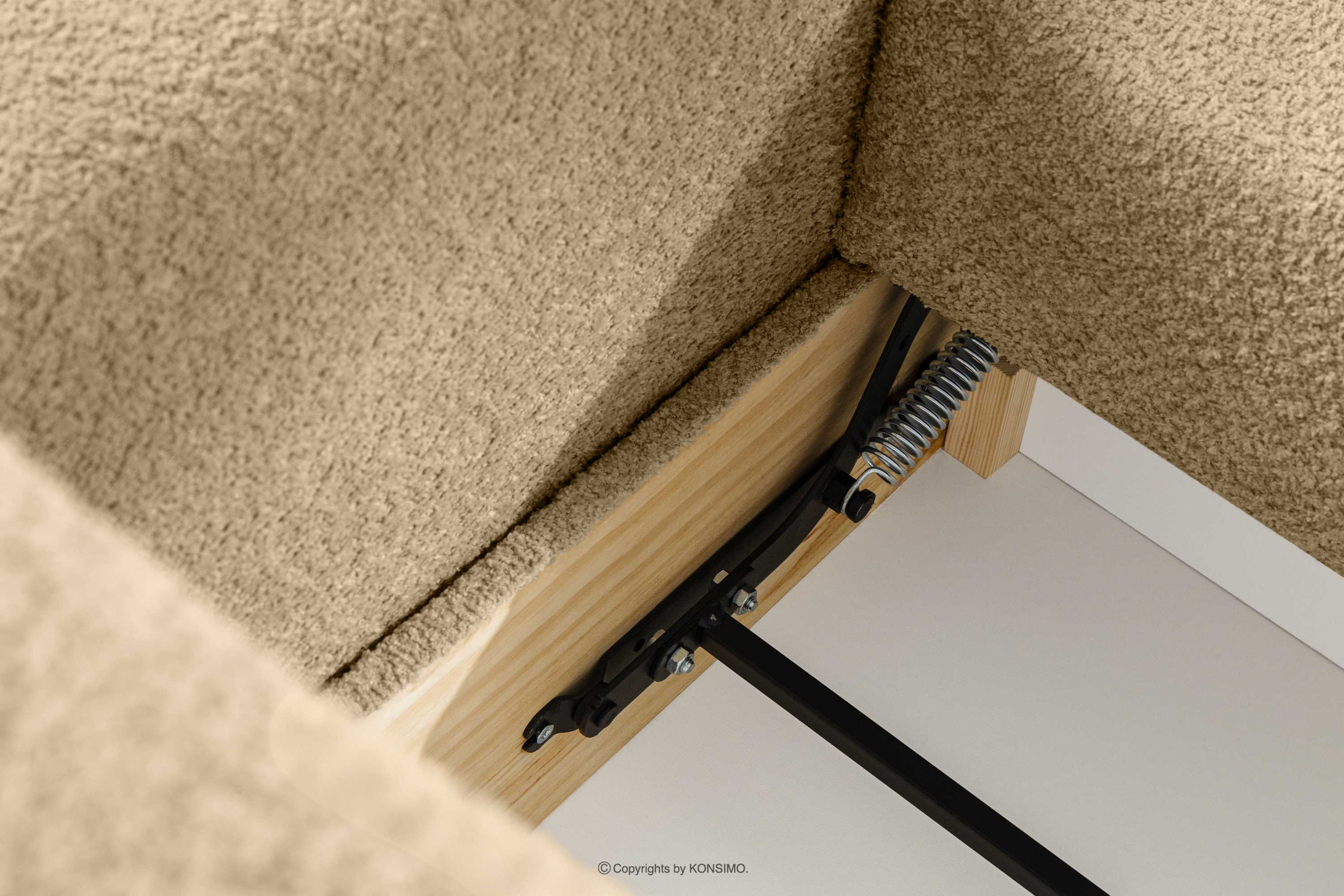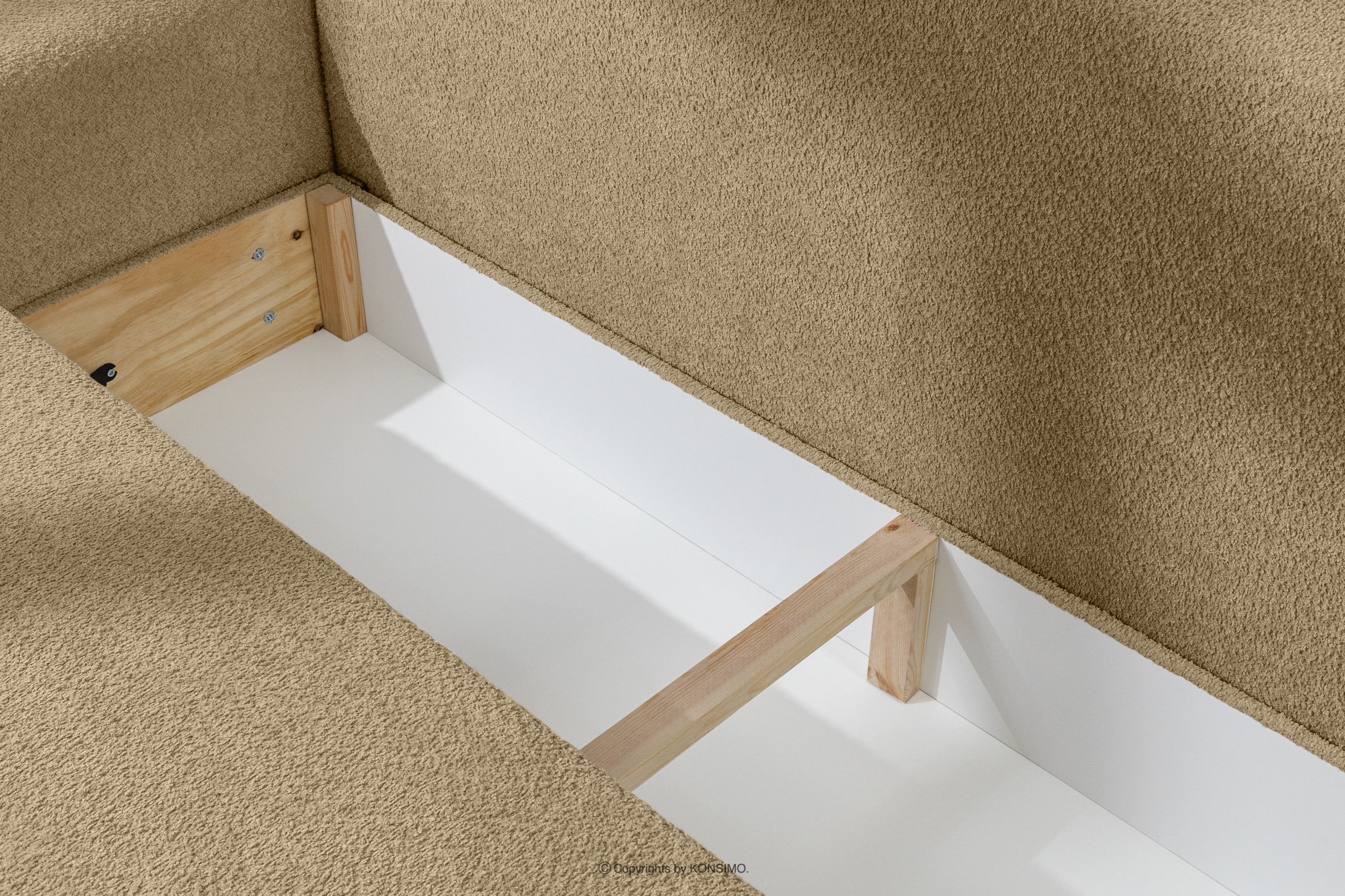 Ausziehbares Sofa mit Kissen Bouclé-Stoff dunkelbeige ist der Inbegriff von modernem Komfort und Funktionalität, entworfen mit Blick auf eine zeitgemäße Innenausstattung und die Anforderungen des täglichen Gebrauchs. Das elegante, minimalistische Design harmoniert mit der durchdachten Konstruktion, die Ästhetik und Funktionalität vereint. Es ist mit einem Aufklappsystem vom Typ DL und einem Bettwäschebehälter ausgestattet und somit die perfekte Lösung für kleine Wohnungen oder Gästezimmer.