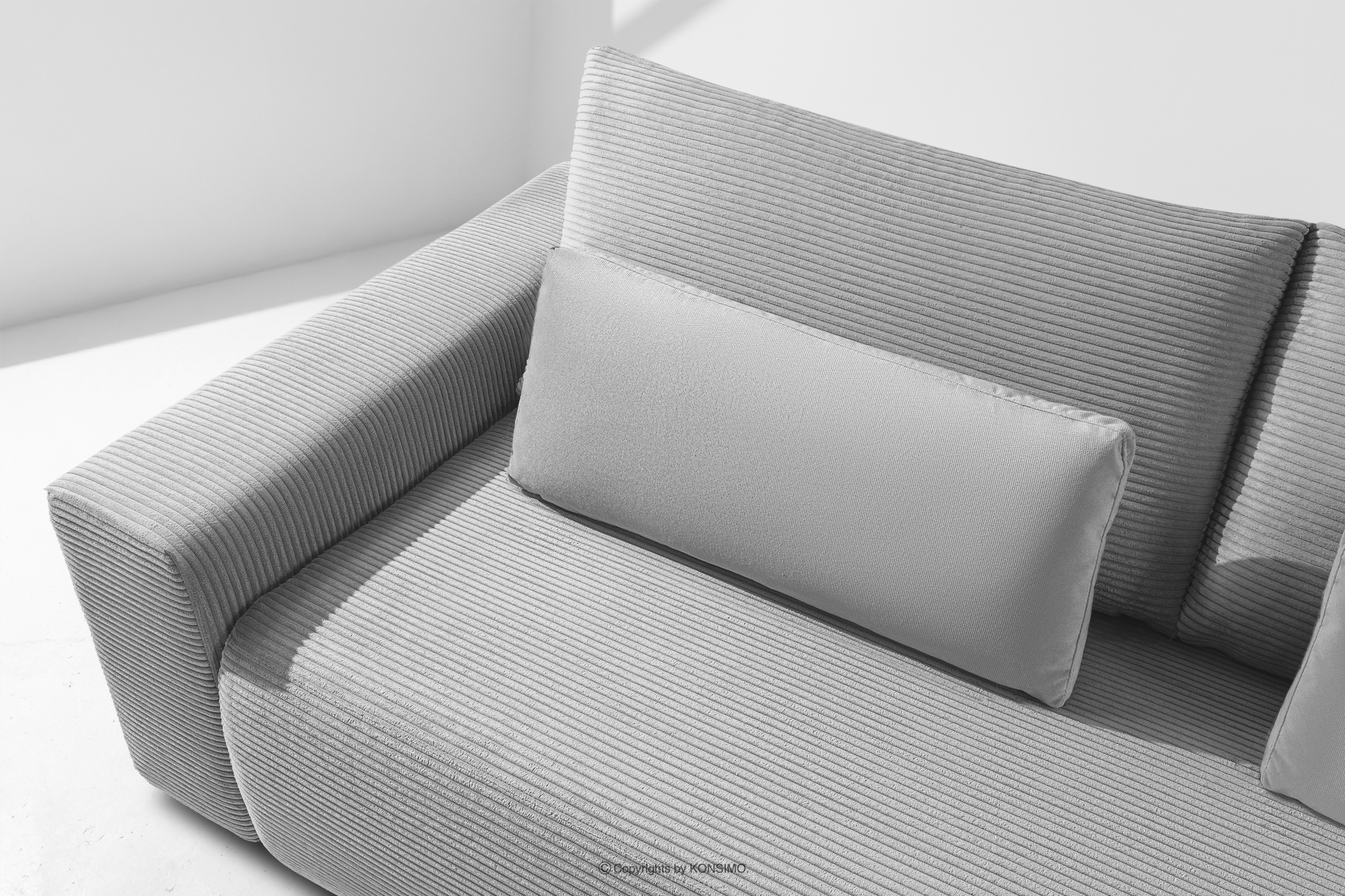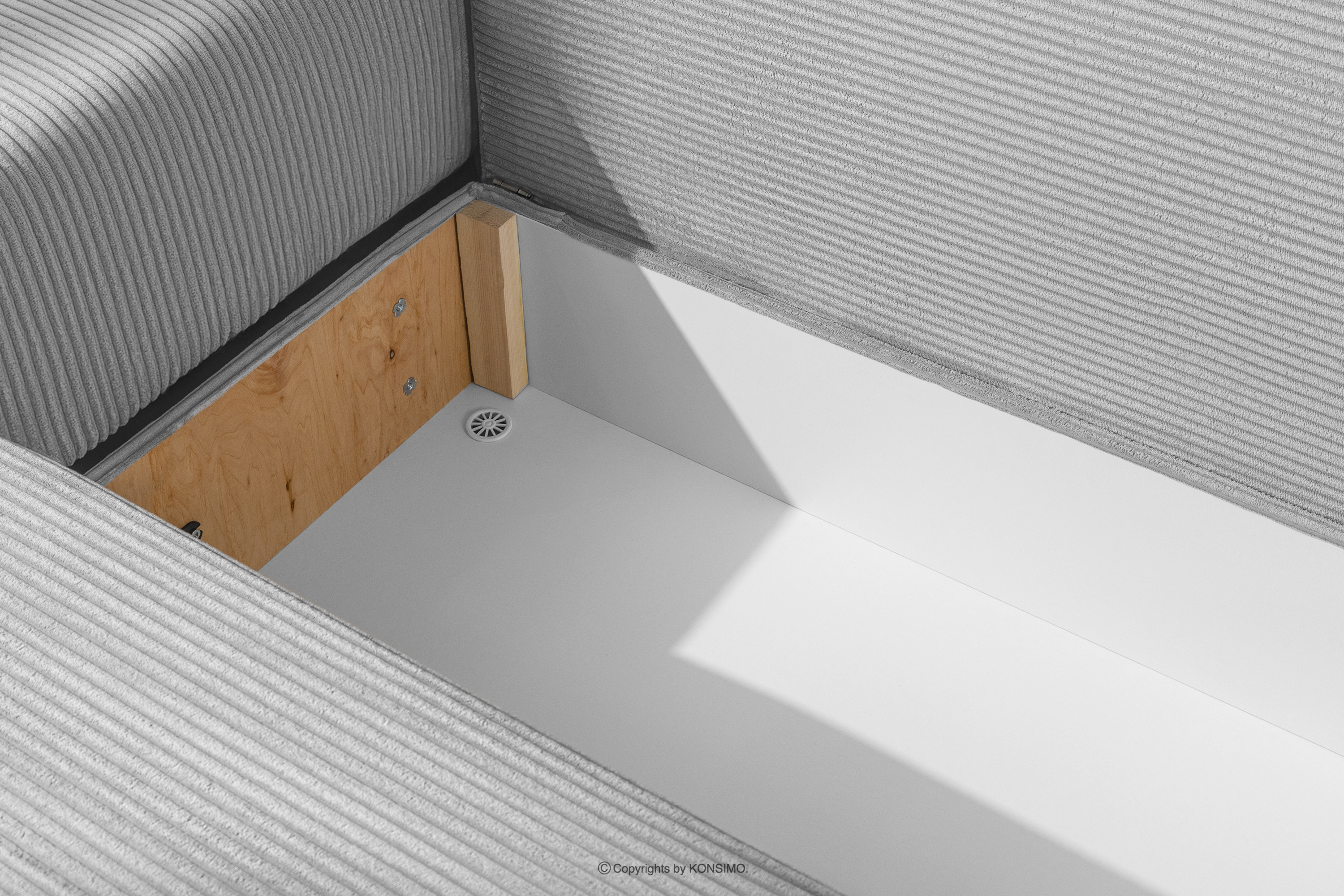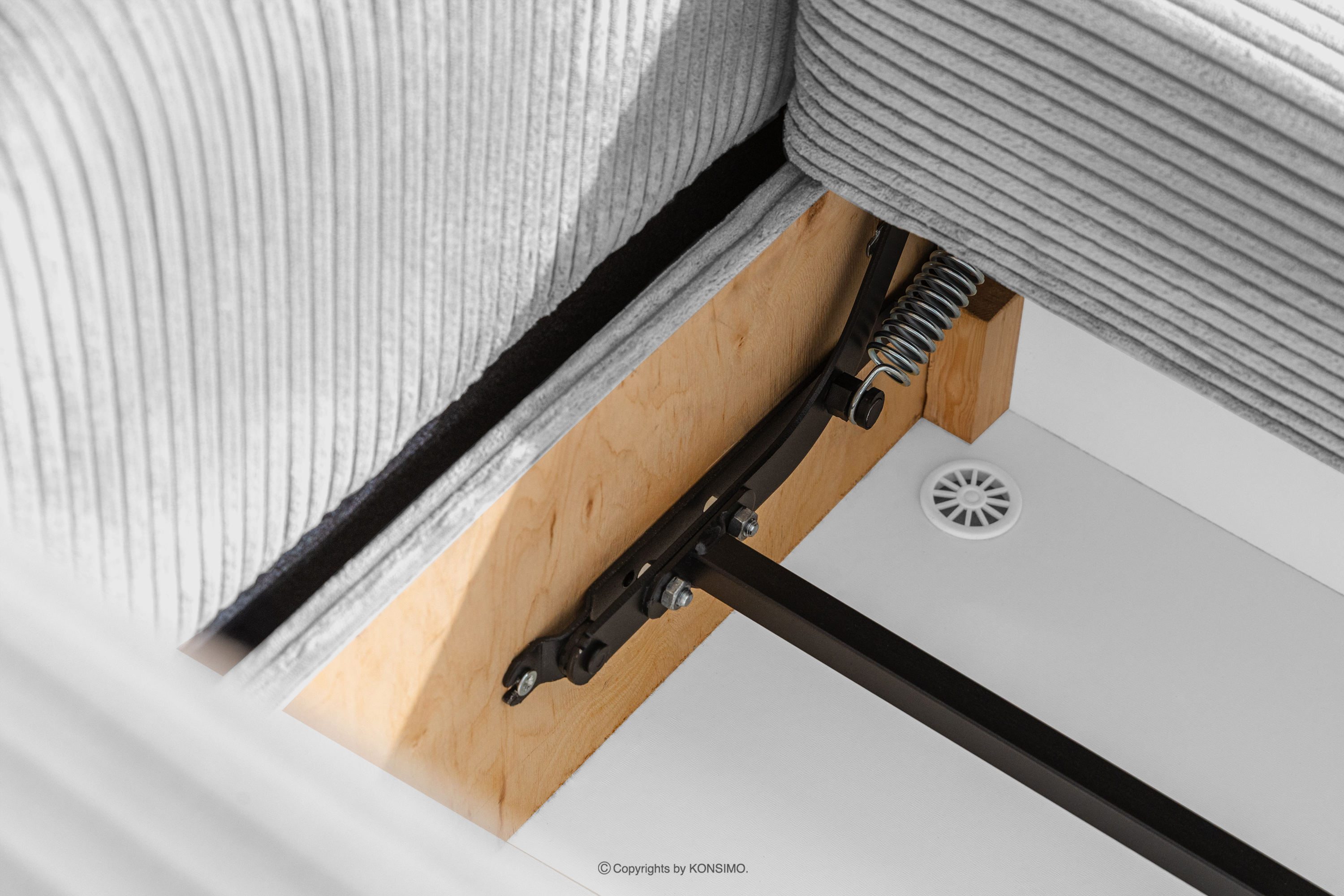 Ausziehbares Sofa mit Kissen Kordstoff / Velours hellgrau ist der Inbegriff von modernem Komfort und Funktionalität, entworfen mit Blick auf eine zeitgemäße Innenausstattung und die Anforderungen des täglichen Gebrauchs. Das elegante, minimalistische Design harmoniert mit der durchdachten Konstruktion, die Ästhetik und Funktionalität vereint. Es ist mit einem Aufklappsystem vom Typ DL und einem Bettwäschebehälter ausgestattet und somit die perfekte Lösung für kleine Wohnungen oder Gästezimmer.