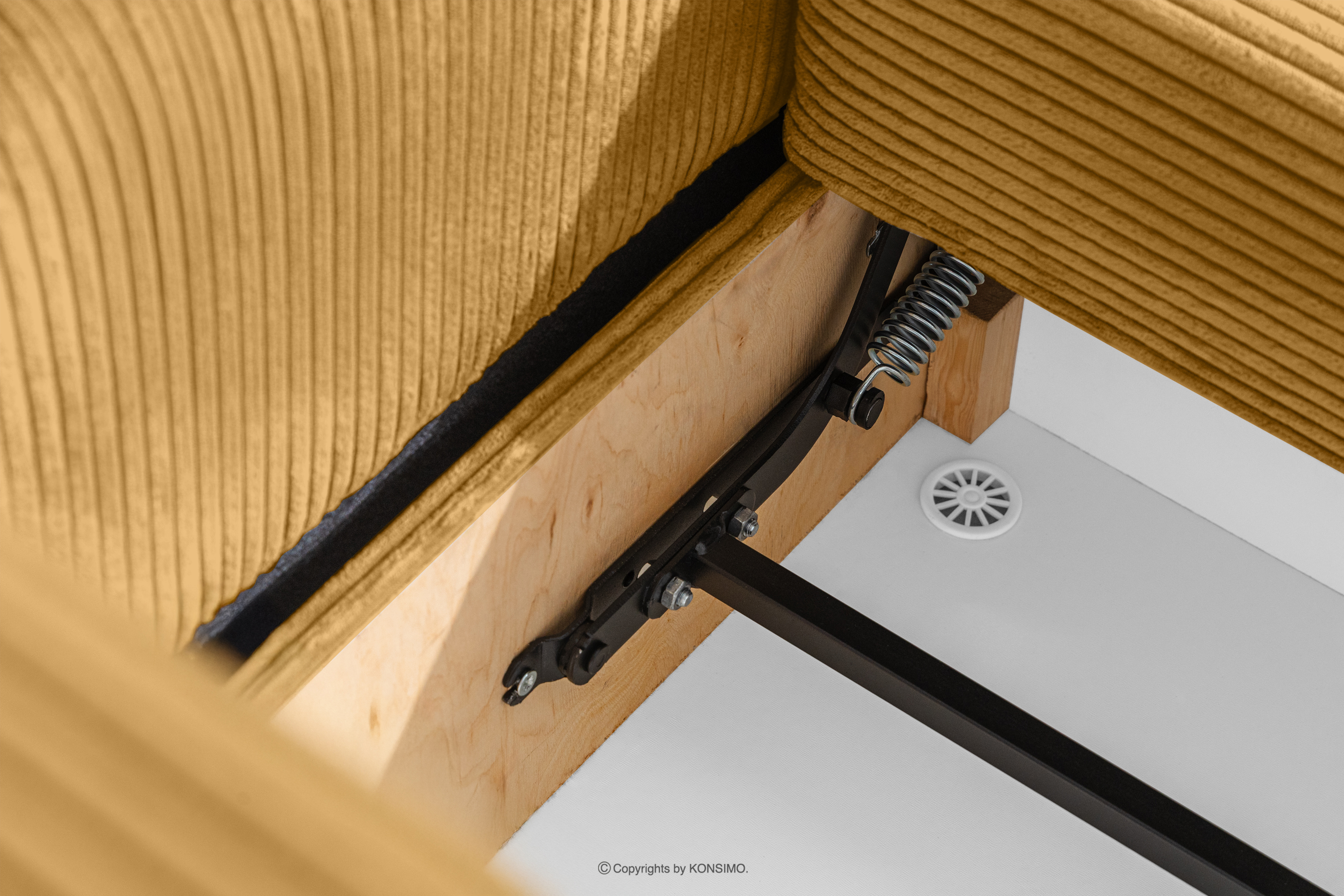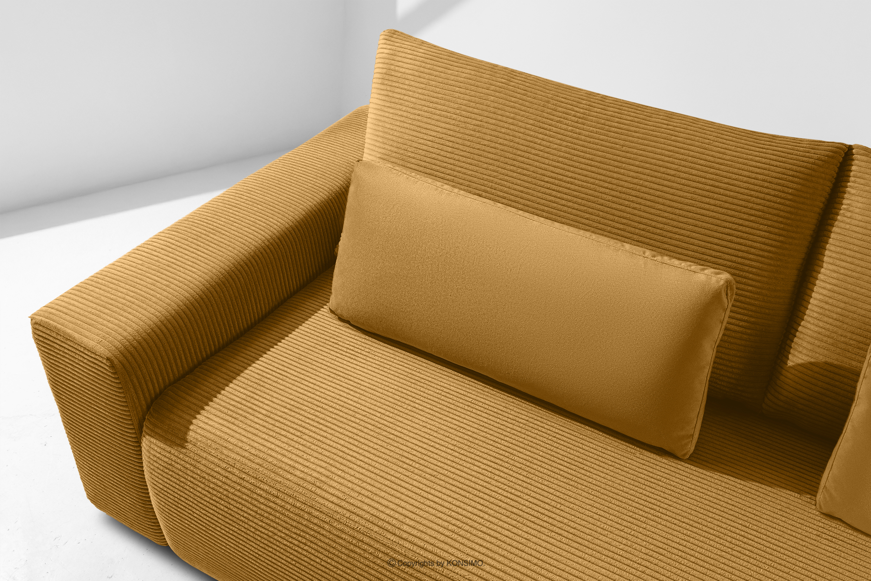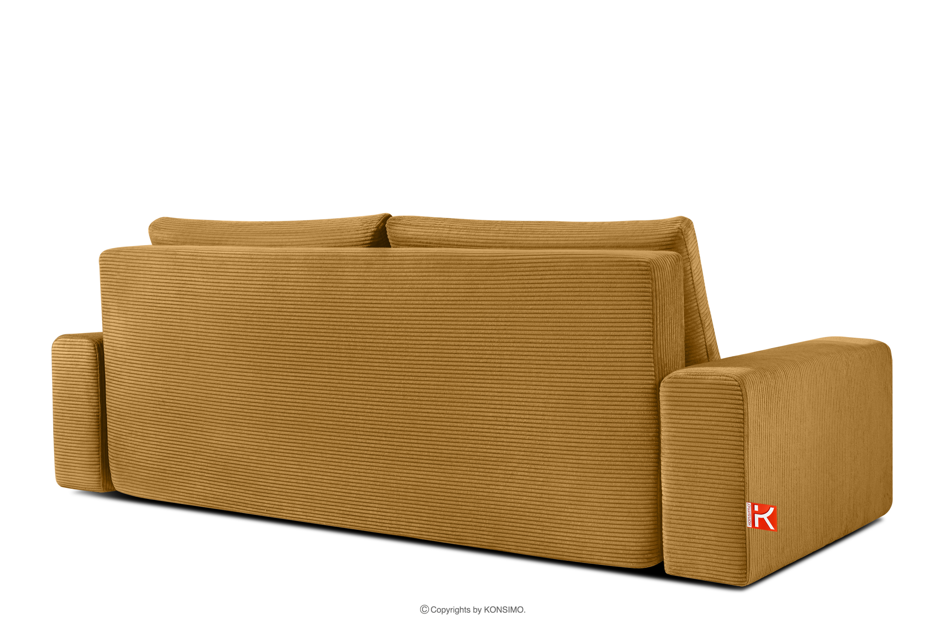 Dreisitzer-Sofa mit Kissen ausziehbar Kordstoff / Velours gelb ist der Inbegriff von modernem Komfort und Funktionalität, entworfen mit Blick auf eine zeitgemäße Innenausstattung und die Anforderungen des täglichen Gebrauchs. Das elegante, minimalistische Design harmoniert mit der durchdachten Konstruktion, die Ästhetik und Funktionalität vereint. Es ist mit einem Aufklappsystem vom Typ DL und einem Bettwäschebehälter ausgestattet und somit die perfekte Lösung für kleine Wohnungen oder Gästezimmer.
