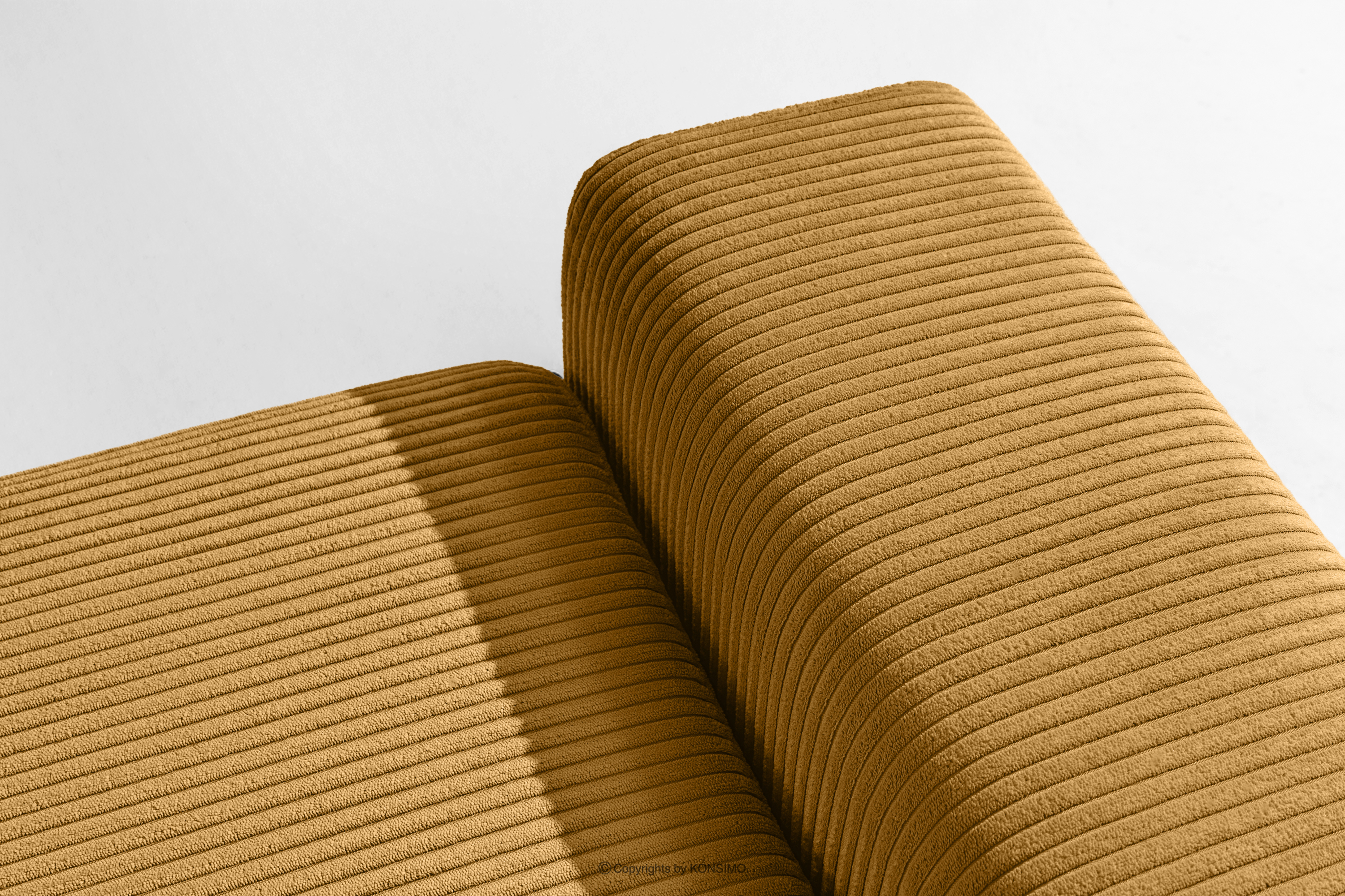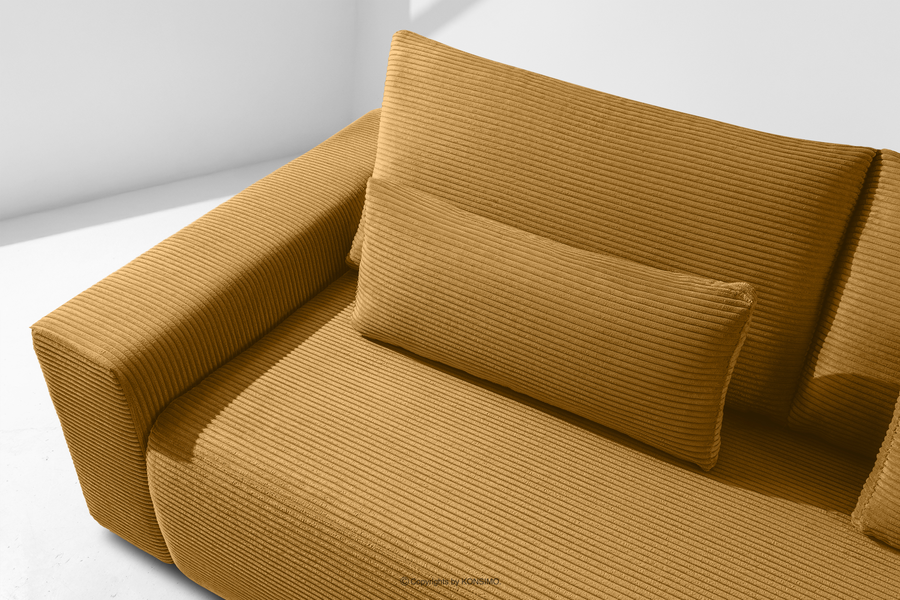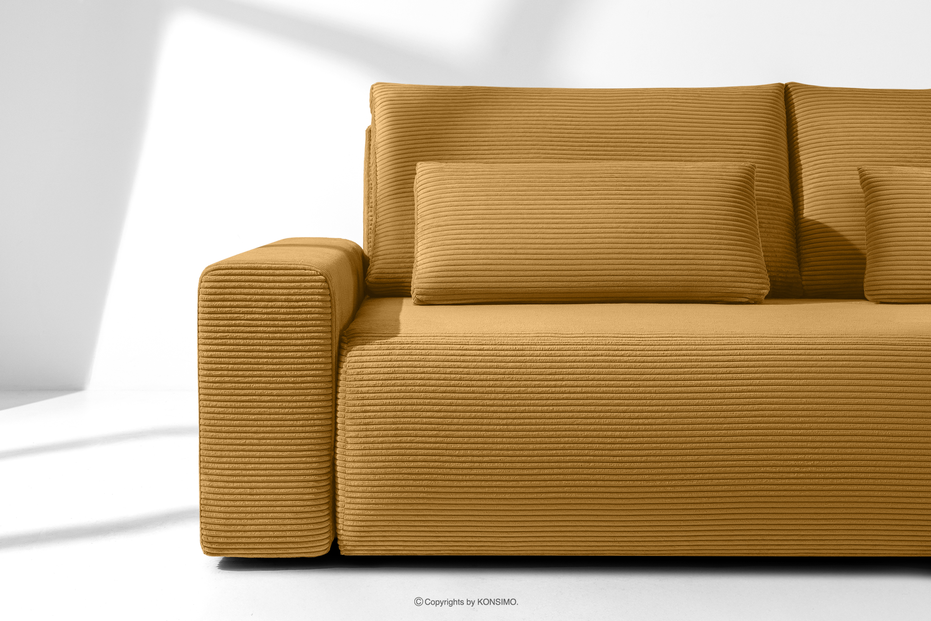 Dreisitzer-Sofa mit Kissen Kordstoff gelb ausziehbar ist der Inbegriff von modernem Komfort und Funktionalität, entworfen mit Blick auf eine zeitgemäße Innenausstattung und die Anforderungen des täglichen Gebrauchs. Das elegante, minimalistische Design harmoniert mit der durchdachten Konstruktion, die Ästhetik und Funktionalität vereint. Es ist mit einem Aufklappsystem vom Typ DL und einem Bettwäschebehälter ausgestattet und somit die perfekte Lösung für kleine Wohnungen oder Gästezimmer.