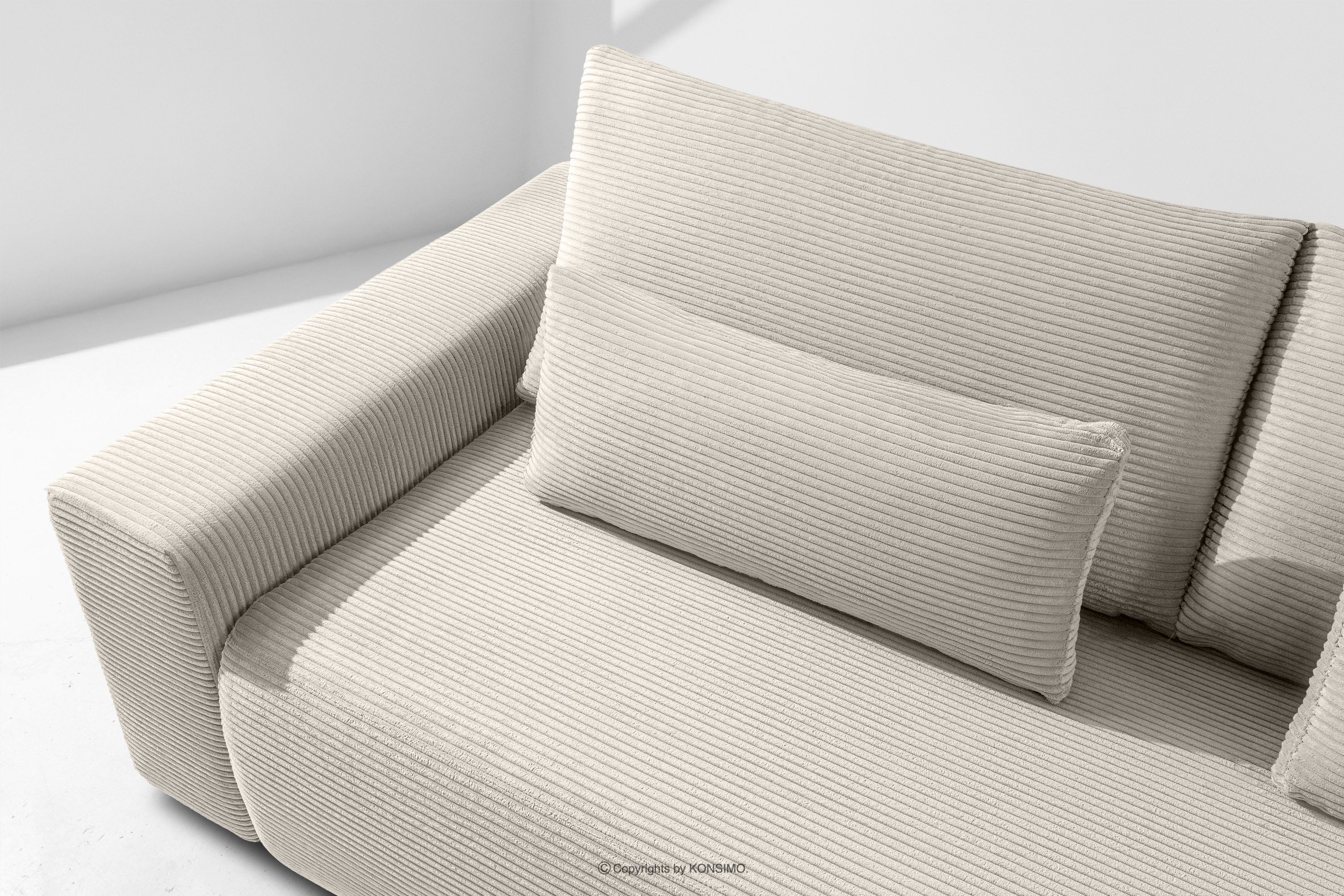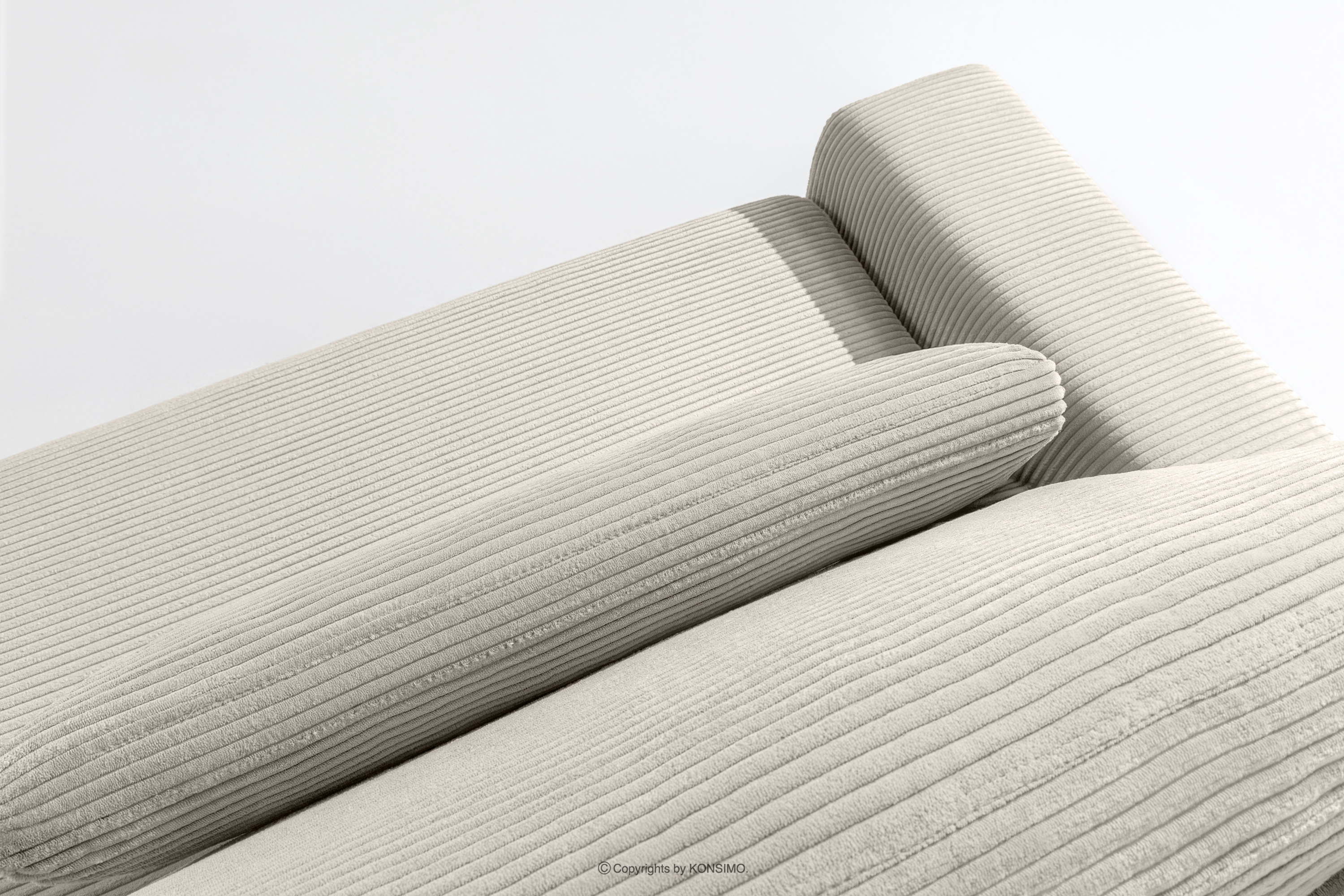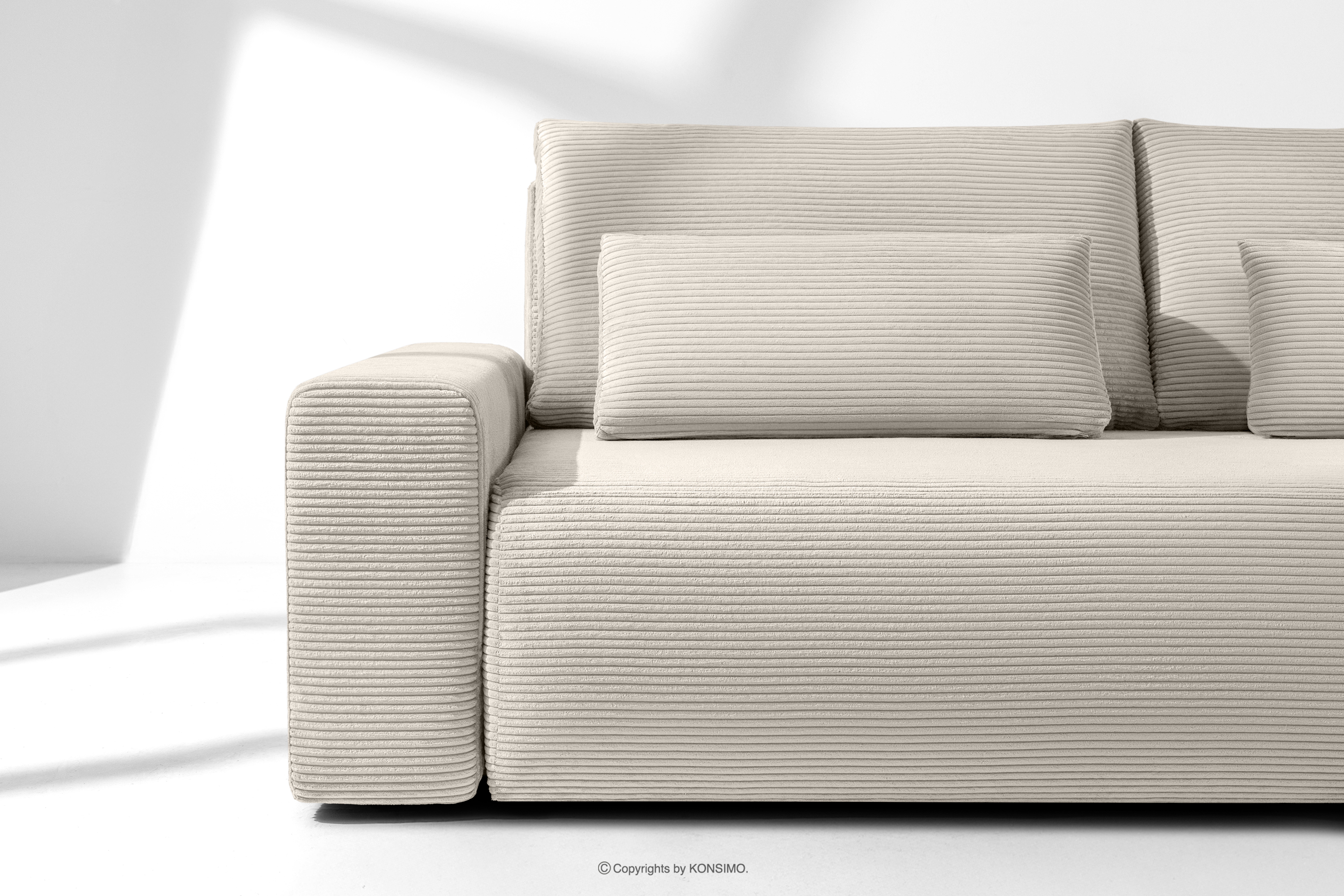 Ausziehbares Sofa mit Kissen Kordstoff-Stoff creme ist der Inbegriff von modernem Komfort und Funktionalität, entworfen mit Blick auf eine zeitgemäße Innenausstattung und die Anforderungen des täglichen Gebrauchs. Das elegante, minimalistische Design harmoniert mit der durchdachten Konstruktion, die Ästhetik und Funktionalität vereint. Es ist mit einem Aufklappsystem vom Typ DL und einem Bettwäschebehälter ausgestattet und somit die perfekte Lösung für kleine Wohnungen oder Gästezimmer.