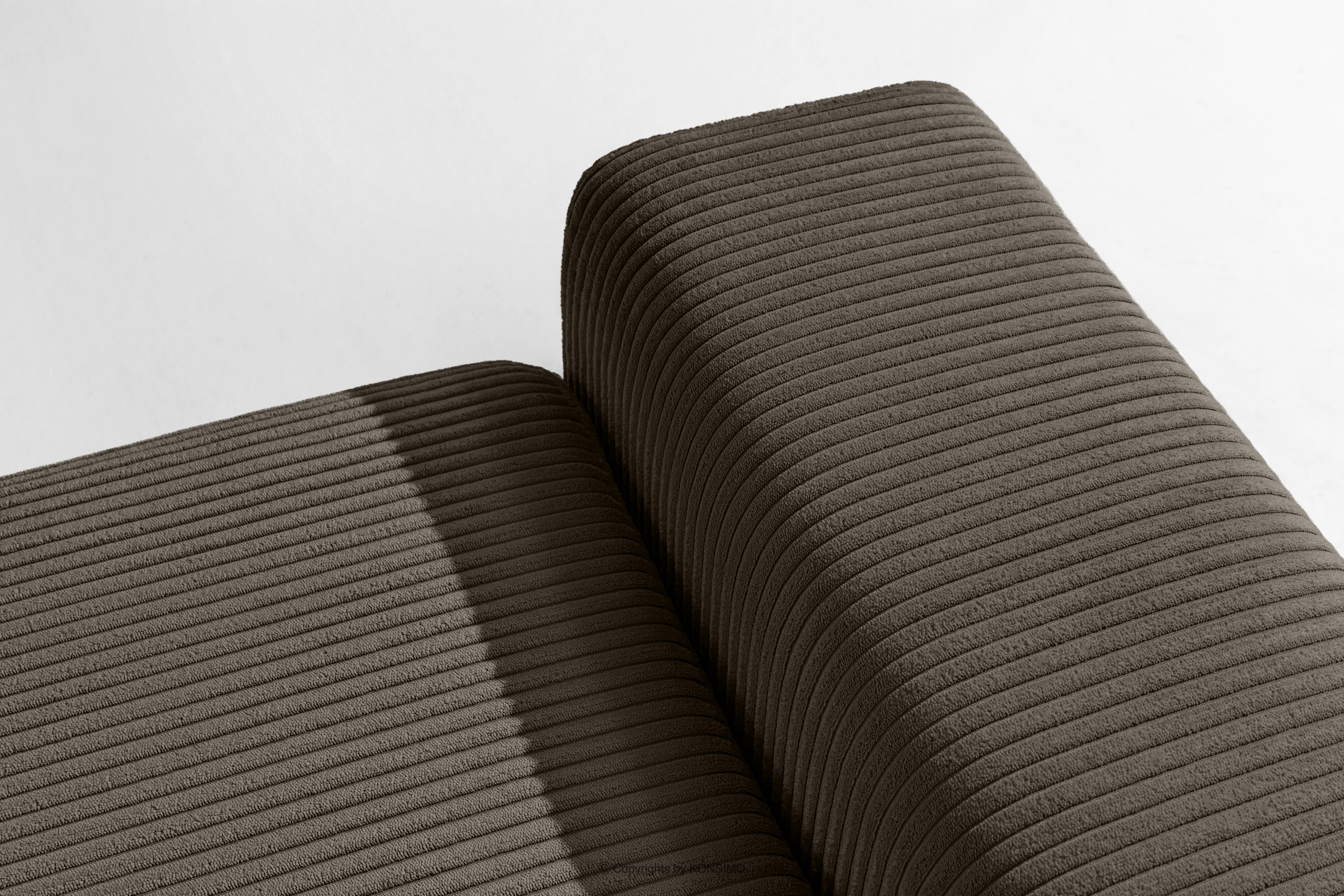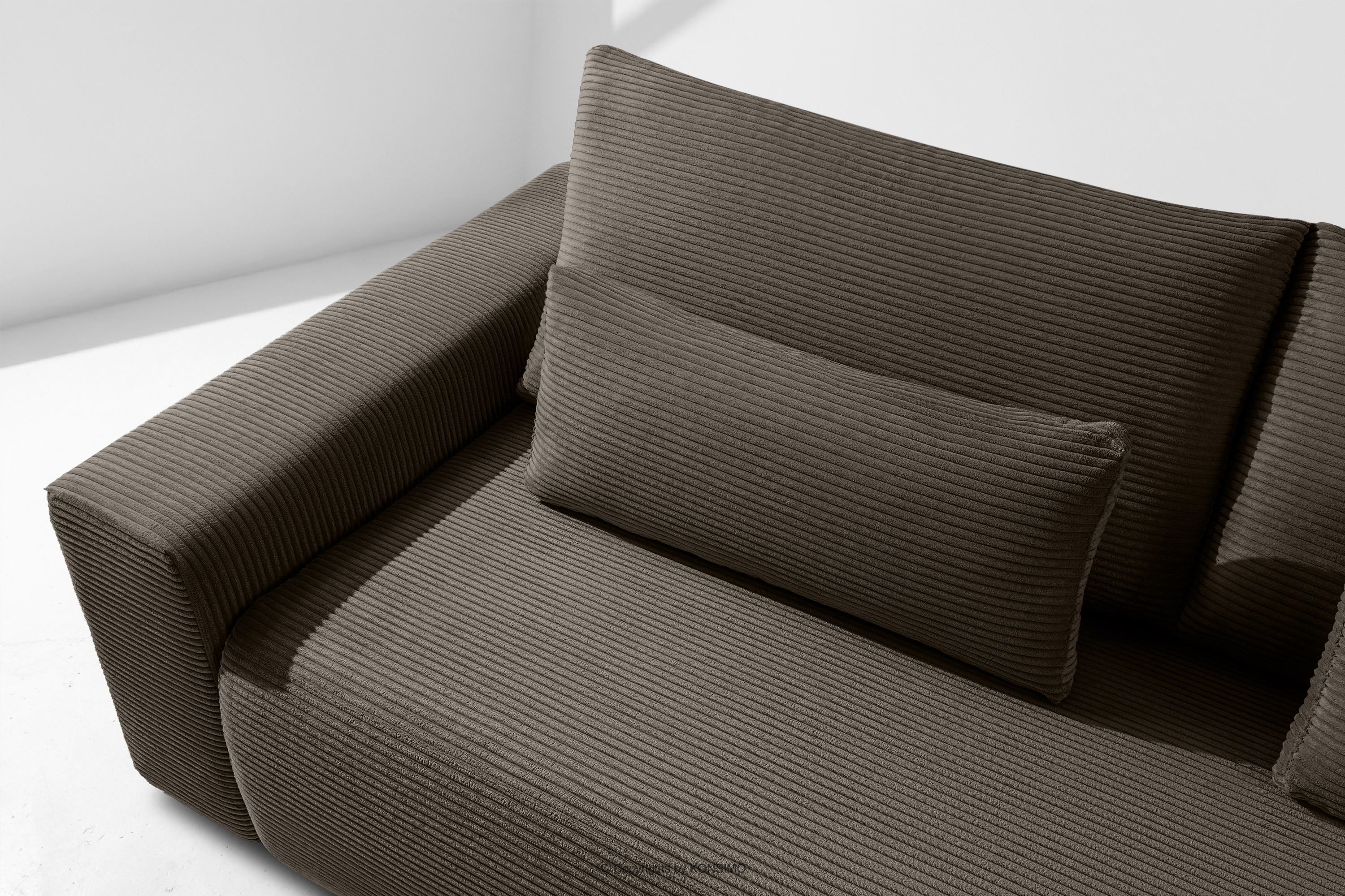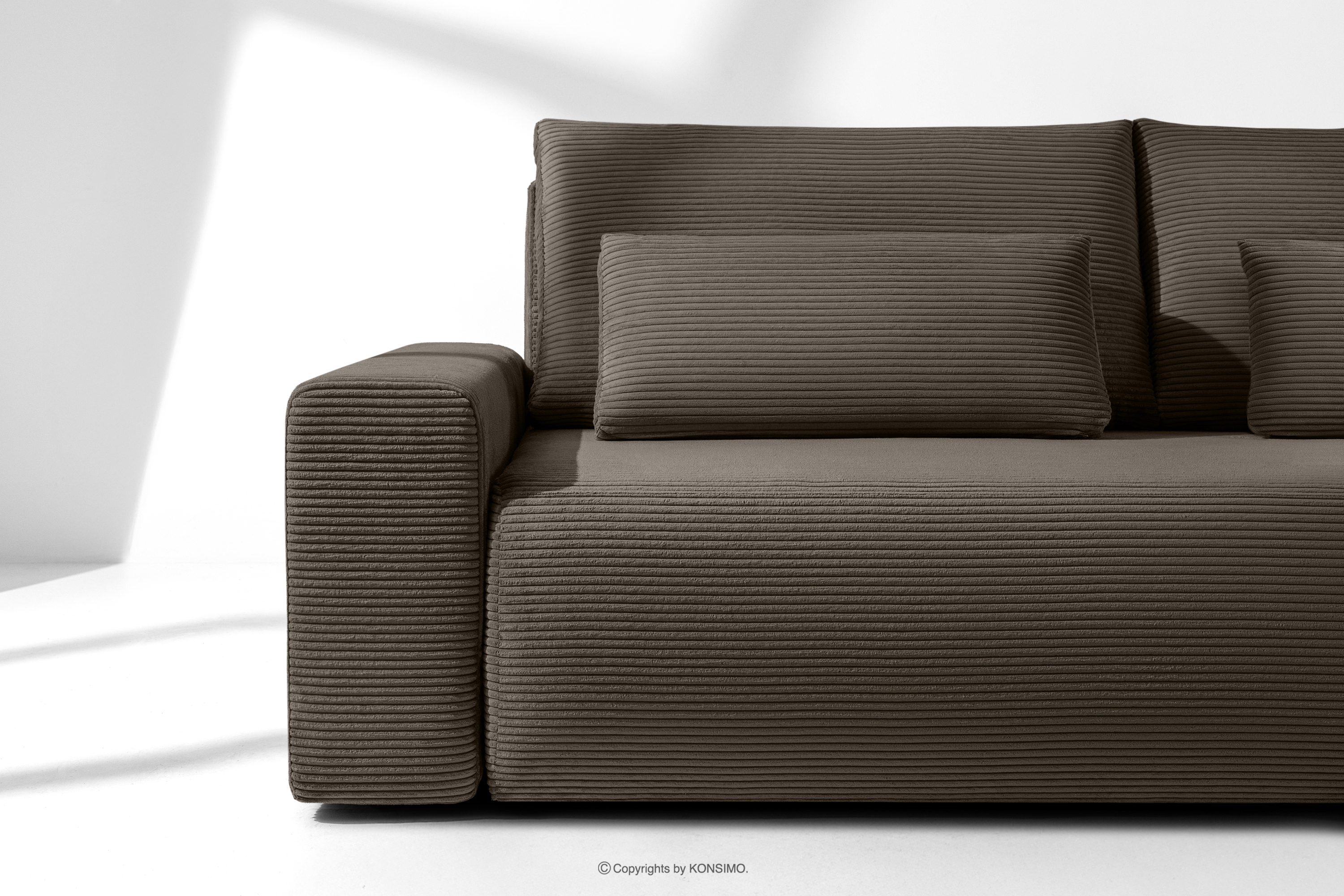 Dreisitzer-Sofa mit Kissen Kordstoff braun ausziehbar ist der Inbegriff von modernem Komfort und Funktionalität, entworfen mit Blick auf eine zeitgemäße Innenausstattung und die Anforderungen des täglichen Gebrauchs. Das elegante, minimalistische Design harmoniert mit der durchdachten Konstruktion, die Ästhetik und Funktionalität vereint. Es ist mit einem Aufklappsystem vom Typ DL und einem Bettwäschebehälter ausgestattet und somit die perfekte Lösung für kleine Wohnungen oder Gästezimmer.