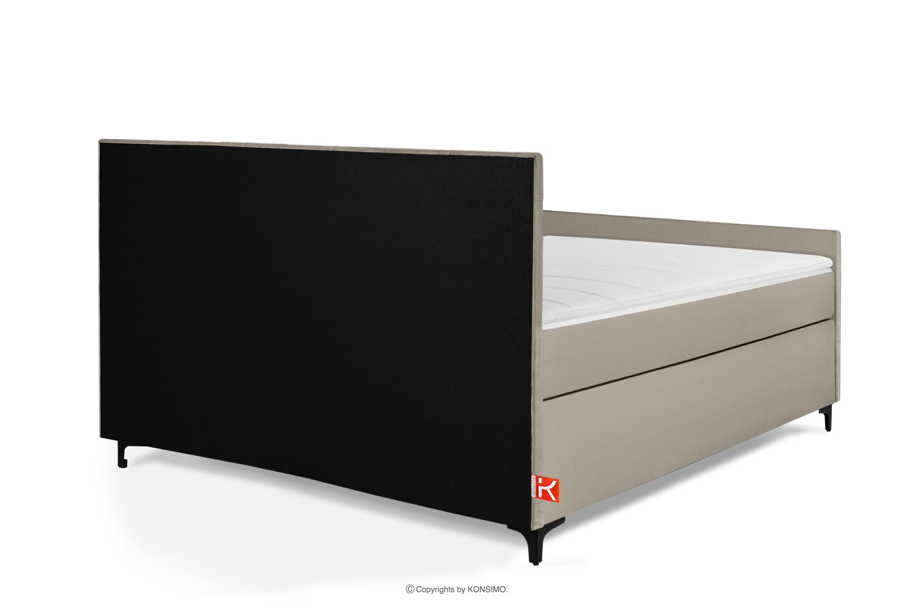 Das Bett wird von vier dekorativen, von außen sichtbaren Metallfüßen getragen, die ihm einen eleganten Touch verleihen, und vier zusätzlichen Kunststoffstützen unter der Box in Schwarz sorgen für Stabilität.