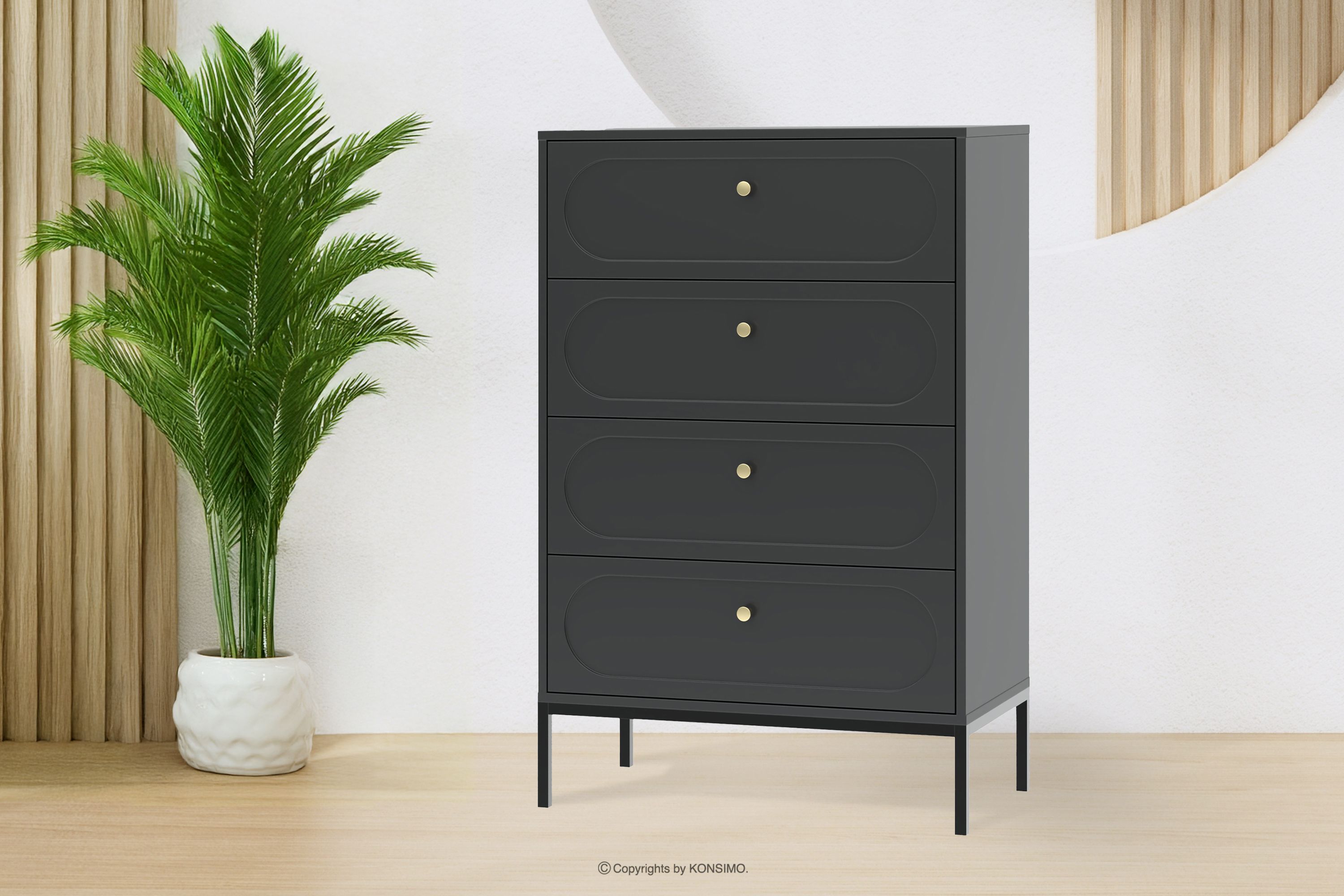 Hohe schwarze Kommode mit Schubladen ist die Quintessenz modernen Designs, das Funktionalität mit raffinierter Ästhetik harmonisch verbindet. Die schwarze Farbgebung verleiht dem Interieur einen Hauch von Modernität und Eleganz und sorgt gleichzeitig für Vielseitigkeit, die eine freie Kombination mit verschiedenen Einrichtungsstilen ermöglicht. Die Fronten aus 18 mm starkem MDF mit perfekt glatter Oberfläche bilden eine minimalistische Form mit kleinen Verzierungen, die einen perfekten Hintergrund für die sorgfältig ausgewählten schwarzen Griffe bildet.