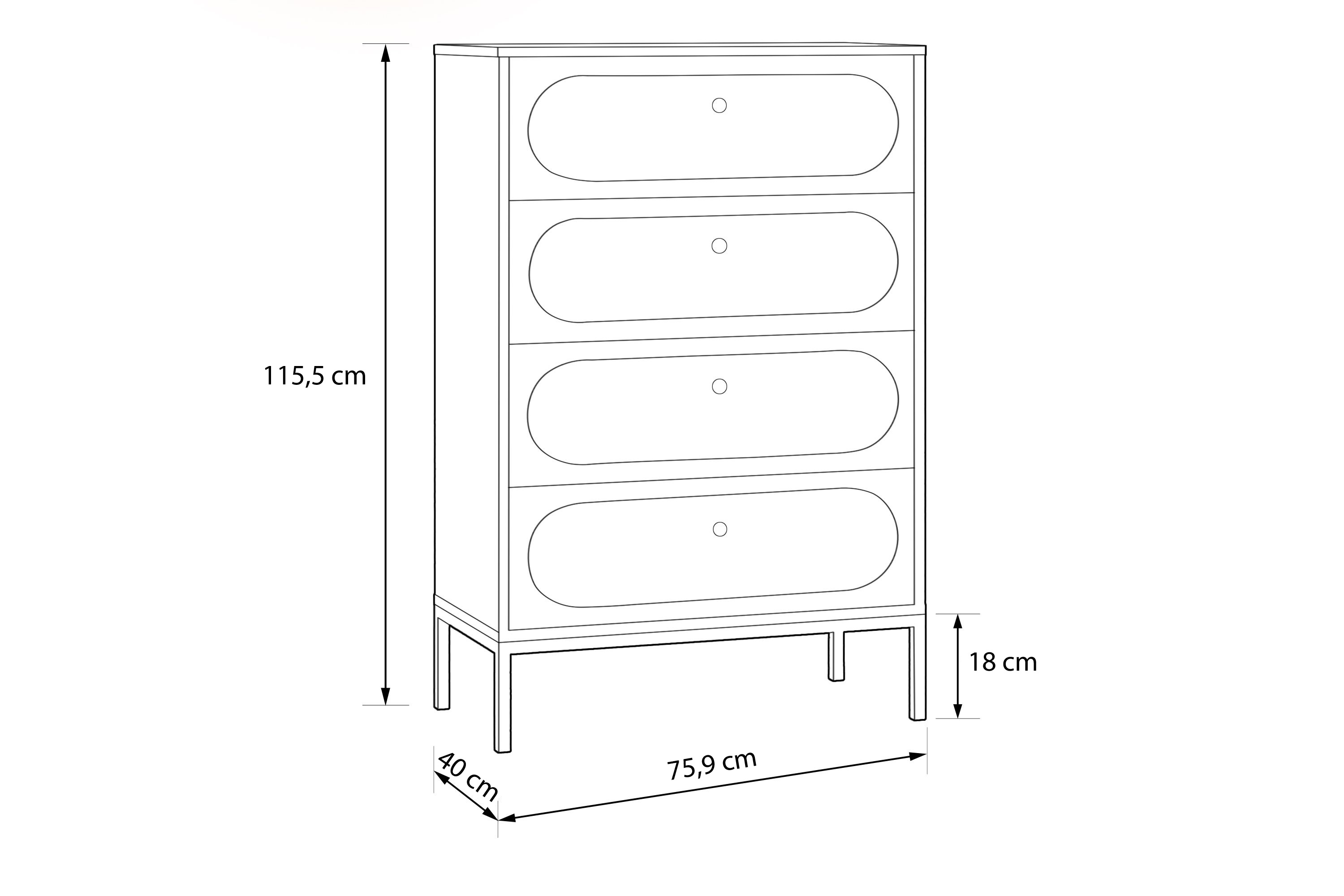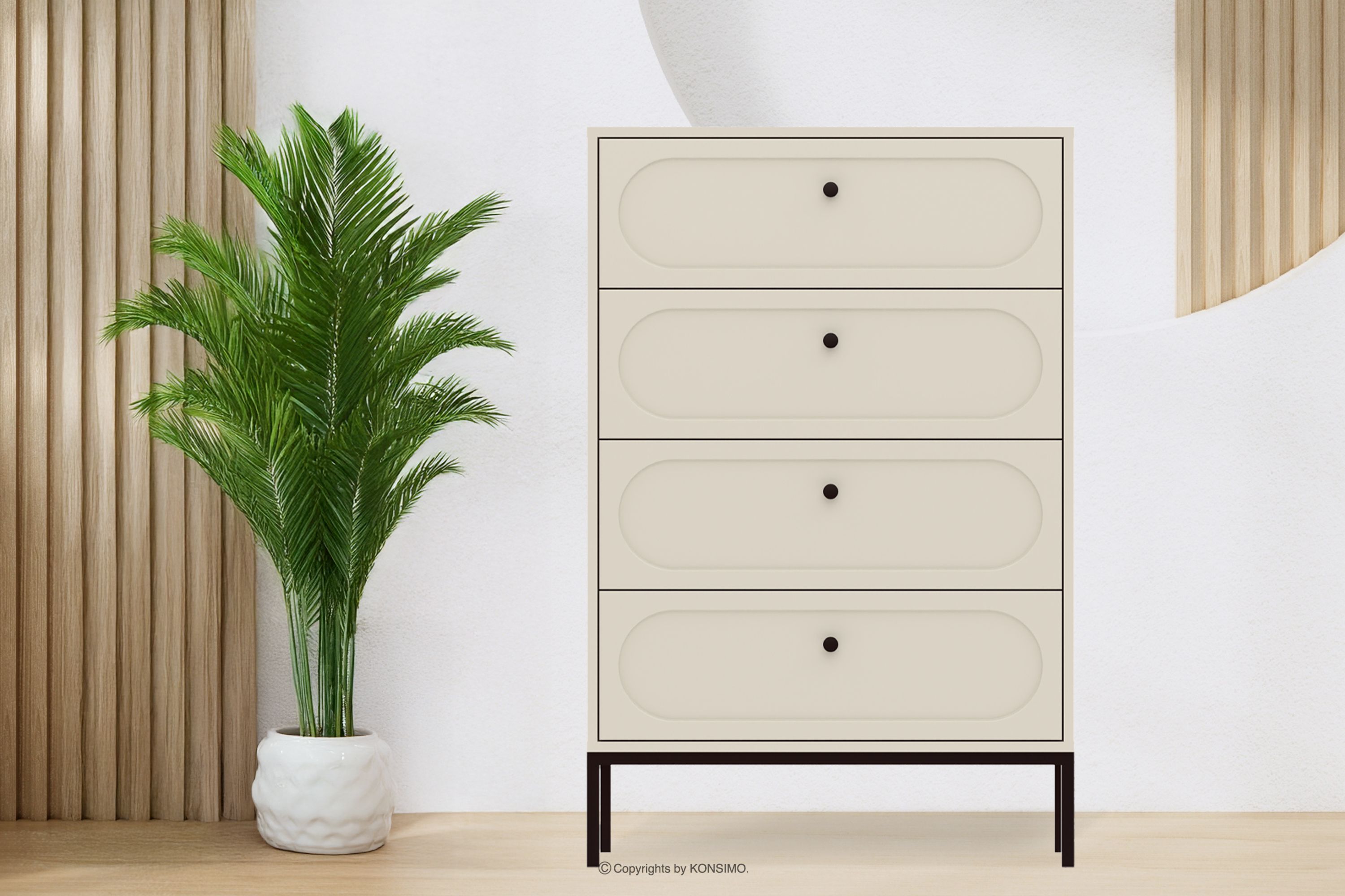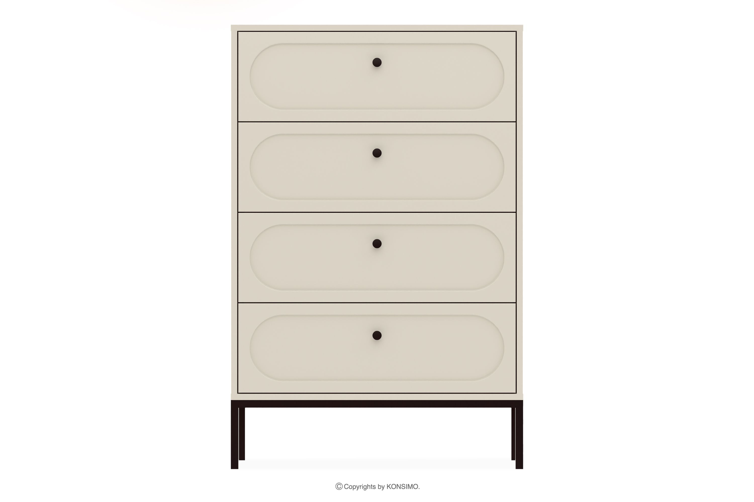 Hohe cremefarbene Kommode mit Schubladen ist die Quintessenz modernen Designs, das Funktionalität mit raffinierter Ästhetik harmonisch verbindet. Die dezente, beige Farbgebung verleiht dem Interieur einen Hauch von Modernität und Eleganz und sorgt gleichzeitig für Vielseitigkeit, die eine freie Kombination mit verschiedenen Einrichtungsstilen ermöglicht. Die Fronten aus 18 mm starkem MDF mit perfekt glatter Oberfläche bilden eine minimalistische Form mit kleinen Verzierungen, die einen perfekten Hintergrund für die sorgfältig ausgewählten schwarzen Griffe bildet.