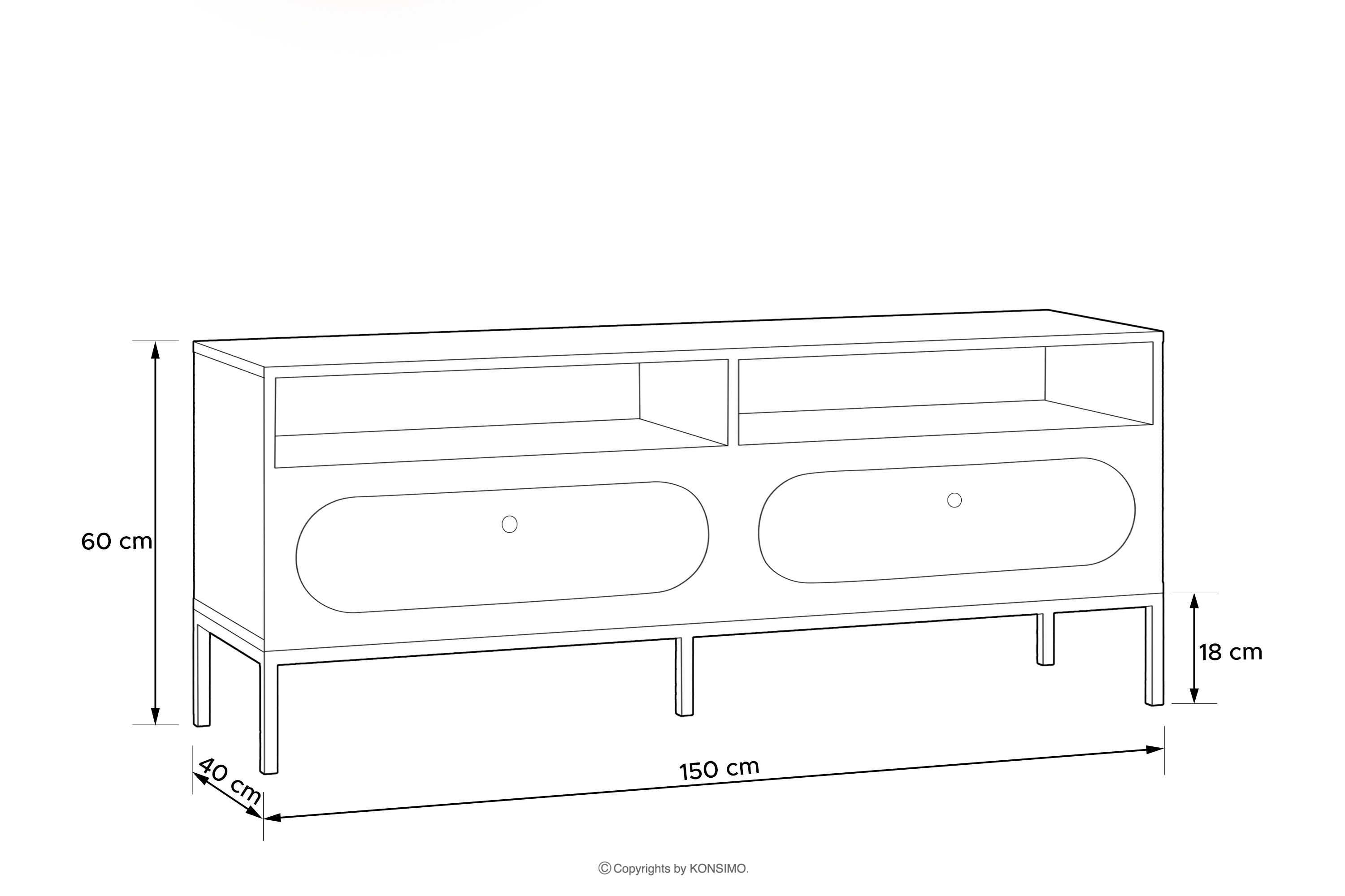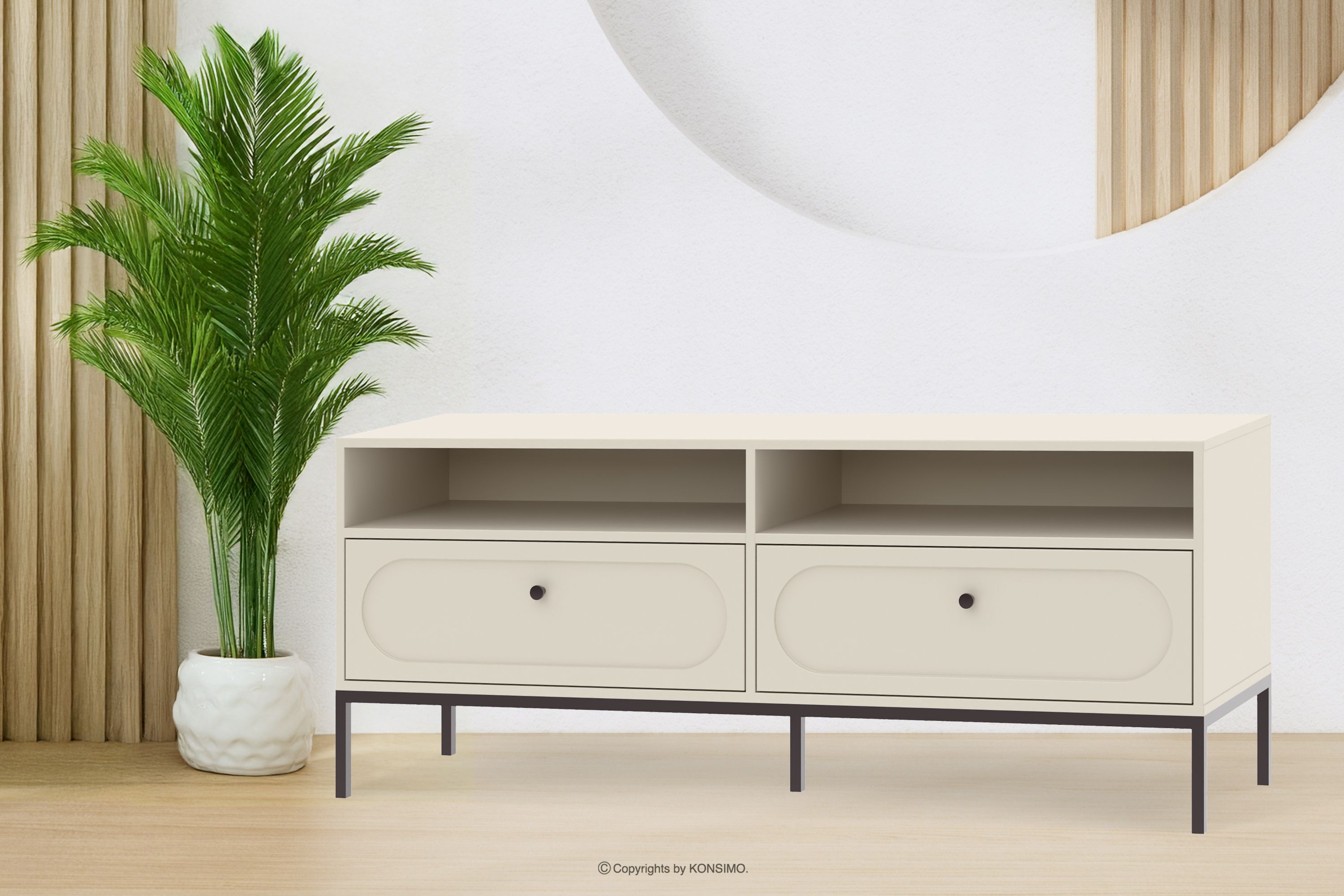 Cremefarbener TV-Schrank auf Beinen ist die Quintessenz modernen Designs, das Funktionalität mit raffinierter Ästhetik harmonisch verbindet. Die dezente, beige Farbgebung verleiht dem Interieur einen Hauch von Modernität und Eleganz und sorgt gleichzeitig für Vielseitigkeit, die eine freie Kombination mit verschiedenen Einrichtungsstilen ermöglicht. Die Fronten aus 18 mm starkem MDF mit perfekt glatter Oberfläche bilden eine minimalistische Form mit kleinen Verzierungen, die einen perfekten Hintergrund für die sorgfältig ausgewählten schwarzen Griffe bildet.