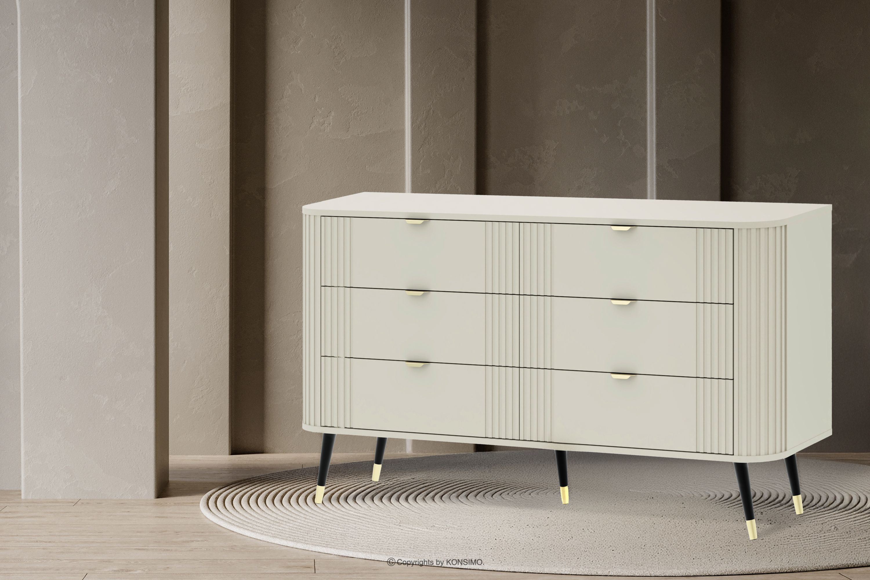 Breite cremefarbene Kommode mit Riffelung besticht durch sein modernes Design und seine präzise Verarbeitung. Der schwarze Korpus aus 16 mm starker Laminatplatte, ergänzt durch goldene Metallgriffe, bildet einen luxuriösen Kontrast, der alle Blicke auf sich zieht. Die stabile Konstruktion, verstärkt durch MDF-Eckleisten und mit 0,45 mm ABS-Kantenband versehen, garantiert Langlebigkeit und ein makelloses Aussehen über viele Jahre hinweg.