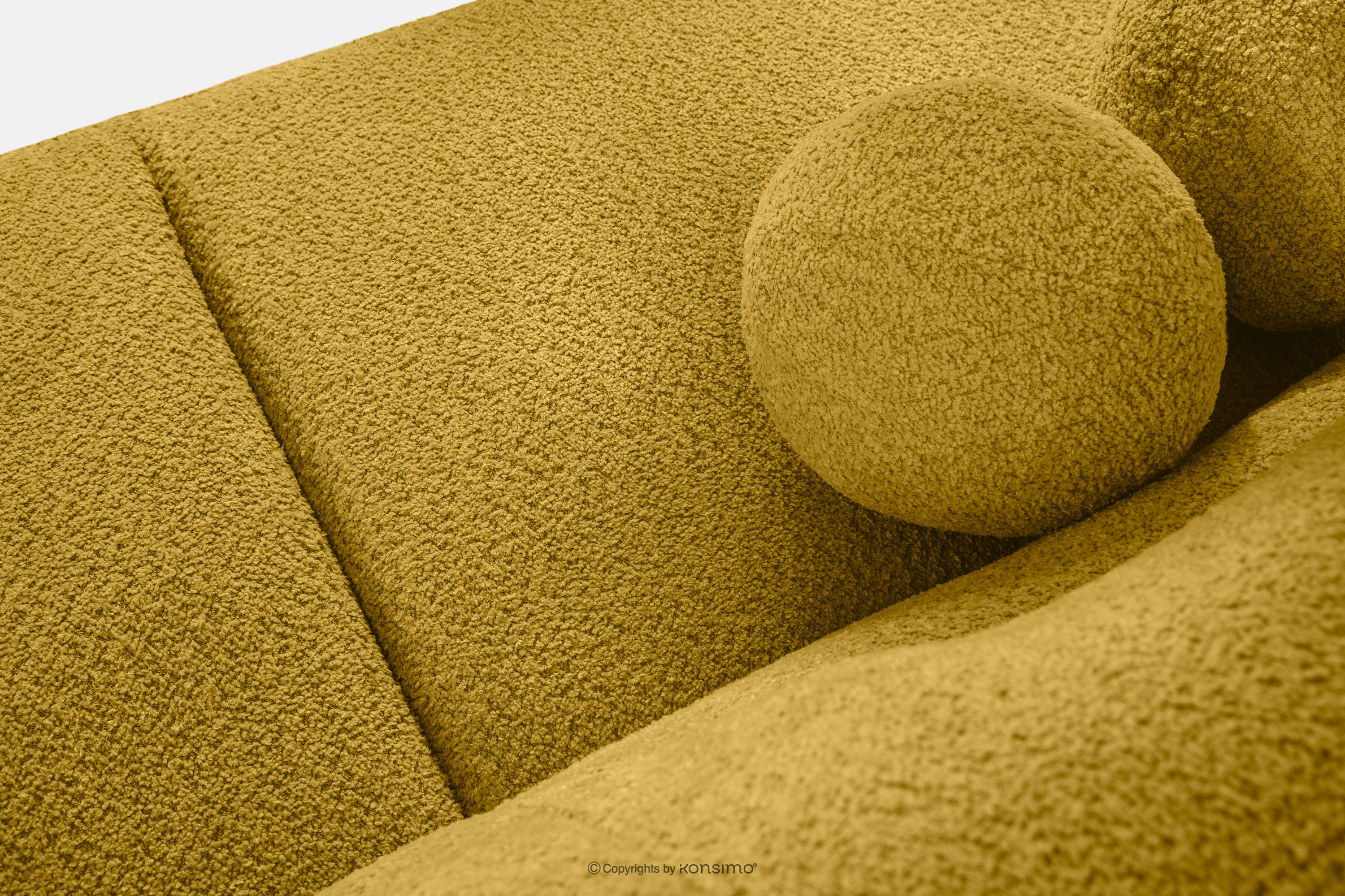 Dreisitzer-Sofa Bouclé im Japandi-Stil gelb ist ein Angebot für Menschen, die modernes Design in Verbindung mit außergewöhnlichem Komfort und sorgfältiger Verarbeitung schätzen. Die weiche, abgerundete Form ist ein Blickfang und verleiht dem Innenraum ein Gefühl von Harmonie und Gemütlichkeit. Der Bezug aus modischem Bouclé-Stoff unterstreicht den eleganten und zugleich warmen Charakter des Möbelstücks – die strukturierte Oberfläche des Materials ist nicht nur optisch ansprechend, sondern auch sehr angenehm anzufassen.