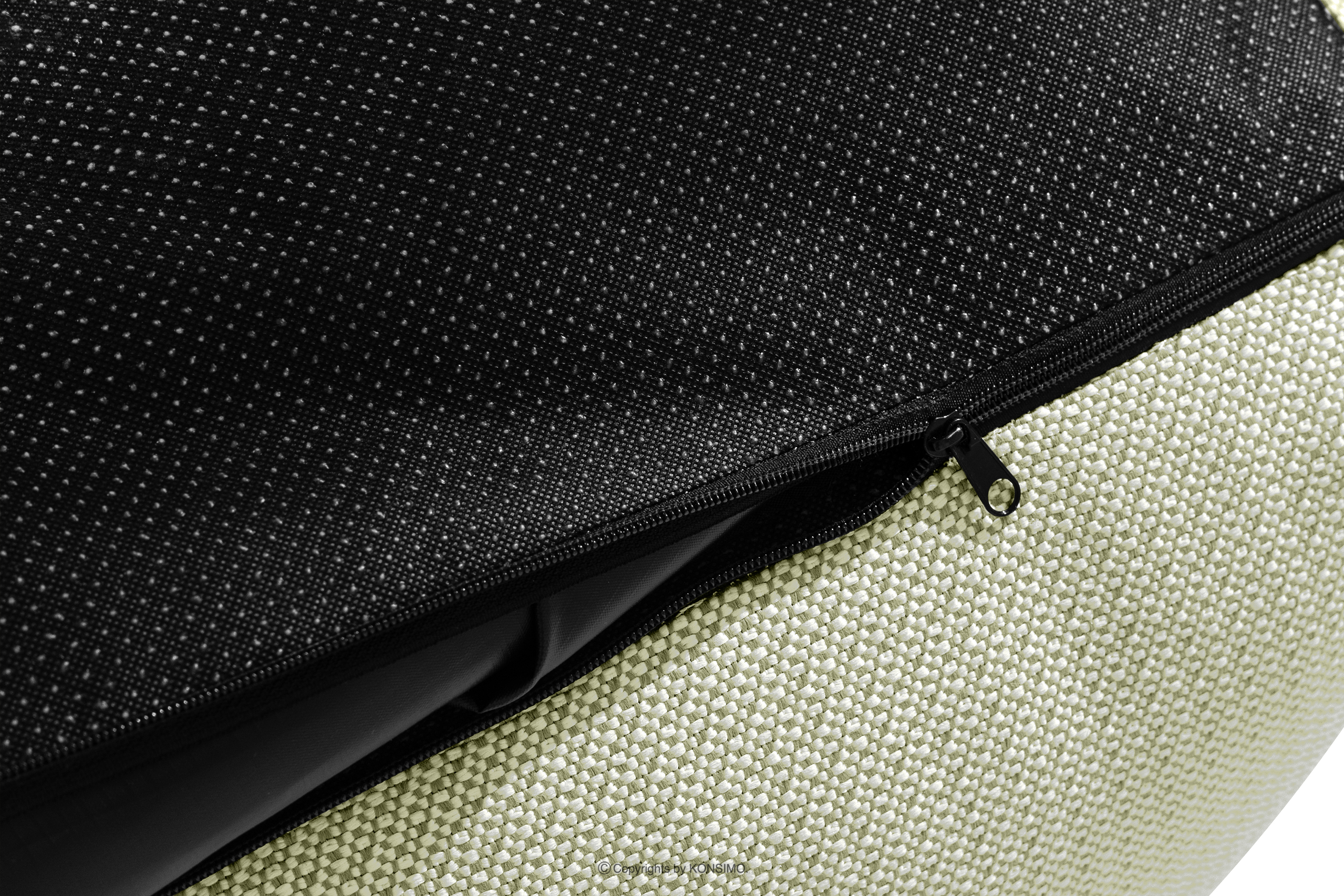 - Zusätzliche Informationen: Außenbezug aus wasserabweisendem Stoff, in die Möbelstruktur eingenäht, nach innen versteckbar und mit Reißverschluss verschließbar, Eingenähter Gummizug in der Hülle verhindert ein Verrutschen vom Möbelstück, Griff aus Polsterband zum leichteren Tragen, Unterseite des Möbelstücks aus rutschfestem Stoff