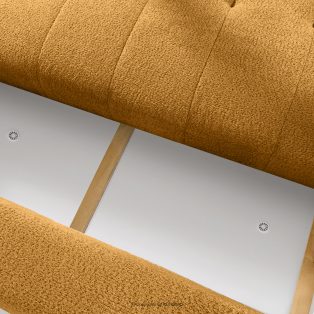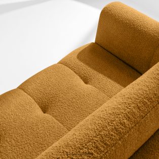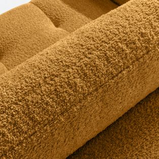 Bouclé-Sofa im Japandi-Stil in Honig und verleiht dem Interieur einen Hauch von Luxus und Gemütlichkeit. Die einzigartige Struktur des Stoffes schafft subtile Muster, die wunderschön mit dem natürlichen Licht harmonieren und dem Möbelstück Tiefe und Charakter verleihen. Das mit luxuriösem Bouclé-Stoff bezogene Sofa besticht durch seine Weichheit und seine angenehme Haptik.