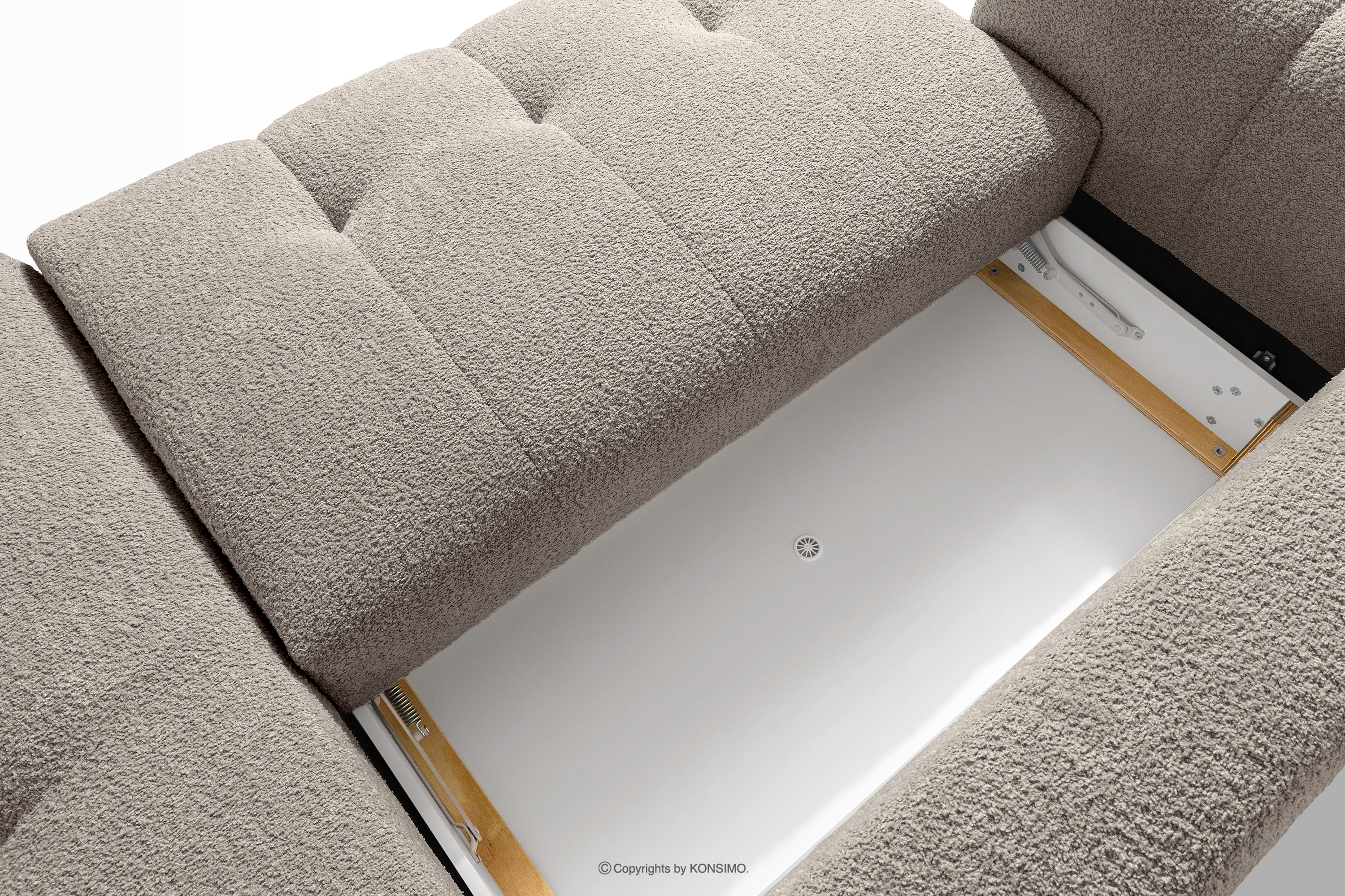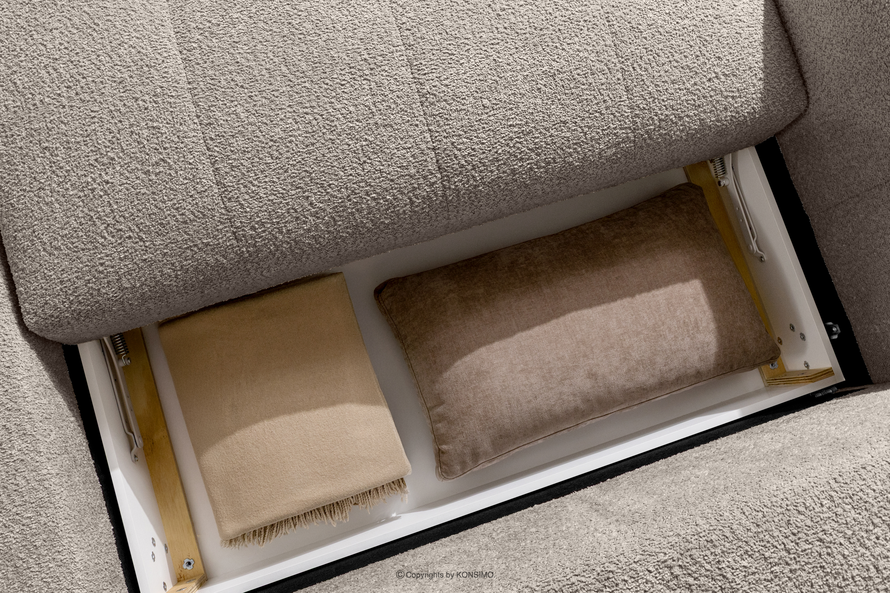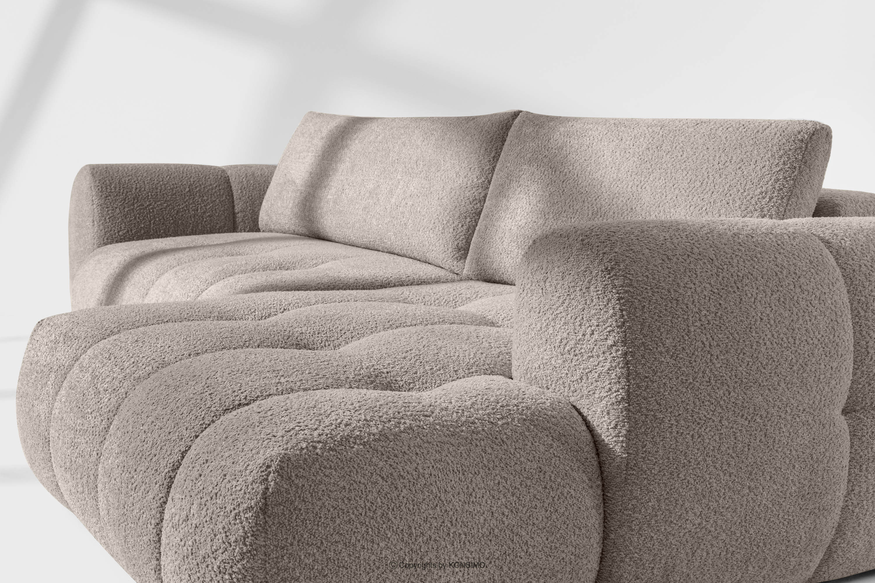 Ecksofa aus Bouclé-Stoff in Grau, rechts verleiht dem Interieur einen Hauch von Luxus und Gemütlichkeit. Die einzigartige Struktur des Stoffes schafft subtile Muster, die wunderschön mit dem natürlichen Licht harmonieren und dem Möbelstück Tiefe und Charakter verleihen. Dieses Ecksofa ist mit einem luxuriösen Bouclé-Stoff bezogen und besticht durch seine Weichheit und seine angenehme Haptik.