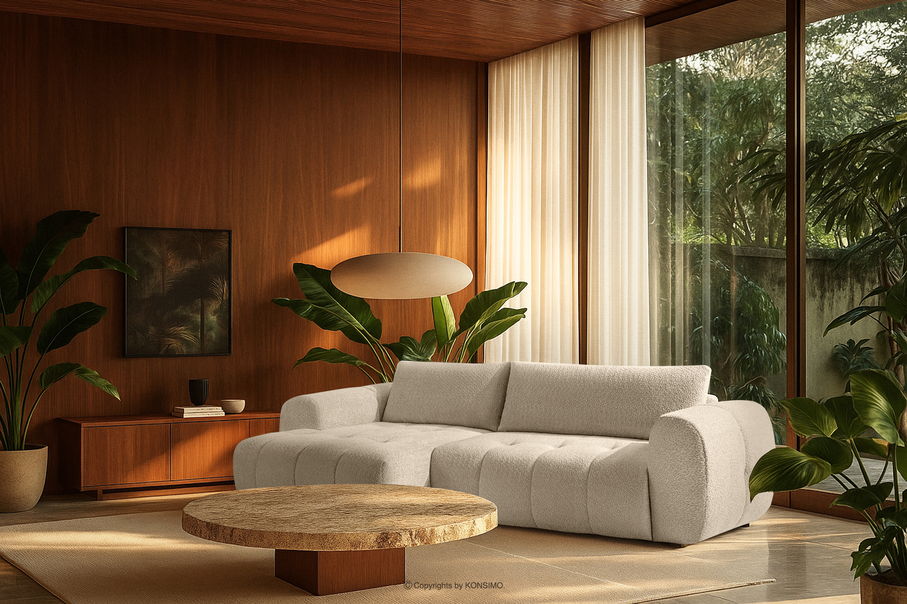 Ecksofa aus Boucle-Stoff weiß links verleiht dem Interieur einen Hauch von Luxus und Gemütlichkeit. Die einzigartige Struktur des Stoffes schafft subtile Muster, die wunderschön mit dem natürlichen Licht harmonieren und dem Möbelstück Tiefe und Charakter verleihen. Dieses Ecksofa ist mit einem luxuriösen Bouclé-Stoff bezogen und besticht durch seine Weichheit und seine angenehme Haptik.