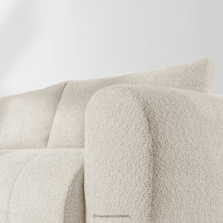 Sofa und Sitzhocker aus Bouclé-Stoff in Weiß verleiht dem Interieur einen Hauch von Luxus und Gemütlichkeit. Die einzigartige Struktur des Stoffes schafft subtile Muster, die wunderschön mit dem natürlichen Licht harmonieren und dem Möbelstück Tiefe und Charakter verleihen. Das mit luxuriösem Bouclé-Stoff bezogene Sofa besticht durch seine Weichheit und seine angenehme Haptik.