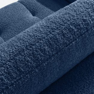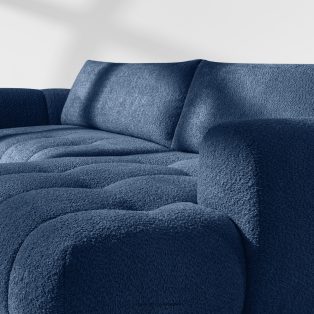 Ecksofa rechts und Sitzhocker in Bouclé marineblau verleiht dem Interieur einen Hauch von Luxus und Gemütlichkeit. Die einzigartige Struktur des Stoffes schafft subtile Muster, die wunderschön mit dem natürlichen Licht harmonieren und dem Möbelstück Tiefe und Charakter verleihen. Das mit luxuriösem Bouclé-Stoff bezogene Sofa besticht durch seine Weichheit und seine angenehme Haptik.