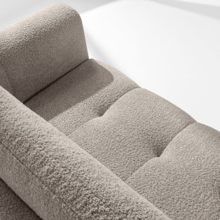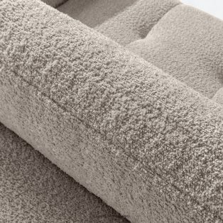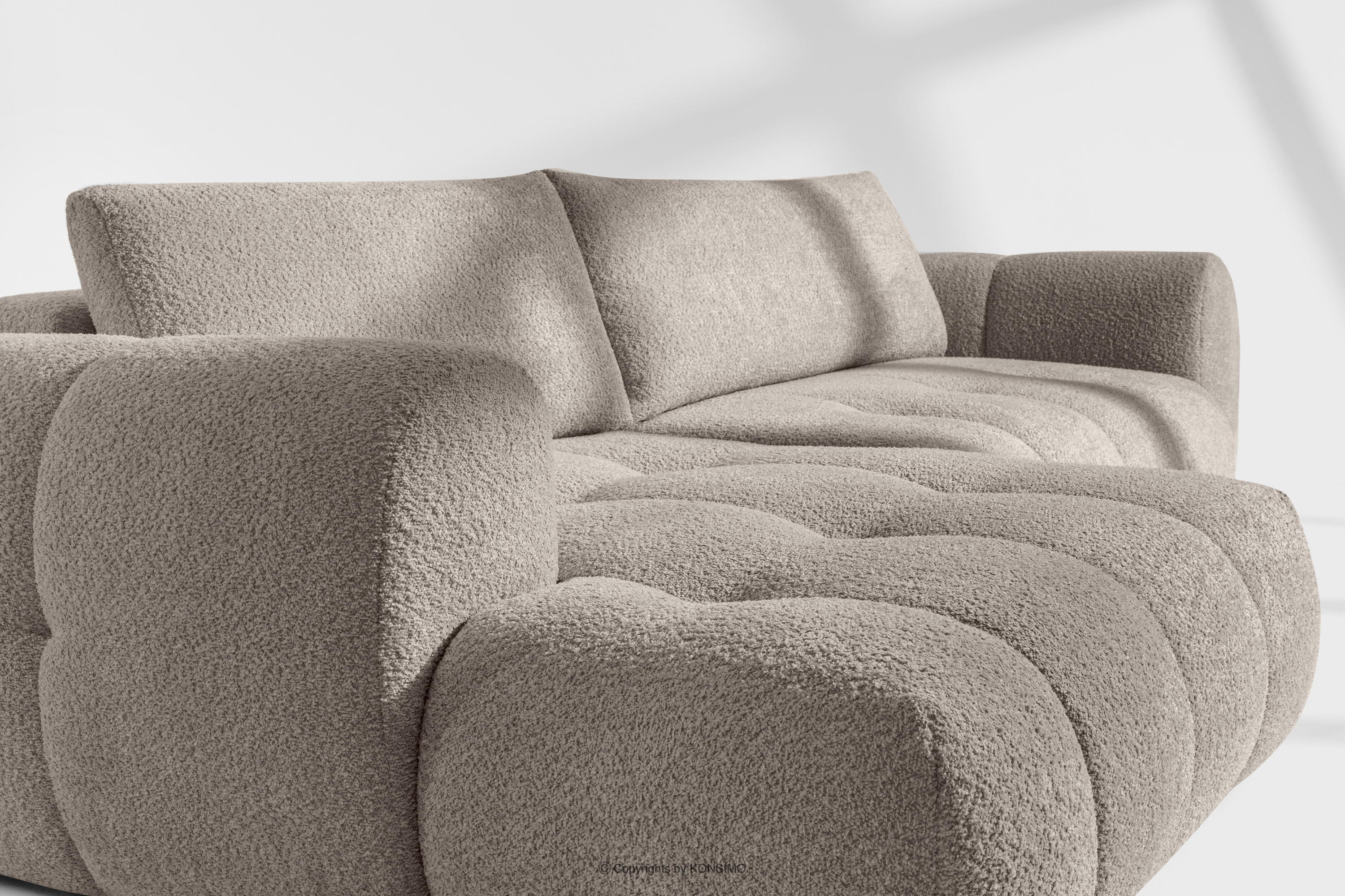 Ecksofa rechts und Sitzhocker in Bouclé-Stoff grau verleiht dem Interieur einen Hauch von Luxus und Gemütlichkeit. Die einzigartige Struktur des Stoffes schafft subtile Muster, die wunderschön mit dem natürlichen Licht harmonieren und dem Möbelstück Tiefe und Charakter verleihen. Das mit luxuriösem Bouclé-Stoff bezogene Sofa besticht durch seine Weichheit und seine angenehme Haptik.