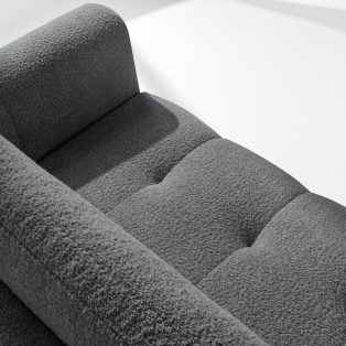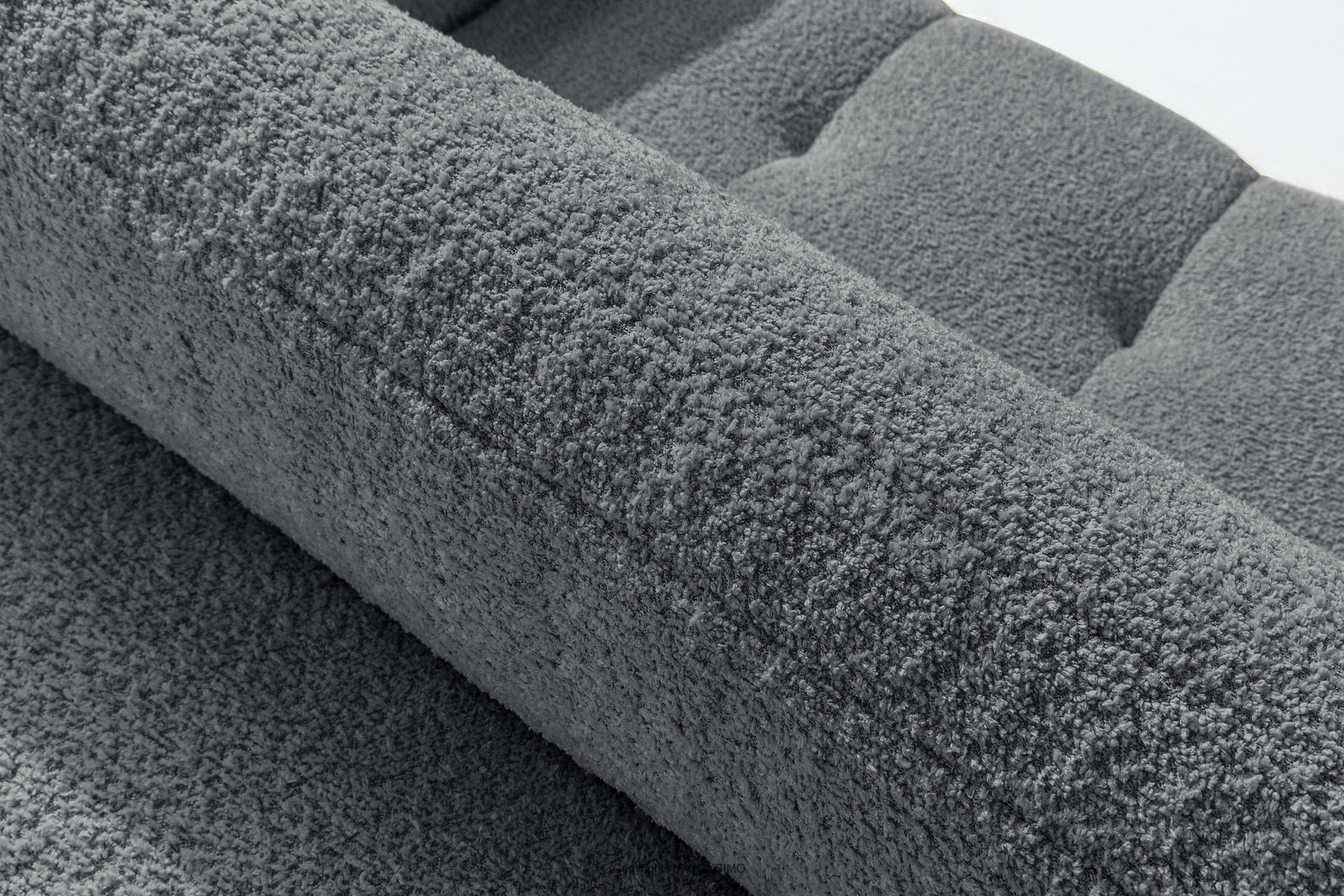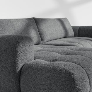 Ecksofa links und Sitzhocker in Boucle dunkelgrau verleiht dem Interieur einen Hauch von Luxus und Gemütlichkeit. Die einzigartige Struktur des Stoffes schafft subtile Muster, die wunderschön mit dem natürlichen Licht harmonieren und dem Möbelstück Tiefe und Charakter verleihen. Das mit luxuriösem Bouclé-Stoff bezogene Sofa besticht durch seine Weichheit und seine angenehme Haptik.