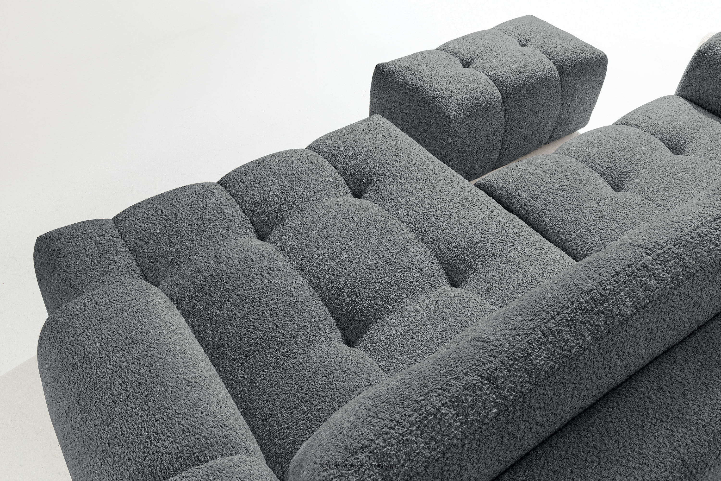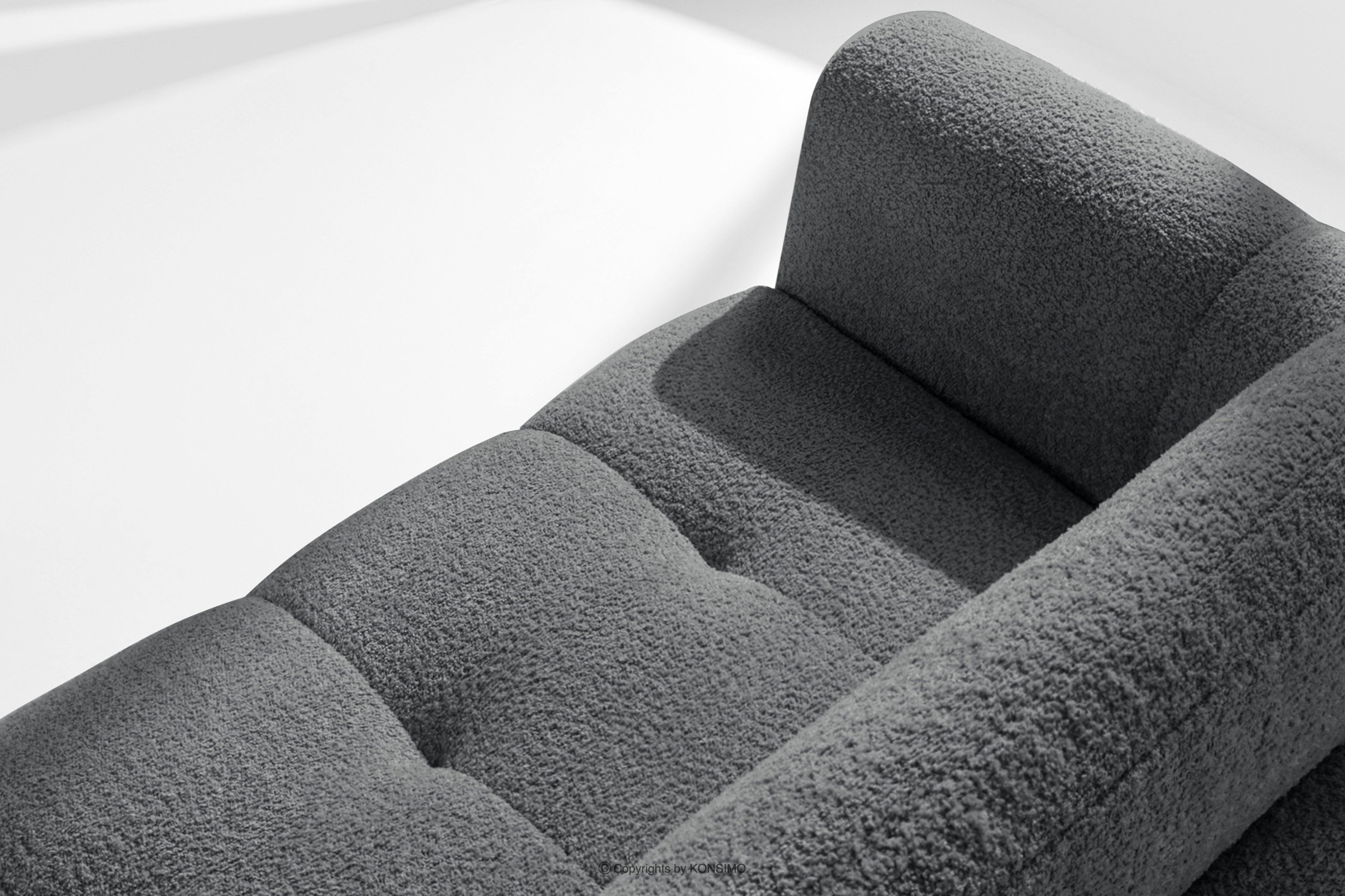 Ecksofa mit Steppung im Japandi-Boucle-Stil links dunkelgrau verbindet die strenge Eleganz des japanischen Designs mit dem gemütlichen Minimalismus skandinavischer Innenräume. Die Kollektion RAVIA ist mit einem einzigartigen Bouclé-Stoff bezogen, der nicht nur durch seine Struktur und Weichheit besticht, sondern den Möbeln auch einen luxuriösen Charakter verleiht. Sie bringt Ruhe und Harmonie in jeden Raum.