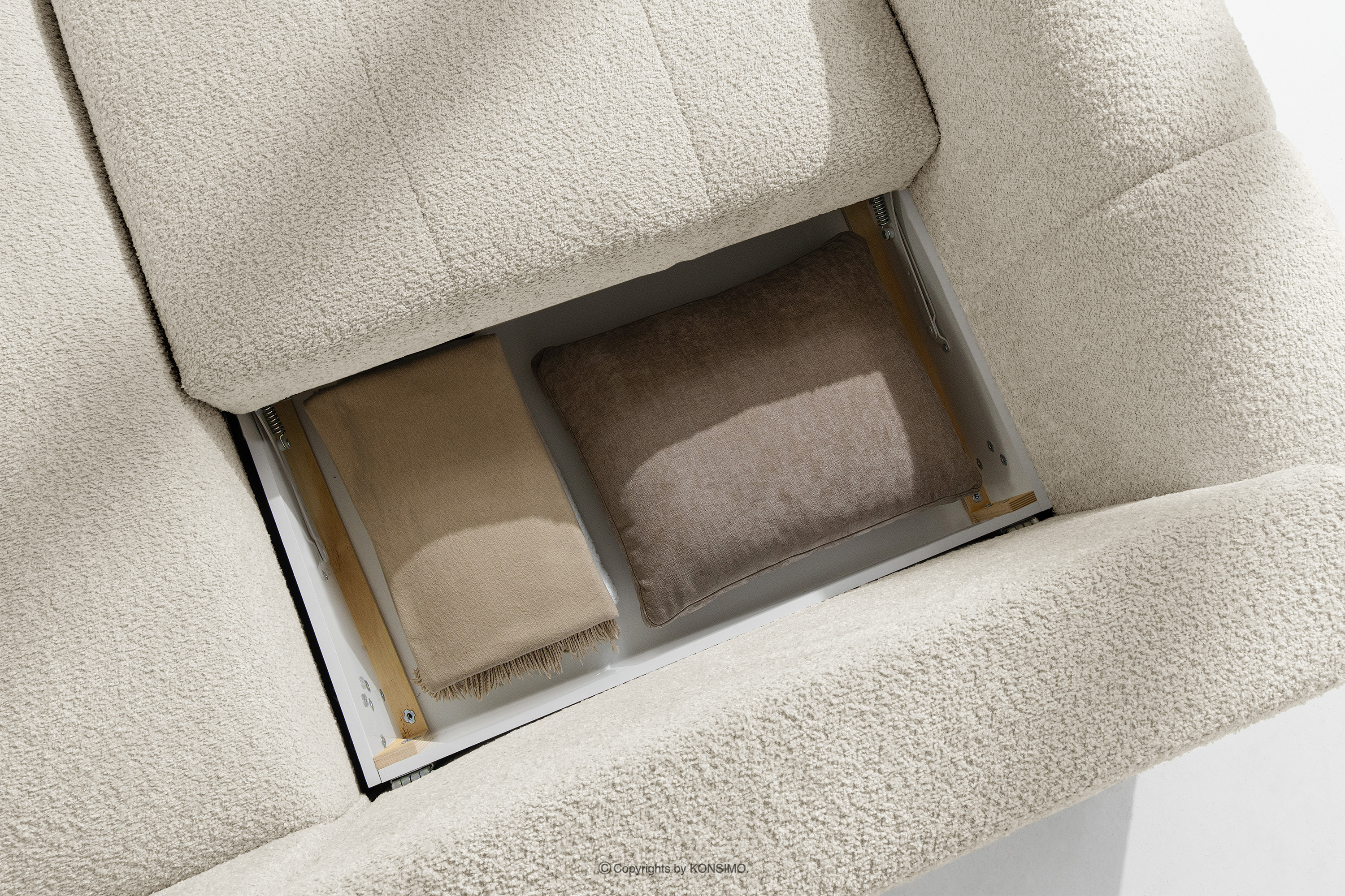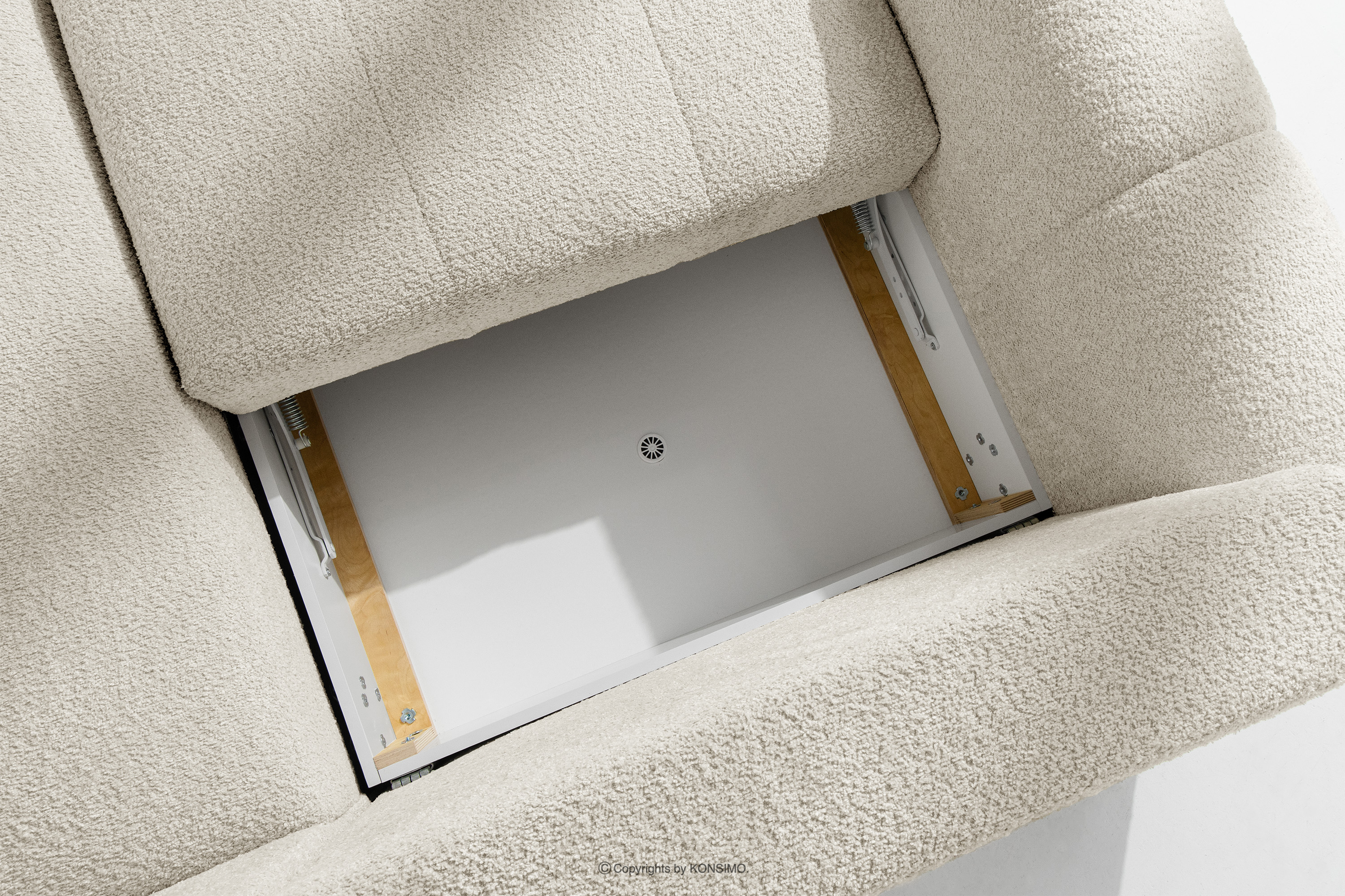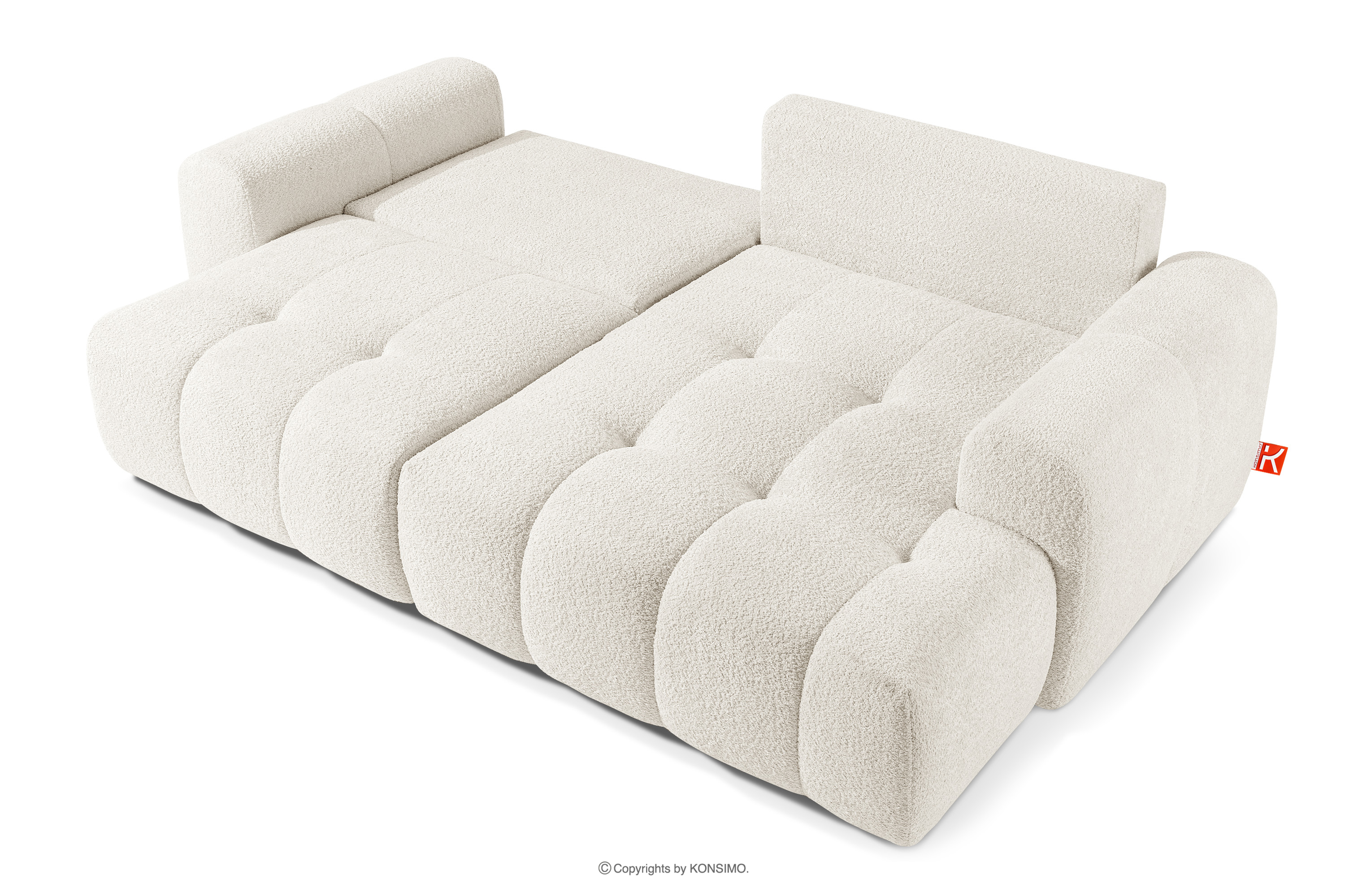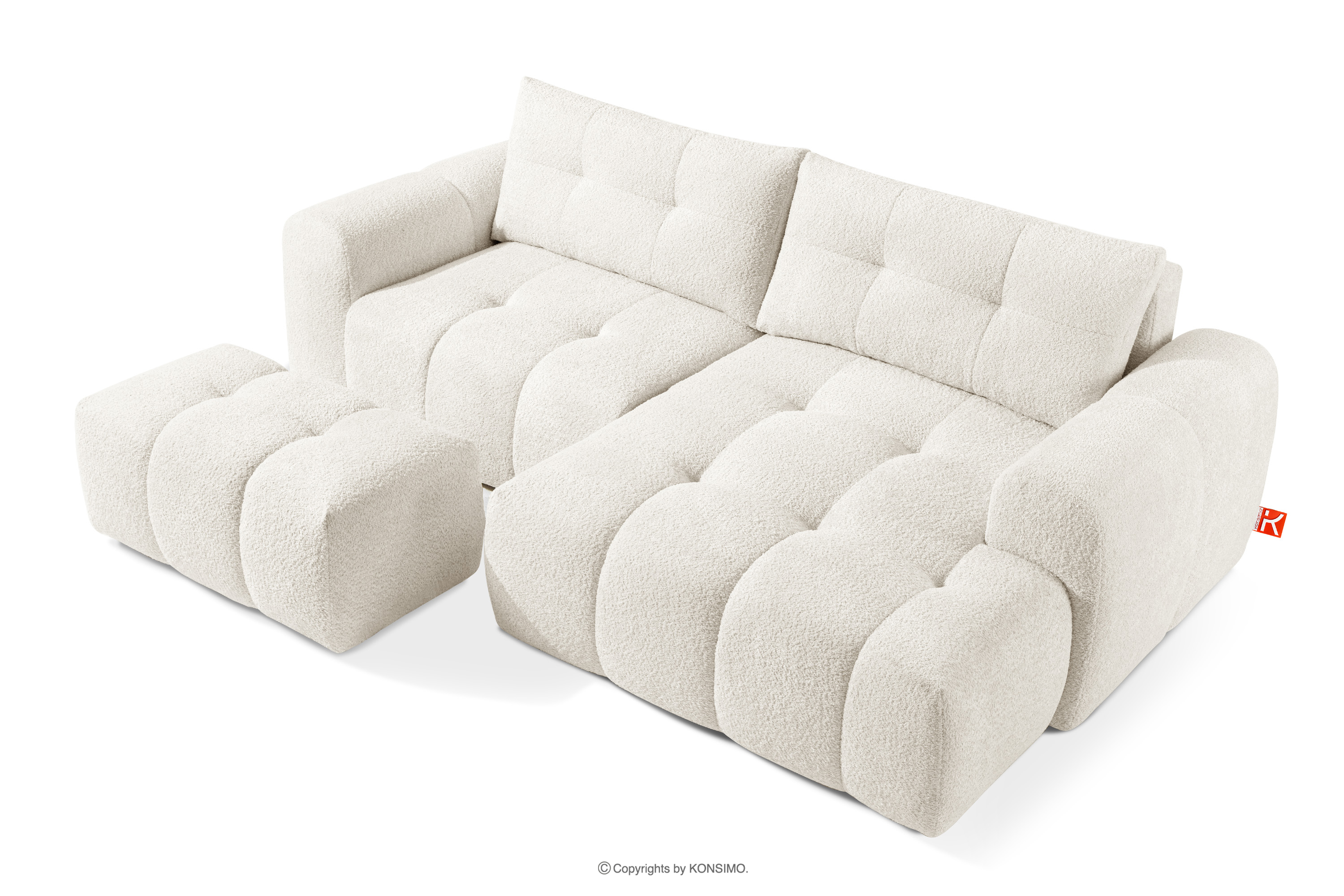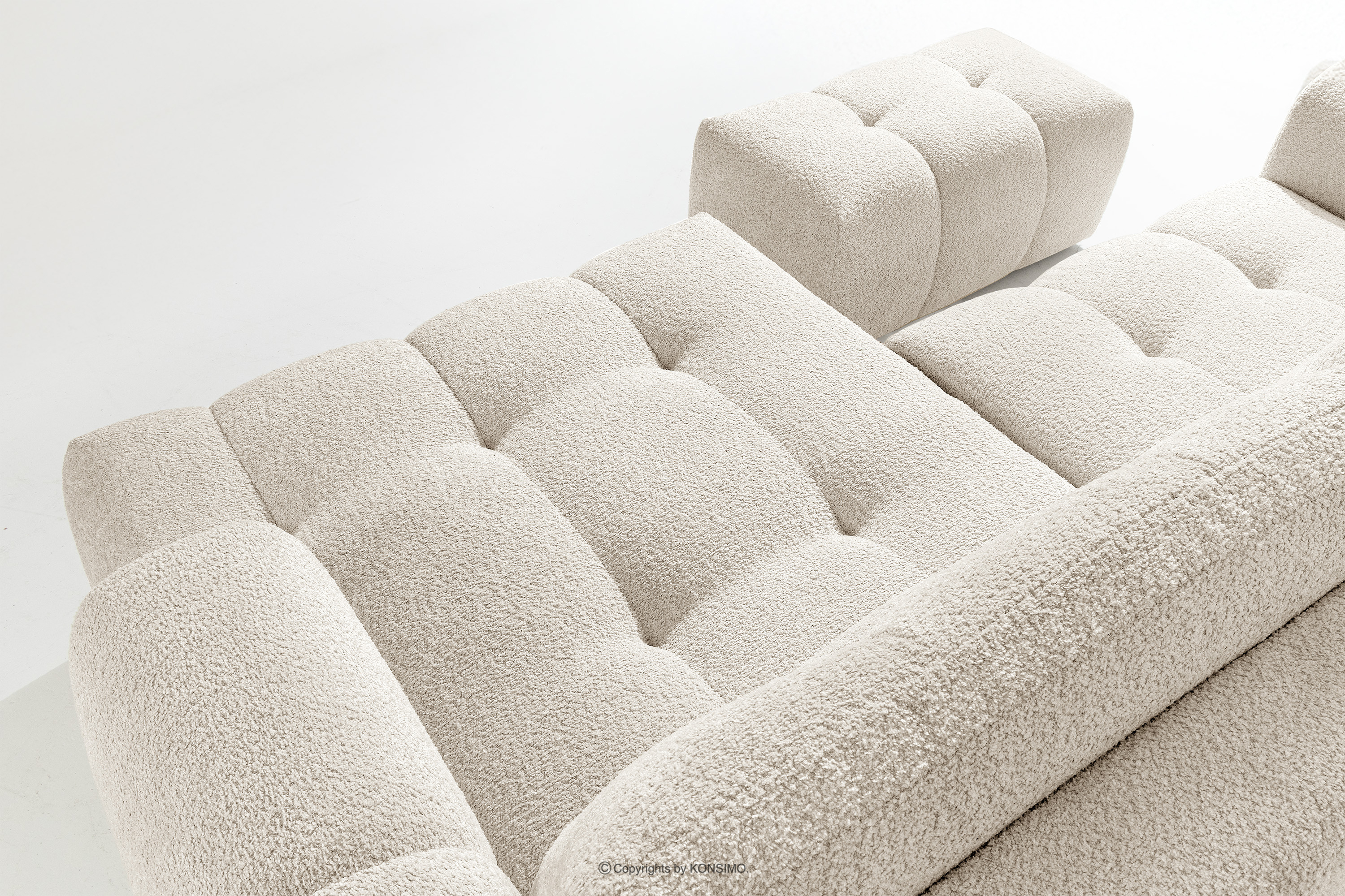 Ecksofa mit Steppung im Japandi-Boucle-Stil rechts weiß verbindet die strenge Eleganz des japanischen Designs mit dem gemütlichen Minimalismus skandinavischer Innenräume. Die Kollektion RAVIA ist mit einem einzigartigen Bouclé-Stoff bezogen, der nicht nur durch seine Struktur und Weichheit besticht, sondern den Möbeln auch einen luxuriösen Charakter verleiht. Sie bringt Ruhe und Harmonie in jeden Raum.