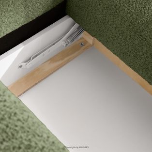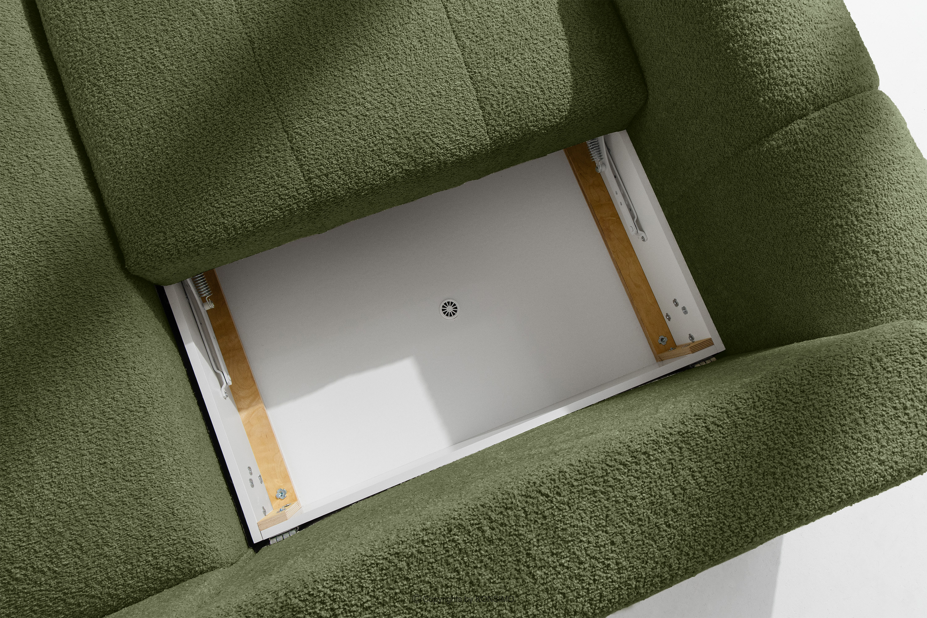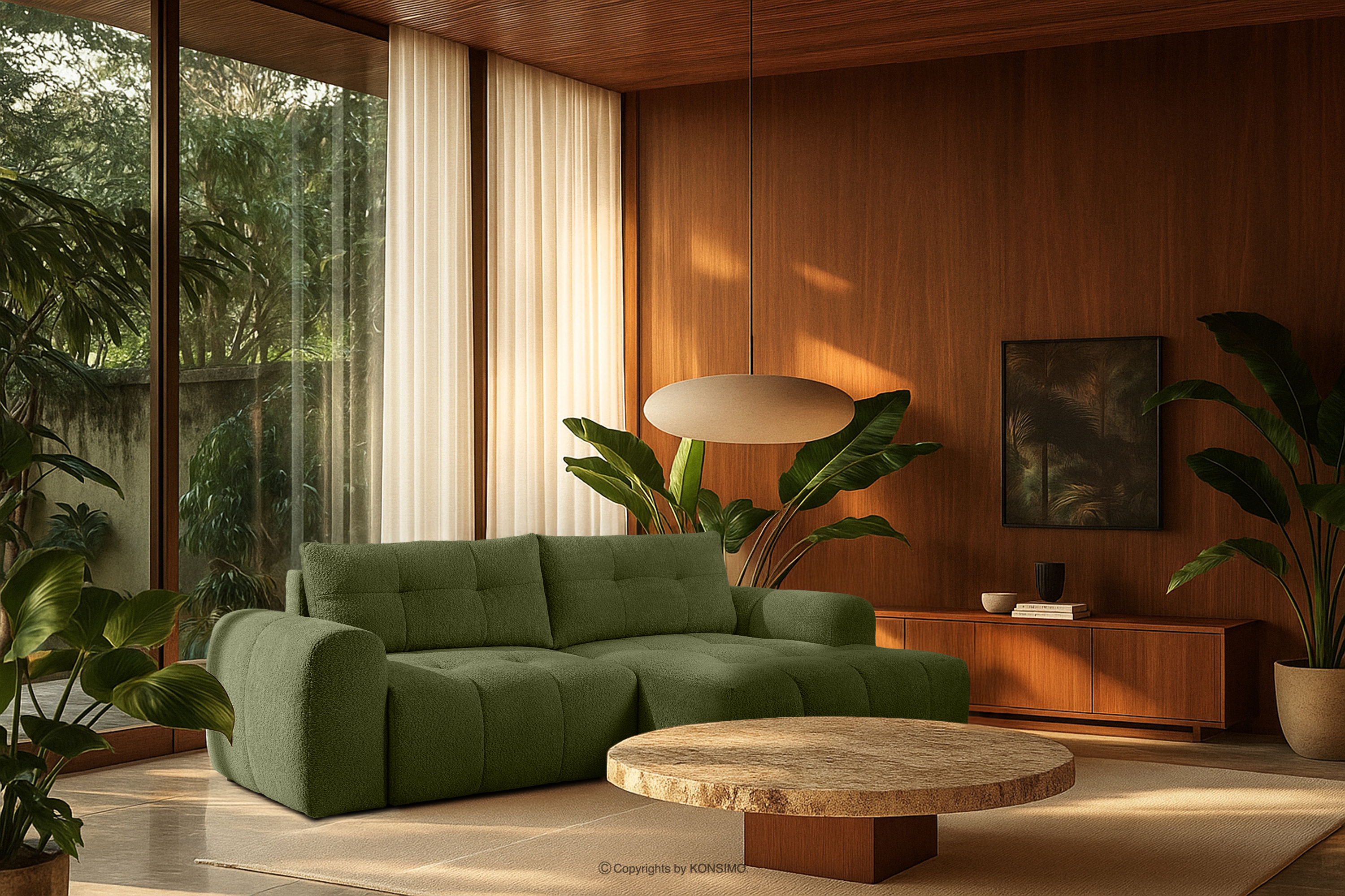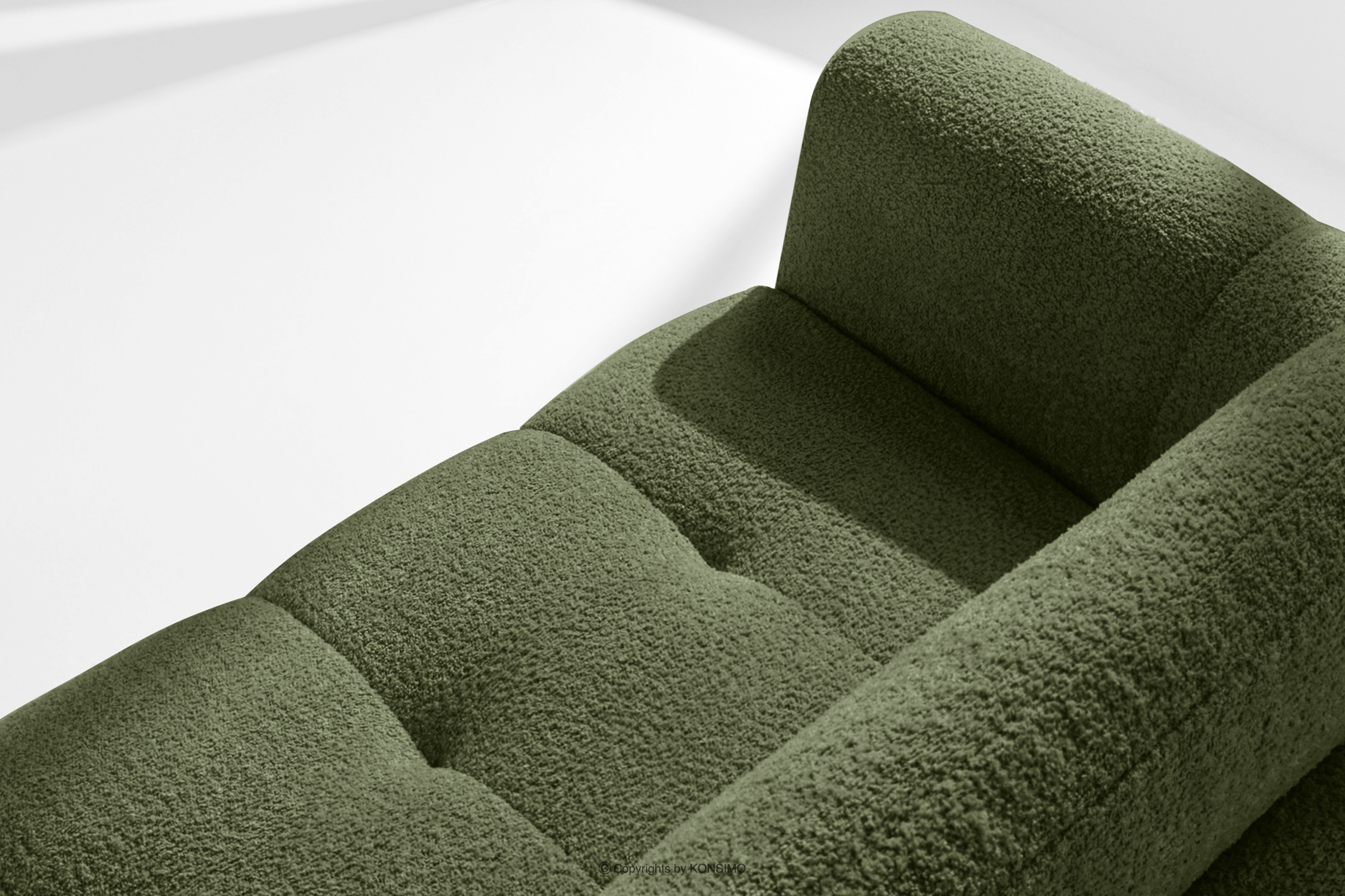 Ecksofa mit Steppung im Japandi-Boucle-Stil rechts olivgrün verbindet die strenge Eleganz des japanischen Designs mit dem gemütlichen Minimalismus skandinavischer Innenräume. Die Kollektion RAVIA ist mit einem einzigartigen Bouclé-Stoff bezogen, der nicht nur durch seine Struktur und Weichheit besticht, sondern den Möbeln auch einen luxuriösen Charakter verleiht. Sie bringt Ruhe und Harmonie in jeden Raum.