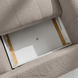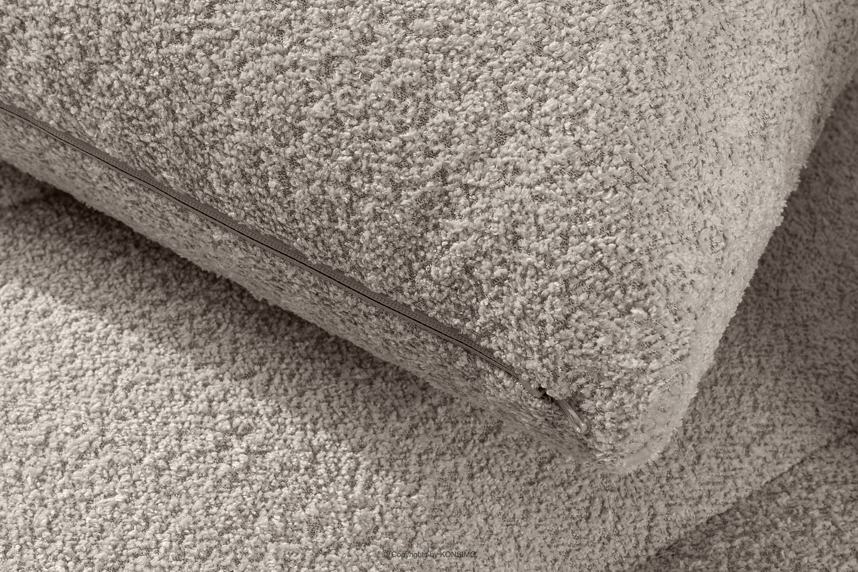 Die subtilen, unregelmäßigen Bouclé-Webungen bilden auf der Oberfläche der Möbel zarte Muster, die das Licht wunderschön reflektieren, die Farbtiefe betonen und den Möbeln ein einzigartiges, handwerkliches Aussehen verleihen. Solide Nähte und Liebe zum Detail, die für Premium-Qualität typisch sind, zeigen sich in jedem Element, von den sorgfältig verarbeiteten Kanten bis hin zu den perfekt passenden Kissen.