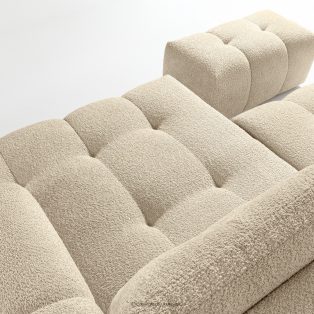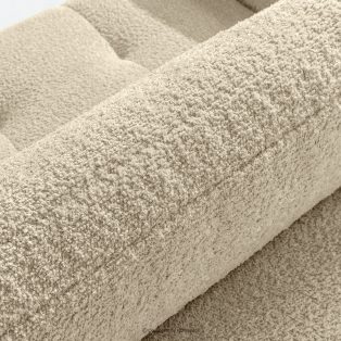 Die subtilen, unregelmäßigen Bouclé-Webungen bilden auf der Oberfläche der Möbel zarte Muster, die das Licht wunderschön reflektieren, die Farbtiefe betonen und den Möbeln ein einzigartiges, handwerkliches Aussehen verleihen. Solide Nähte und Liebe zum Detail, die für Premium-Qualität typisch sind, zeigen sich in jedem Element, von den sorgfältig verarbeiteten Kanten bis hin zu den perfekt passenden Kissen.