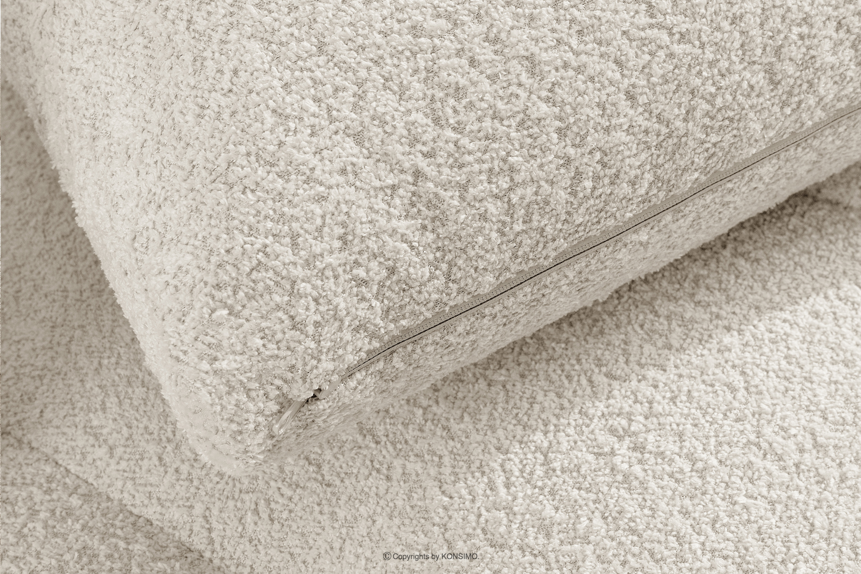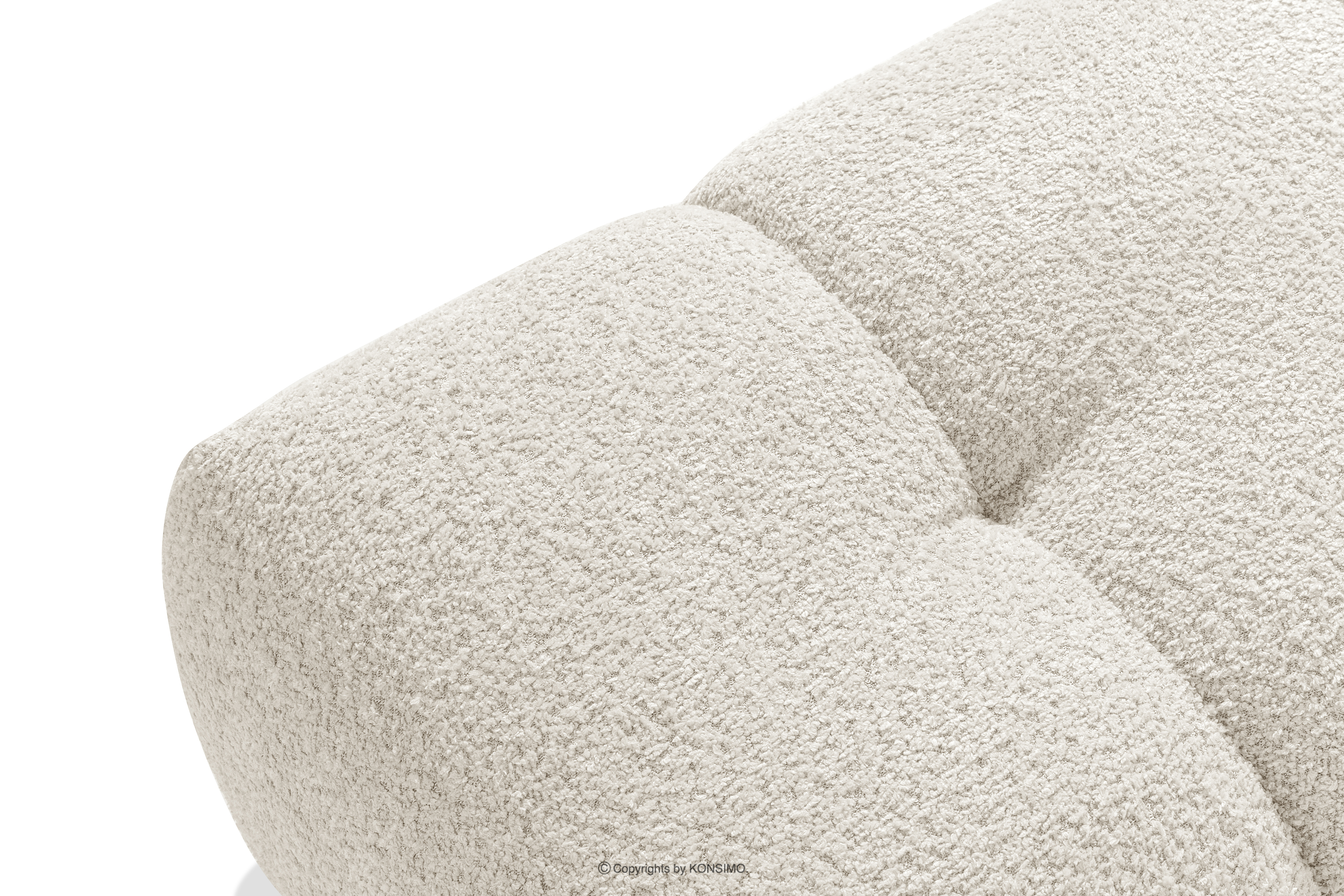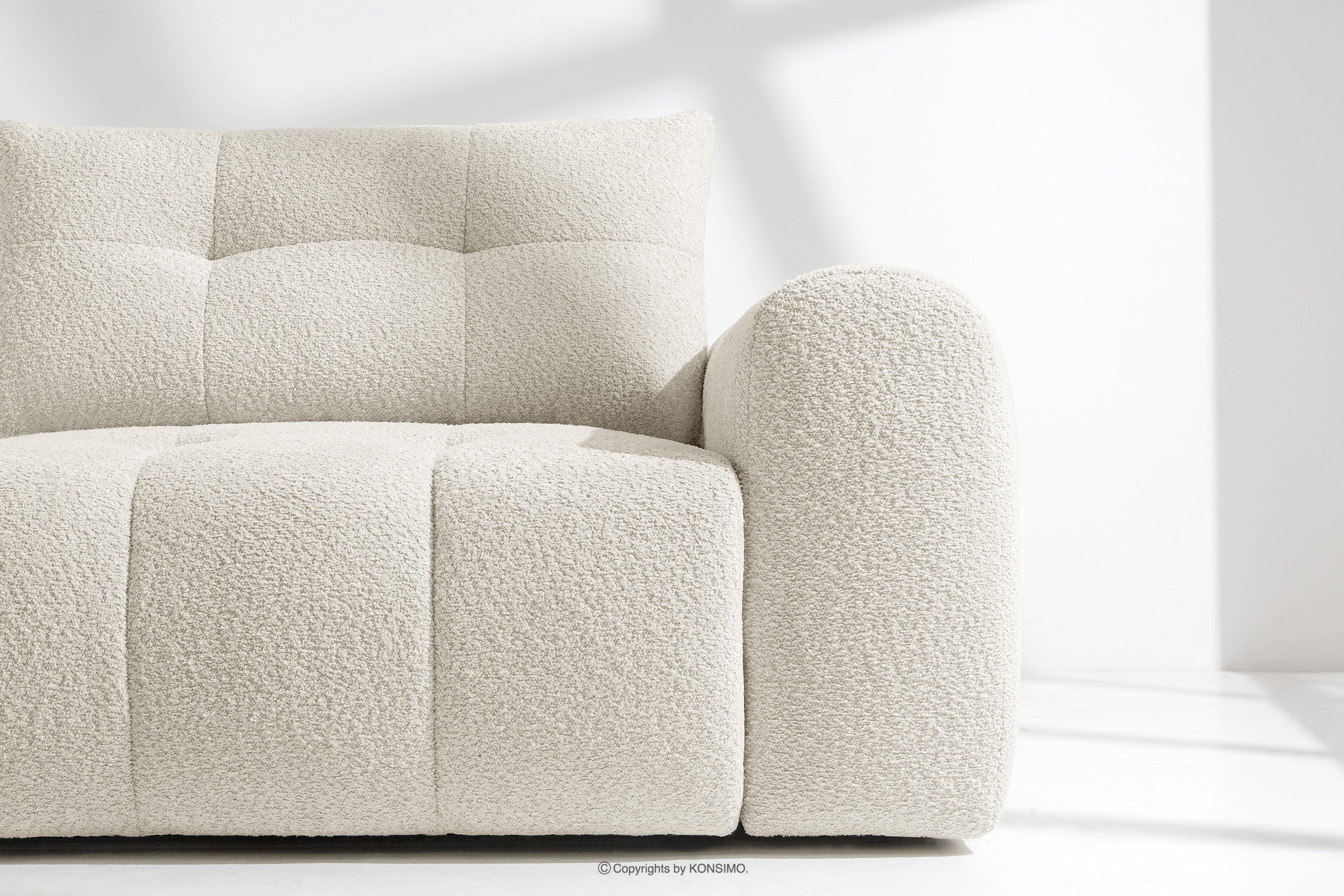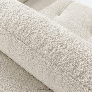 Die subtilen, unregelmäßigen Bouclé-Webungen bilden auf der Oberfläche der Möbel zarte Muster, die das Licht wunderschön reflektieren, die Farbtiefe betonen und den Möbeln ein einzigartiges, handwerkliches Aussehen verleihen. Solide Nähte und Liebe zum Detail, die für Premium-Qualität typisch sind, zeigen sich in jedem Element, von den sorgfältig verarbeiteten Kanten bis hin zu den perfekt passenden Kissen.