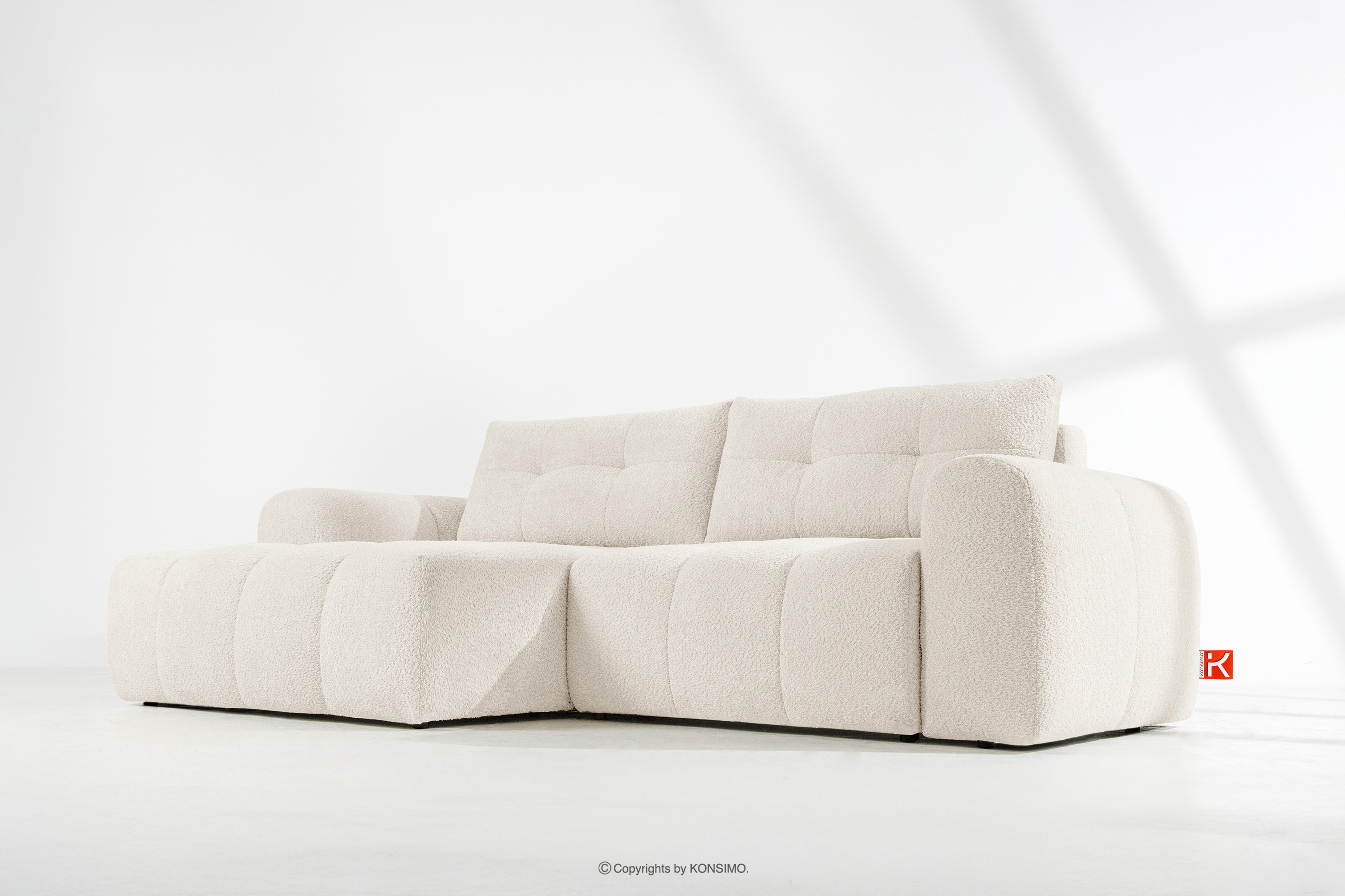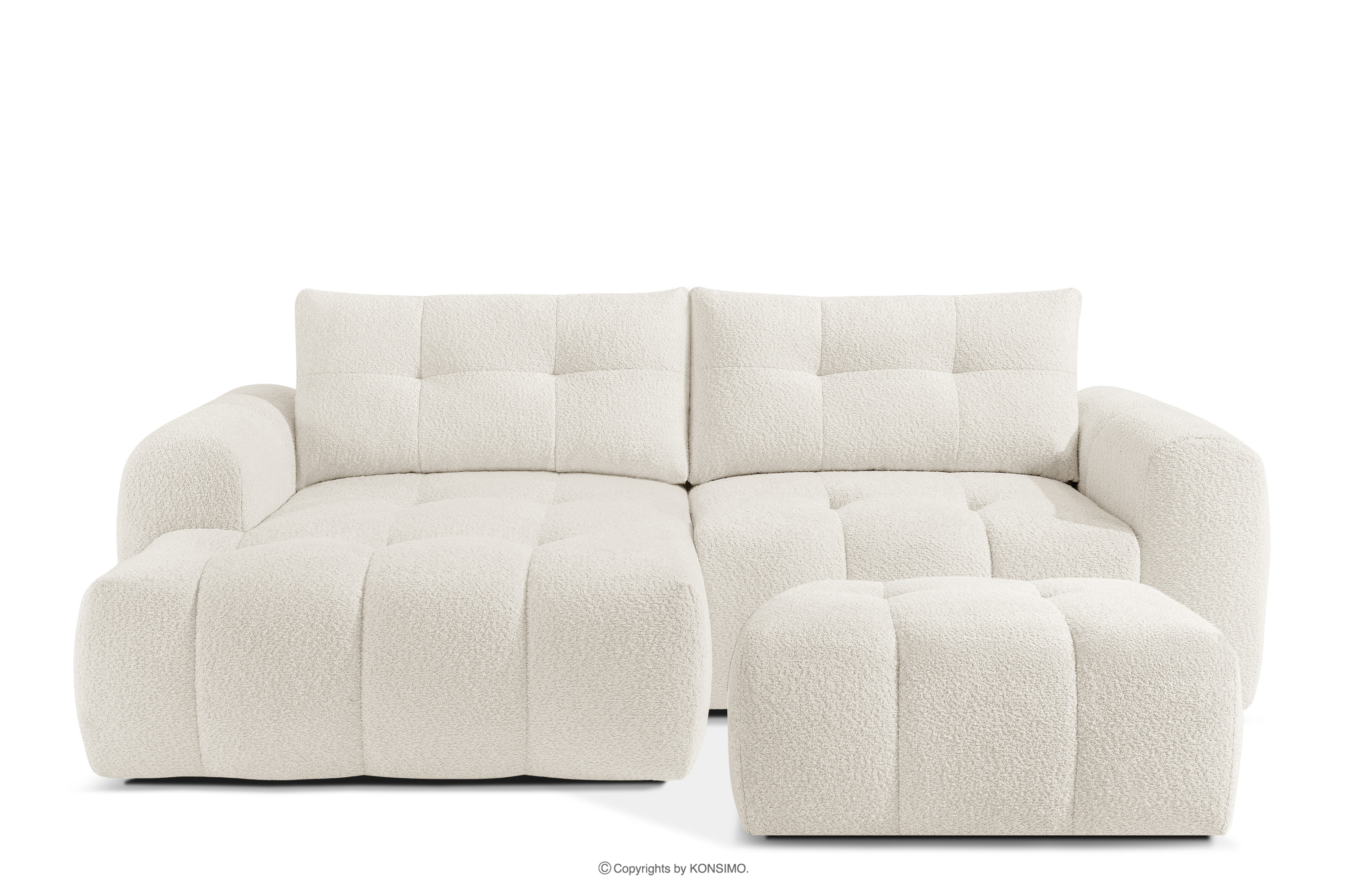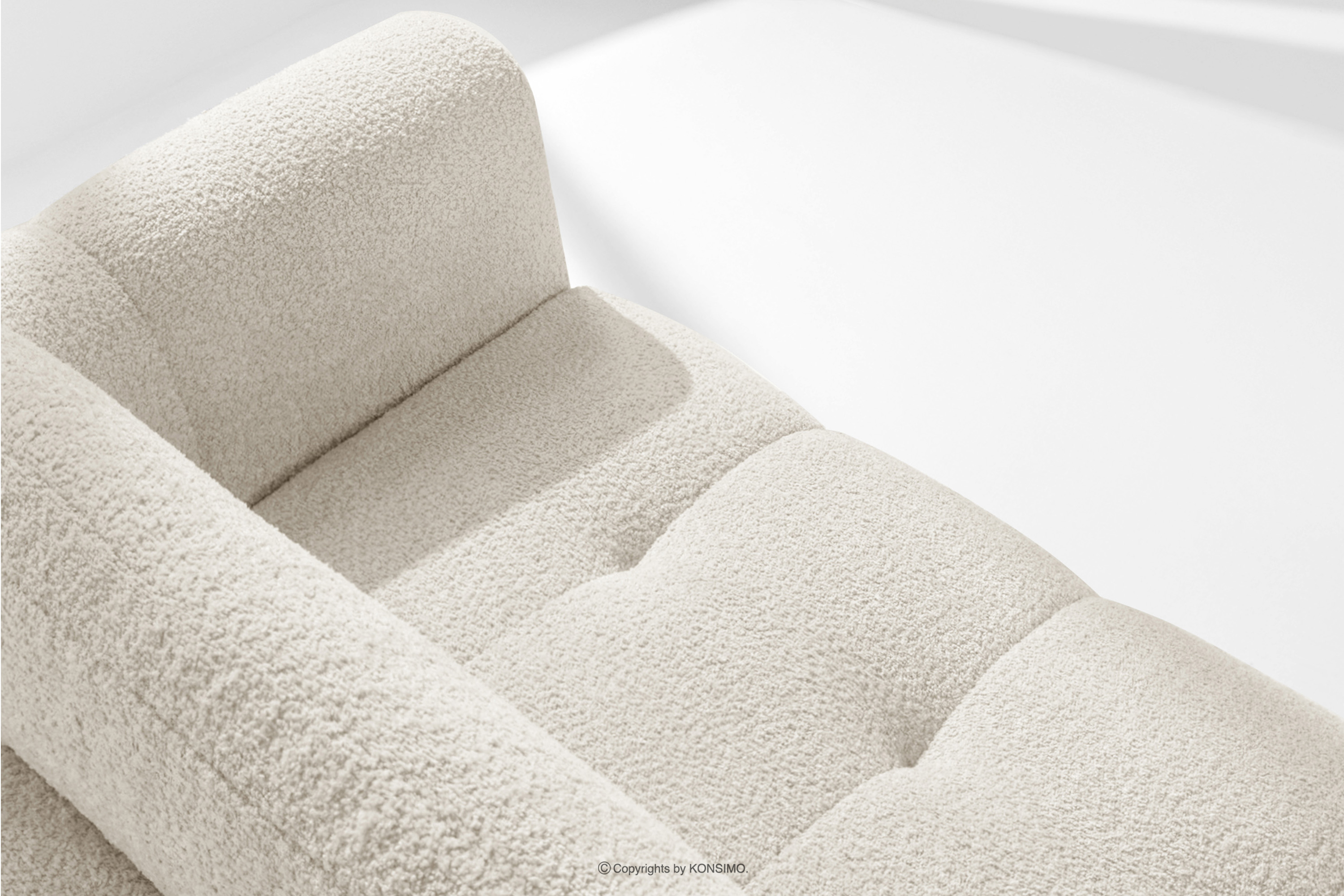 Die subtilen, unregelmäßigen Bouclé-Webungen bilden auf der Oberfläche der Möbel zarte Muster, die das Licht wunderschön reflektieren, die Farbtiefe betonen und den Möbeln ein einzigartiges, handwerkliches Aussehen verleihen. Solide Nähte und Liebe zum Detail, die für Premium-Qualität typisch sind, zeigen sich in jedem Element, von den sorgfältig verarbeiteten Kanten bis hin zu den perfekt passenden Kissen.