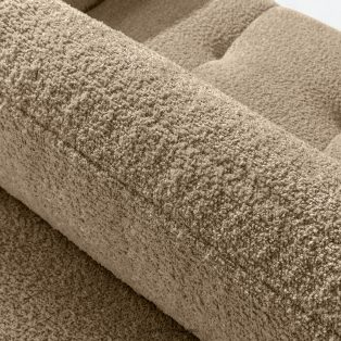 Die subtilen, unregelmäßigen Bouclé-Webungen bilden auf der Oberfläche der Möbel zarte Muster, die das Licht wunderschön reflektieren, die Farbtiefe betonen und den Möbeln ein einzigartiges, handwerkliches Aussehen verleihen. Solide Nähte und Liebe zum Detail, die für Premium-Qualität typisch sind, zeigen sich in jedem Element, von den sorgfältig verarbeiteten Kanten bis hin zu den perfekt passenden Kissen.
