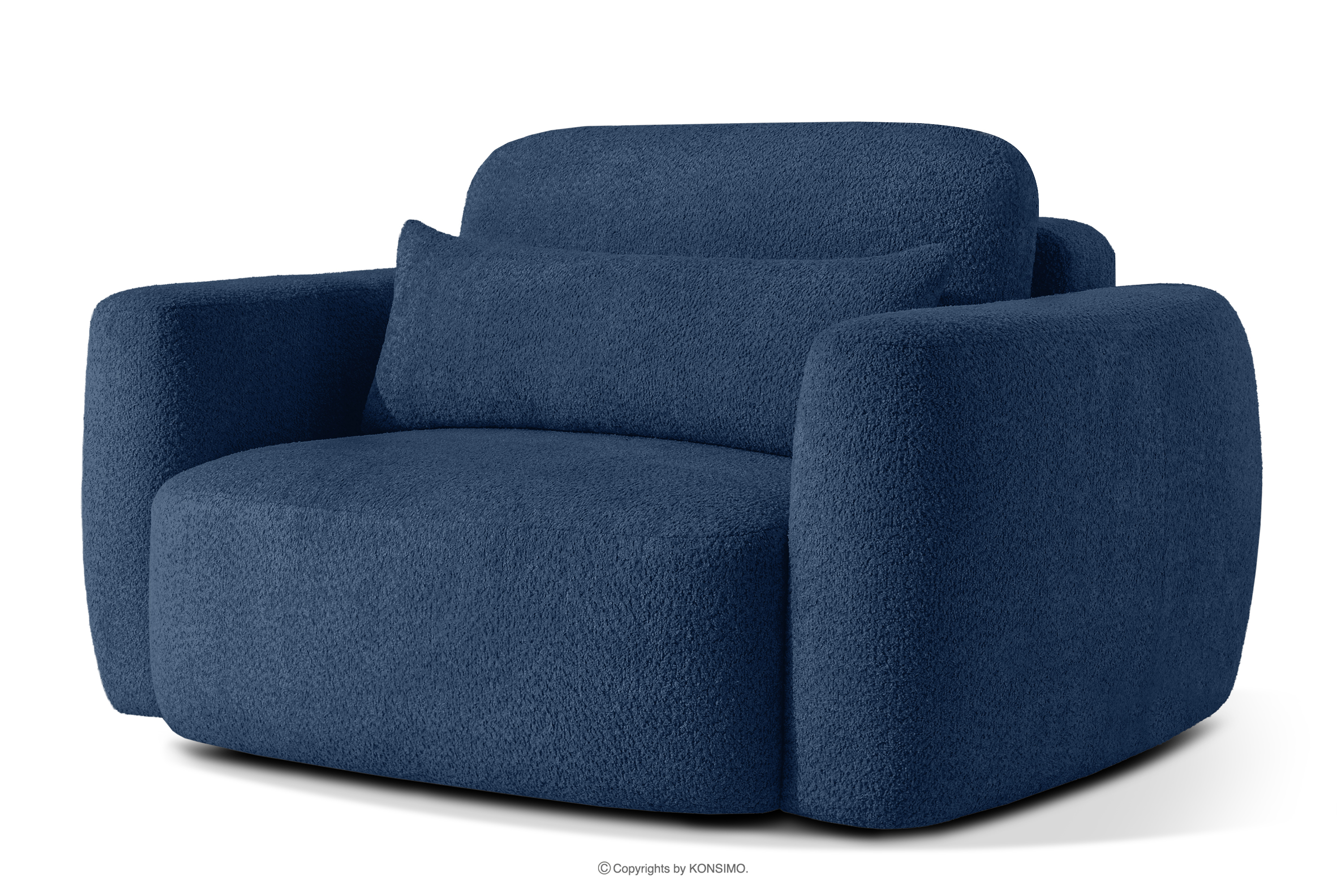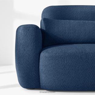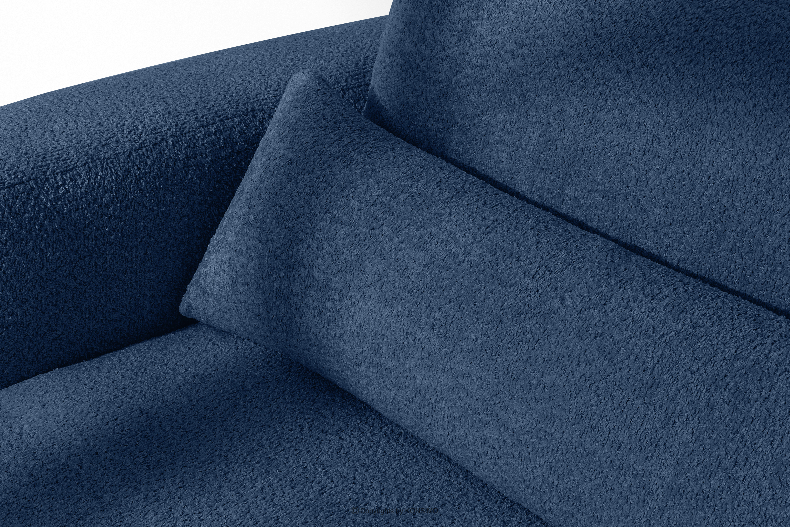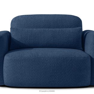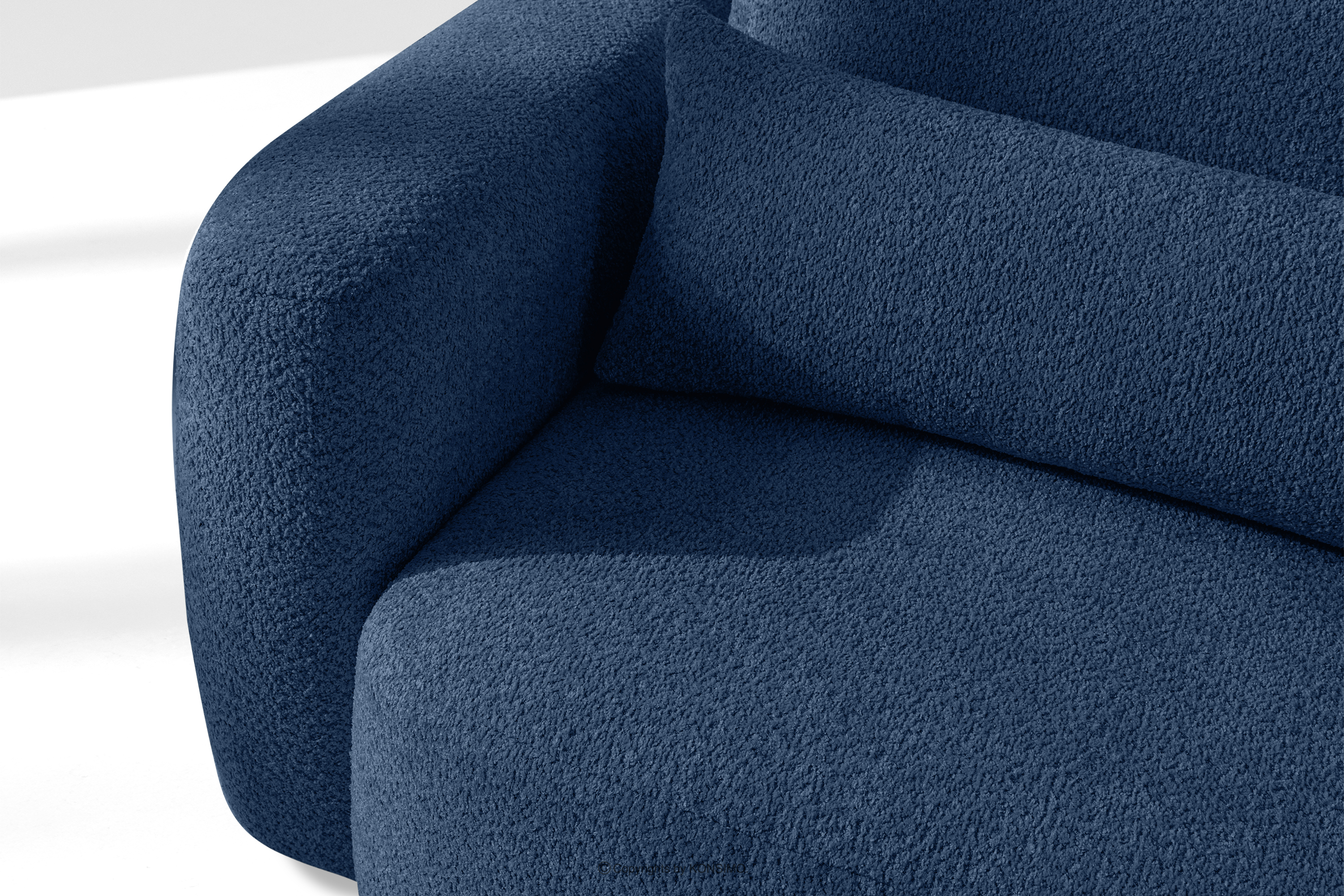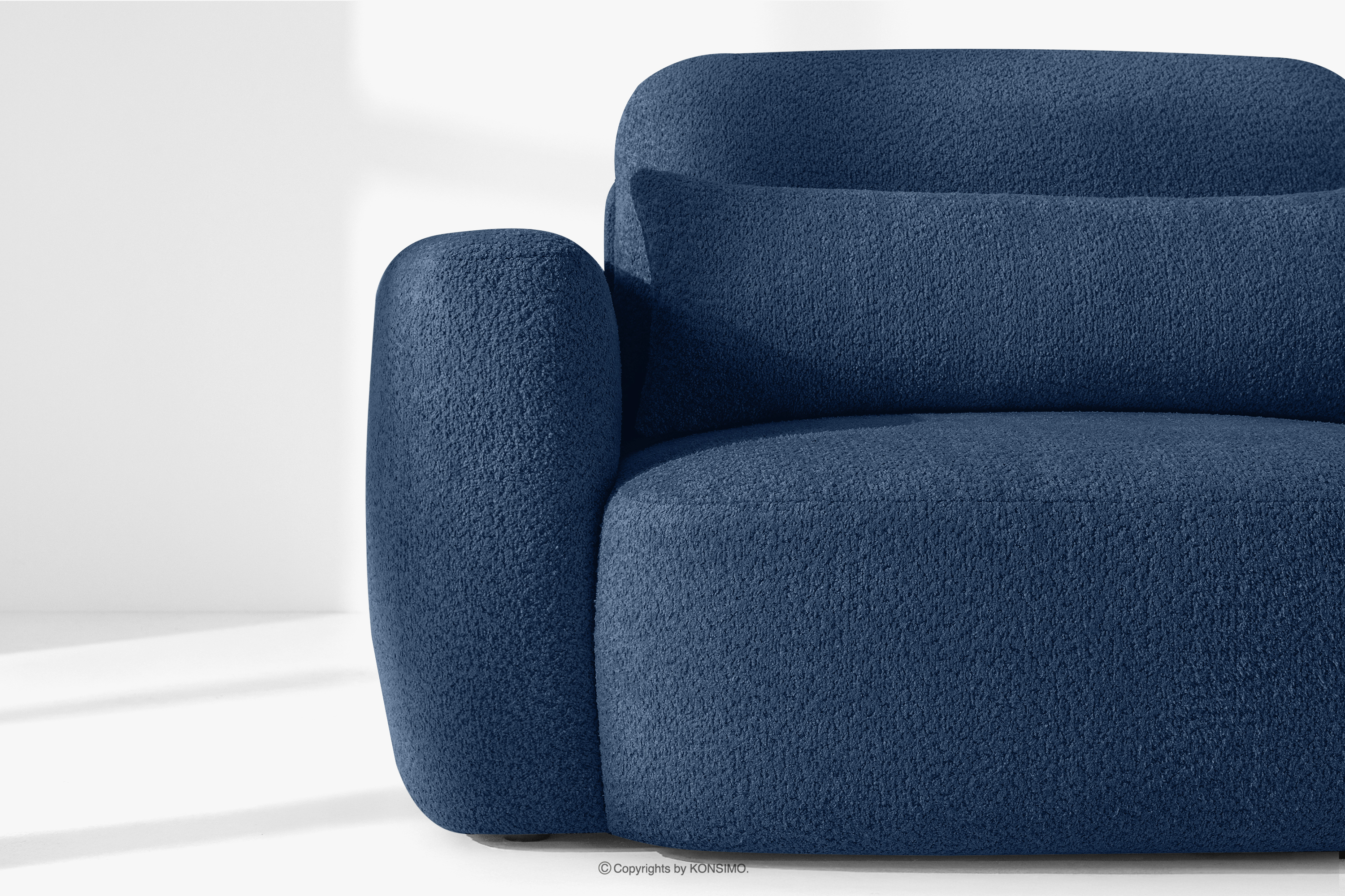 Sessel im japanischen Stil aus dunkelblauem Bouclé-Stoff revolutioniert das Konzept der Erholung. Das Herzstück ist ein innovativer Sitz, dessen einzigartige, gewölbte Halbmondform nicht nur ein Blickfang ist, sondern vor allem unvergleichlichen Komfort bietet. Dank der Verwendung von B-Wellenunterfederungen und hochwertigem HR30-Schaumstoff ist der Sitz mittelhart und gleichzeitig äußerst elastisch und weich.