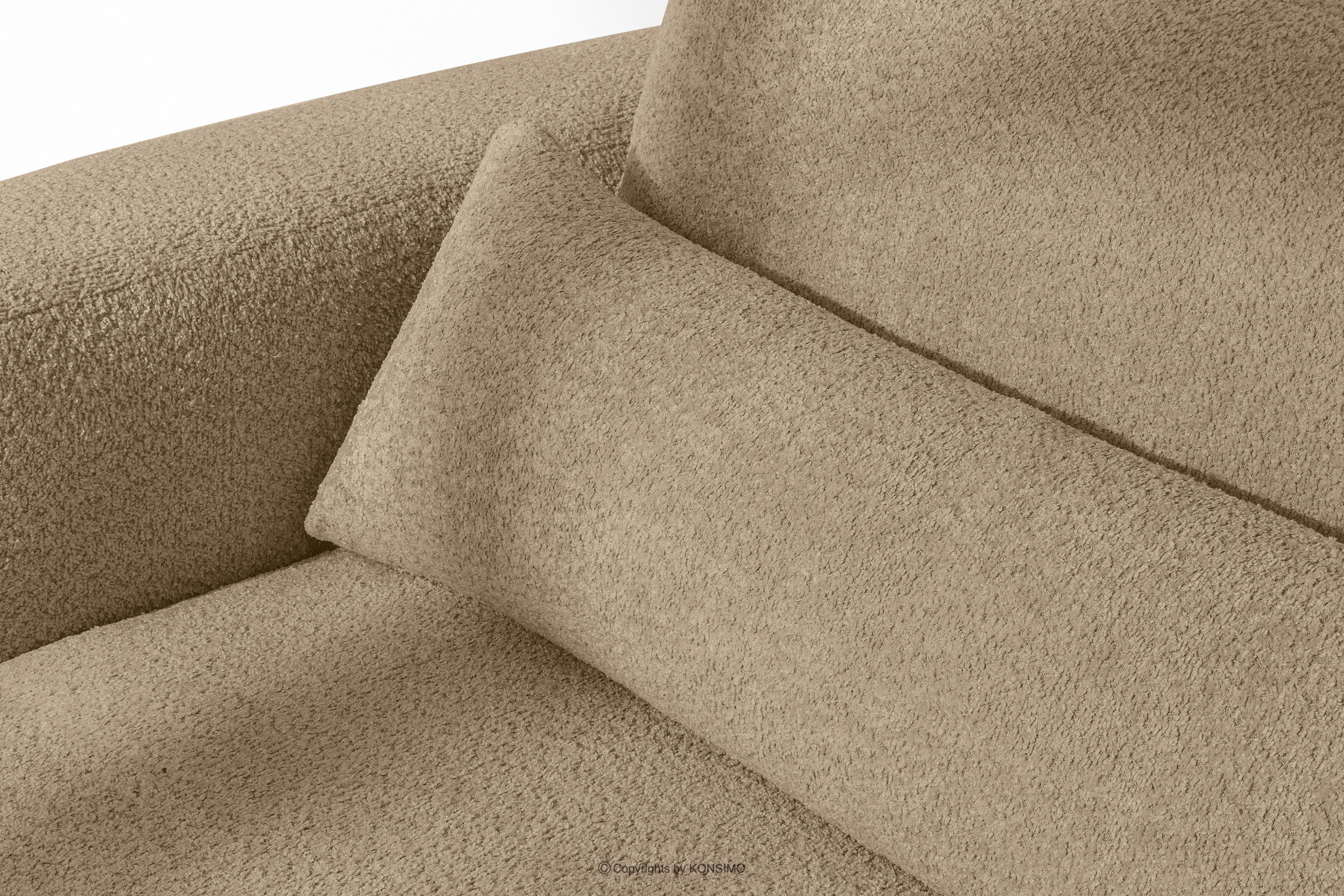 Japandi-Ecksofa aus Bouclé-Stoff, rechts, beige revolutioniert das Konzept der Erholung. Das Herzstück ist ein innovativer Sitz, dessen einzigartige, gewölbte Halbmondform nicht nur ein Blickfang ist, sondern vor allem unvergleichlichen Komfort bietet. Dank der Verwendung von B-Wellenunterfederungen und hochwertigem HR30-Schaumstoff ist der Sitz mittelhart und gleichzeitig äußerst elastisch und weich. Diese Kombination garantiert eine perfekte Anpassung an die Körperform, minimiert Druckpunkte und sorgt für Entspannung auf höchstem Niveau.