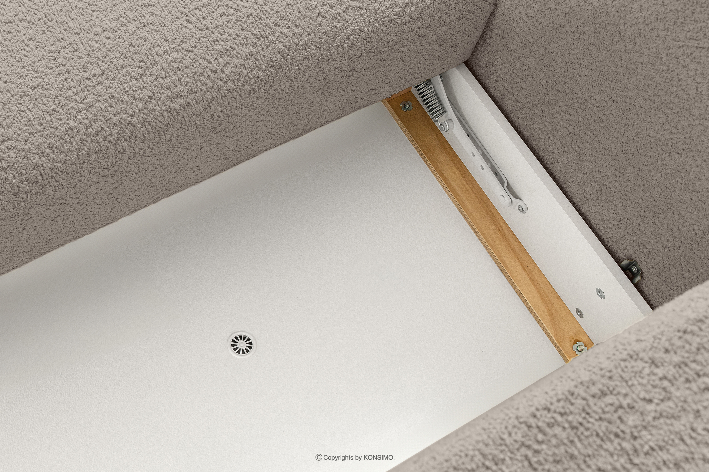 Rechte Ecksofa und Sessel im Japandi-Stil Bouclé grau revolutioniert das Konzept der Erholung. Das Herzstück ist ein innovativer Sitz, dessen einzigartige, gewölbte Halbmondform nicht nur ein Blickfang ist, sondern vor allem unvergleichlichen Komfort bietet. Dank der Verwendung von B-Wellenunterfederungen und hochwertigem HR30-Schaumstoff ist der Sitz mittelhart und gleichzeitig äußerst elastisch und weich.