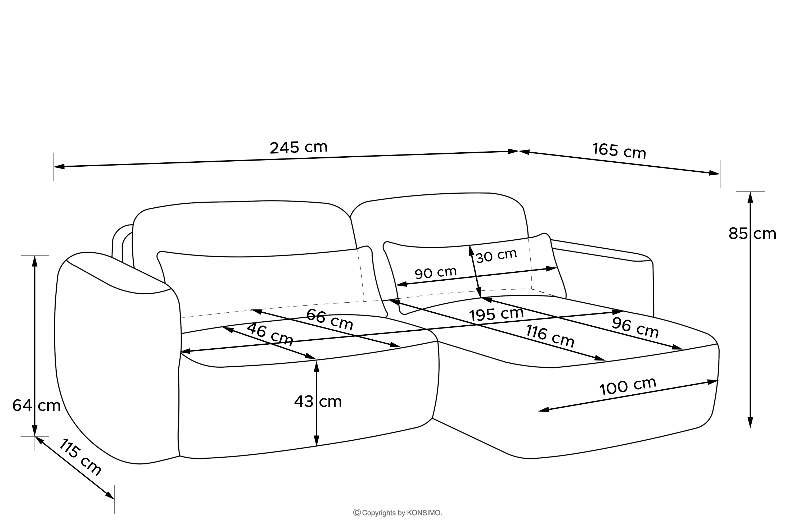 - Sitzfläche (cm): 245x85x115