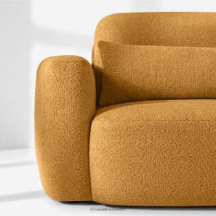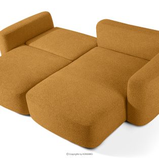 Rechte Ecksofa und Sessel im japanischen Stil Bouclé honigfarben revolutioniert das Konzept der Erholung. Das Herzstück ist ein innovativer Sitz, dessen einzigartige, gewölbte Halbmondform nicht nur ein Blickfang ist, sondern vor allem unvergleichlichen Komfort bietet. Dank der Verwendung von B-Wellenunterfederungen und hochwertigem HR30-Schaumstoff ist der Sitz mittelhart und gleichzeitig äußerst elastisch und weich.